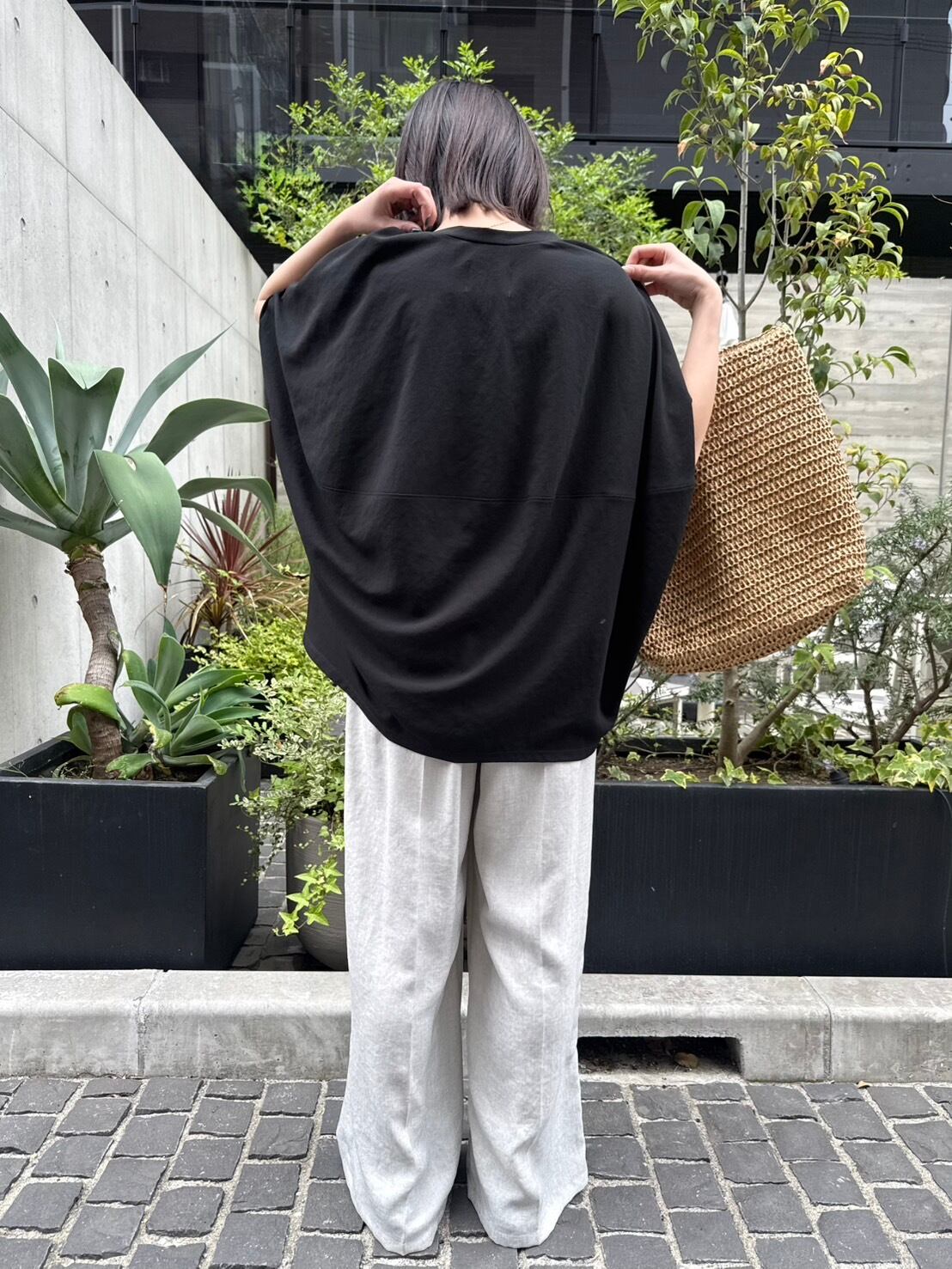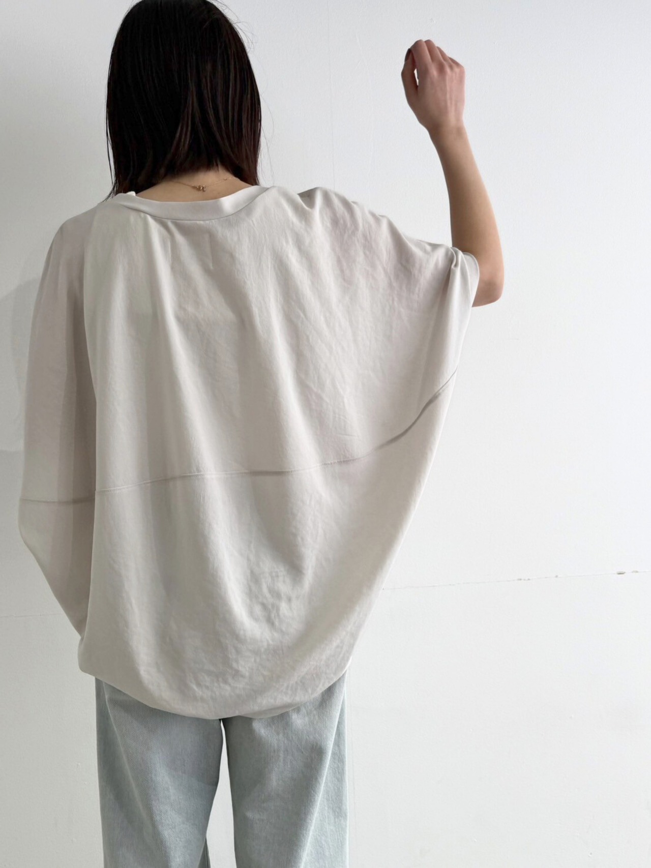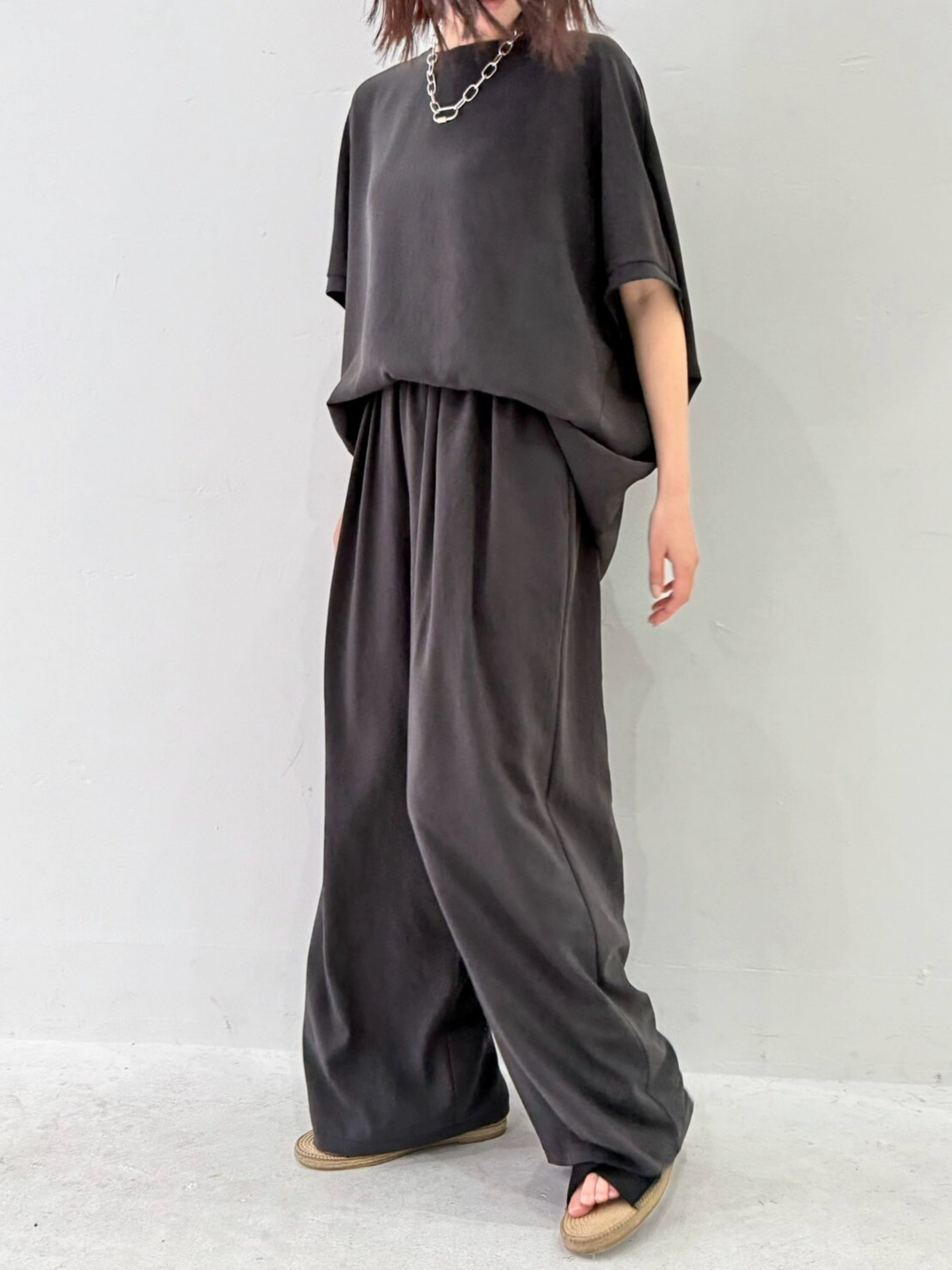 ドルマンスリーブのコクーンプルオーバー。きめ細かな表情とソフトな⾵合いで伸縮性に優れたジョーゼット素材を使⽤。⼆の腕をカバーでき、華奢⾒えするシルエットに❣️ジャージのような⾵合いとストレッチ性で着⼼地も抜群!ドルマンスリーブはこの時期気になる汗染みも気になりづらいのも嬉しいですね!シワになりづらくイージーケアなのもポイント◎