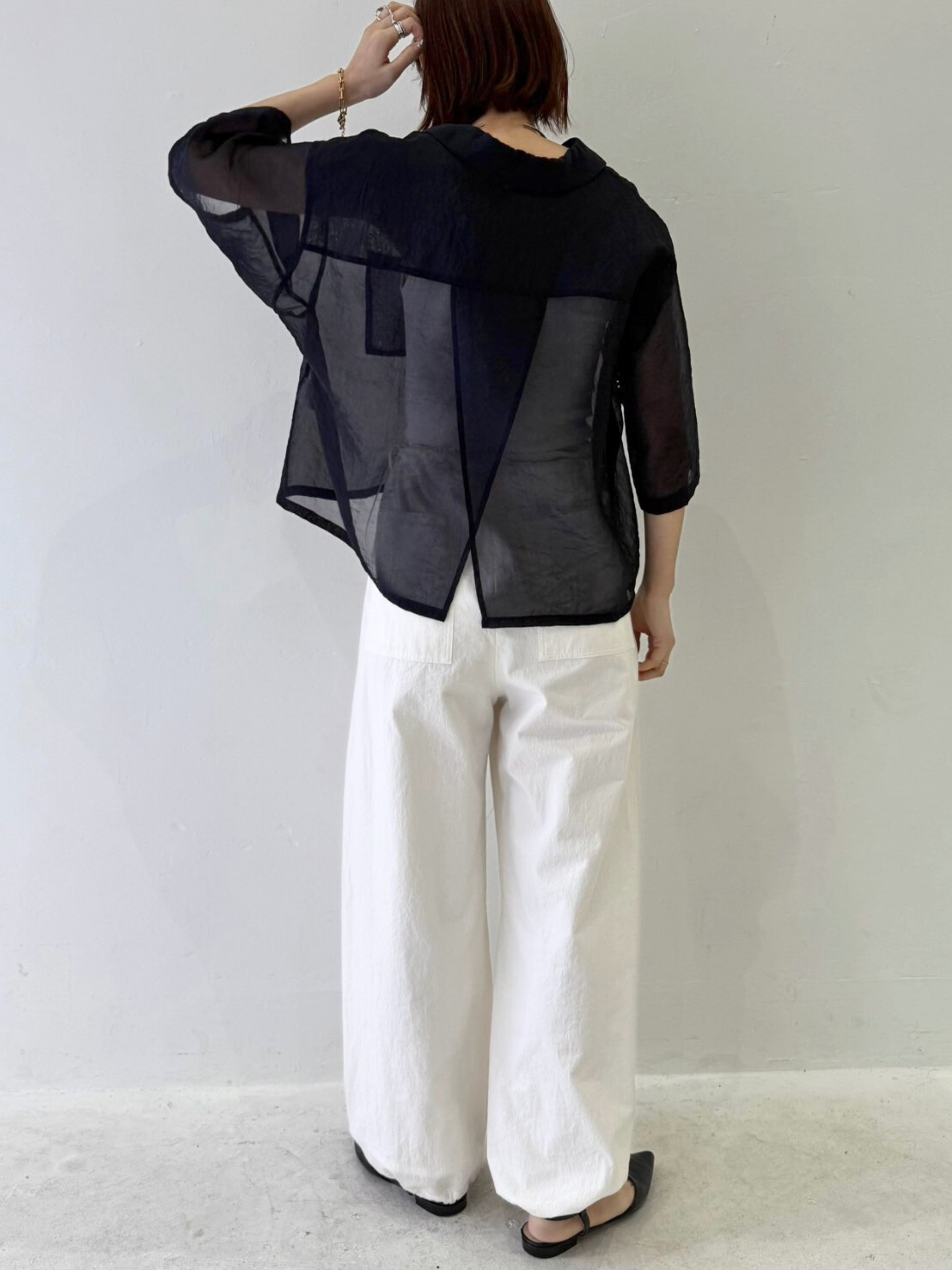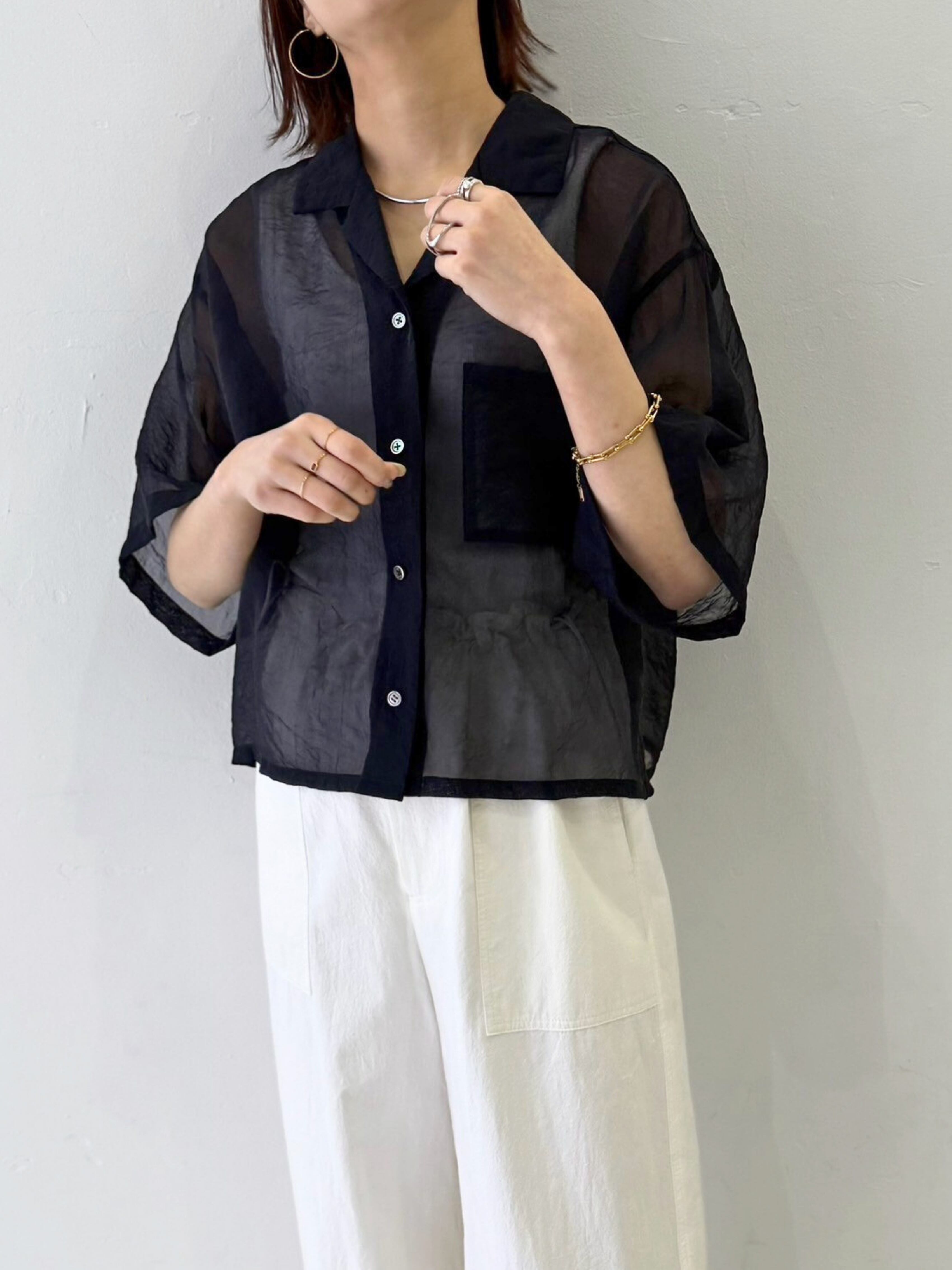 程よいシアー感が⼤⼈⾒えするショートシャツ。後ろにスリットが入っており、他には無いデザインが目を惹きます。適度なハリとキュプラの上品なツヤでカジュアルなアイテムながらキレイめの仕上がり。肌離れも良い素材で夏でも涼しく着ていただけます。シワになりづらくイージーケアなのも嬉しいポイント。