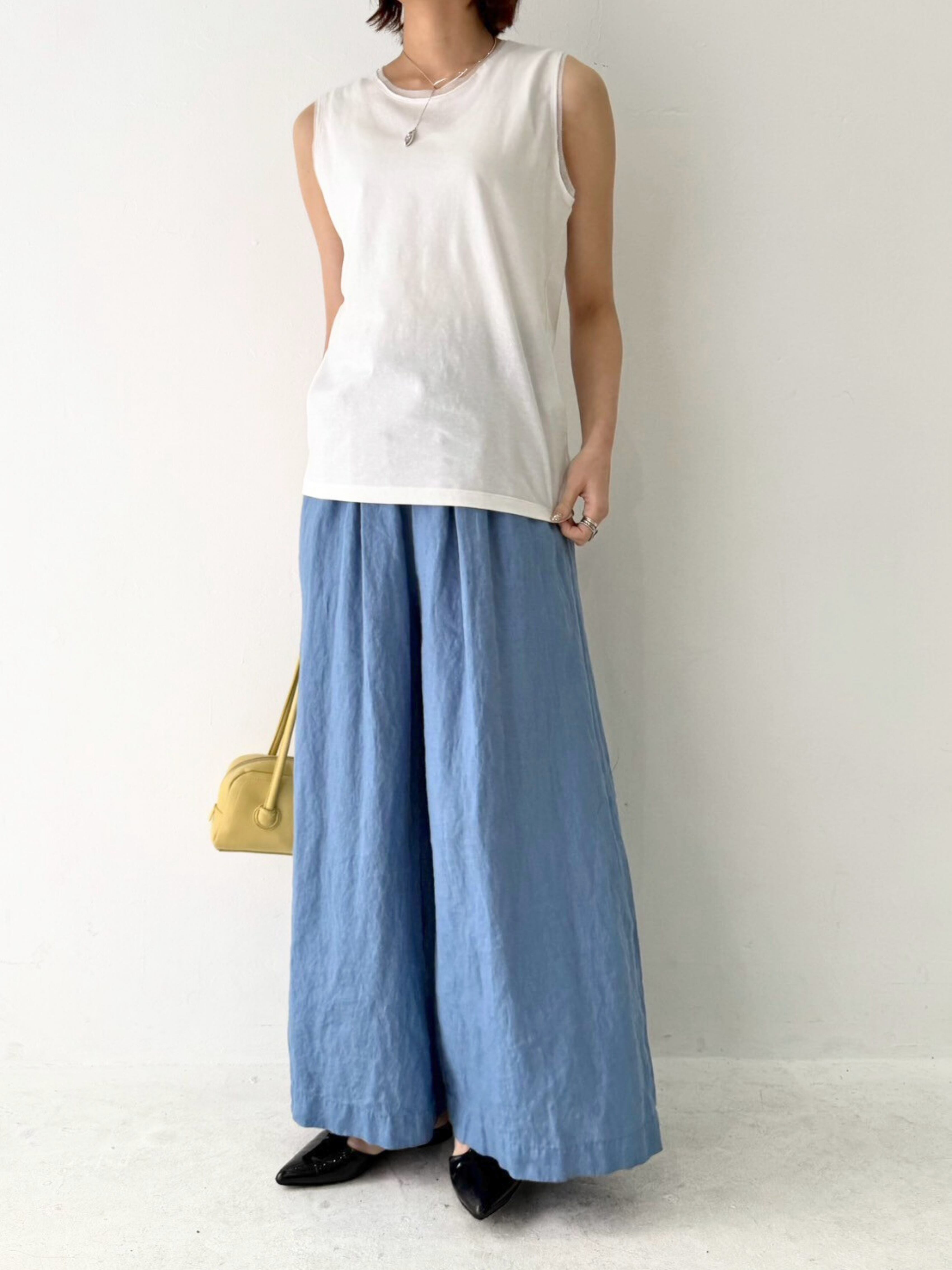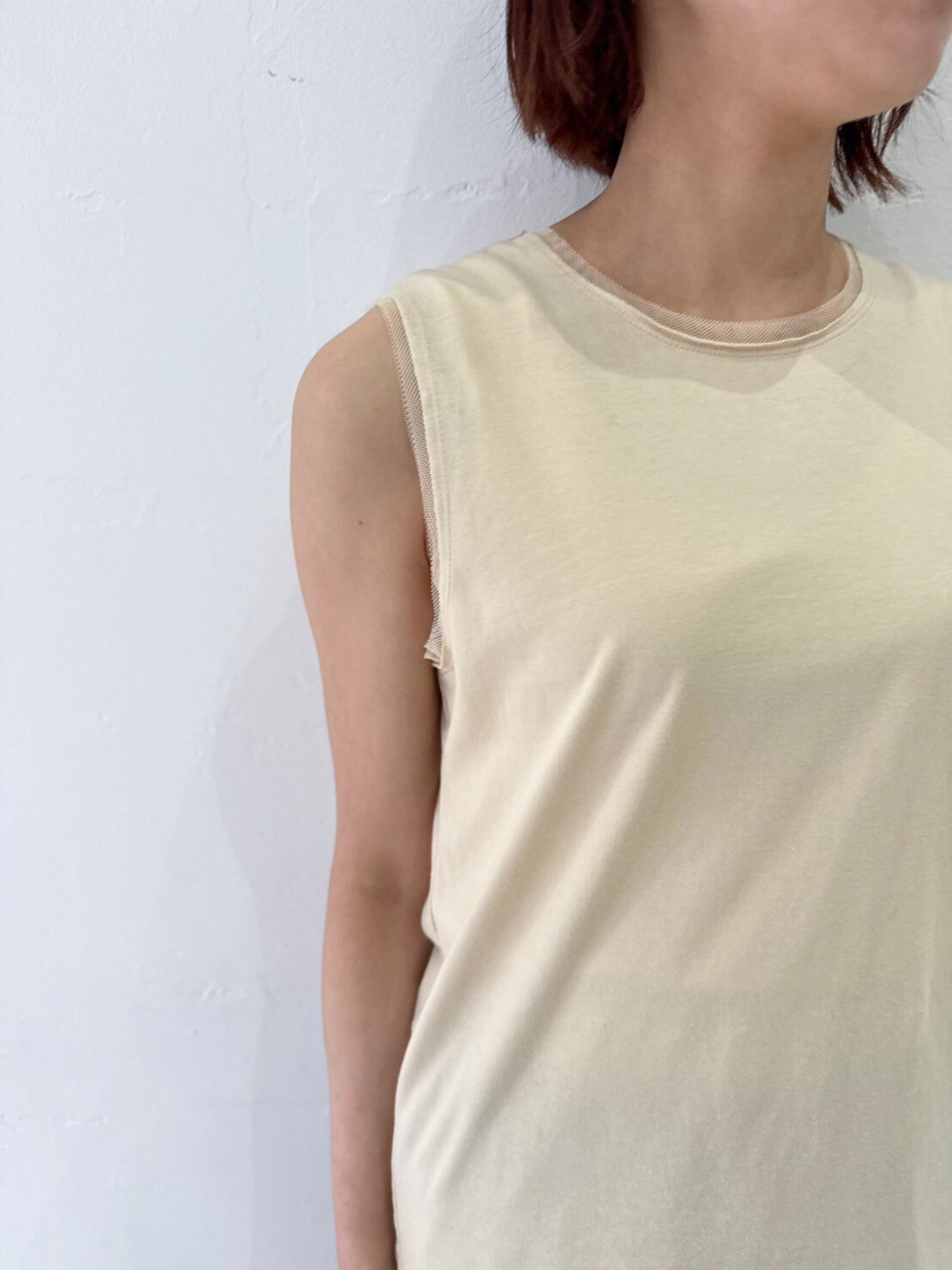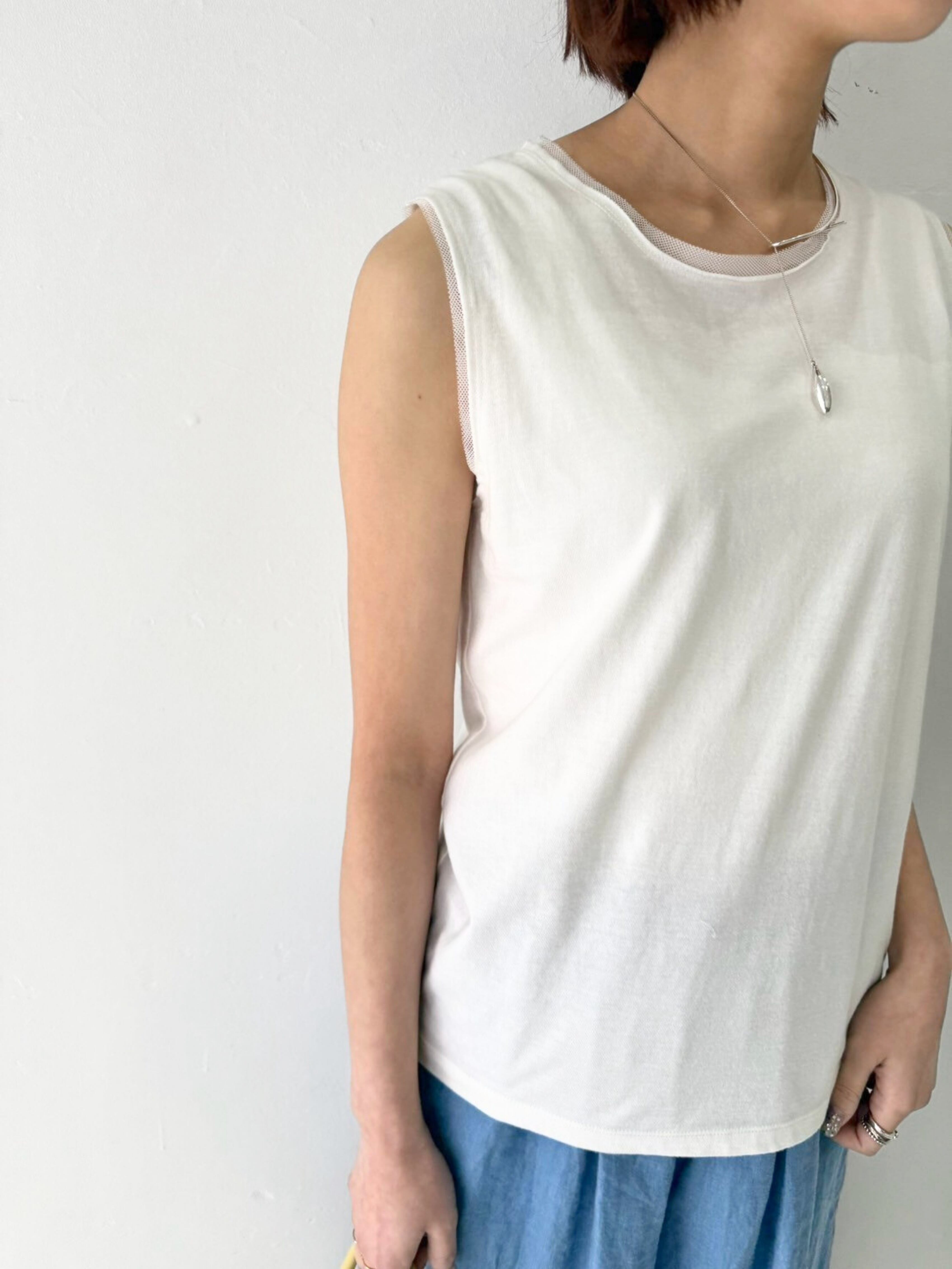 ネックと袖⼝に透け感のあるチュール⽣地を使⽤したタンクトップ。cafuneのアウターやシャツなど、インナーとしてとっても相性の良い一枚。チュールの部分がさり気ないポイントになってくれるのでアウターなどを着脱した際に物寂しくなりません✨使いやすいお色味とお手頃な価格のため、この夏に持っておきたいアイテムの一つです◎