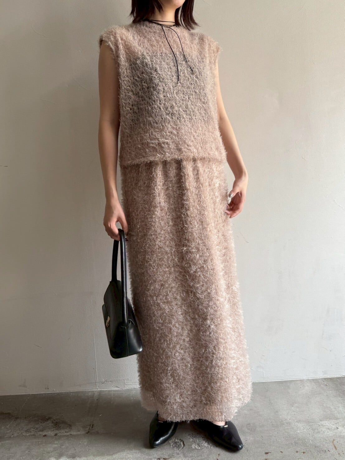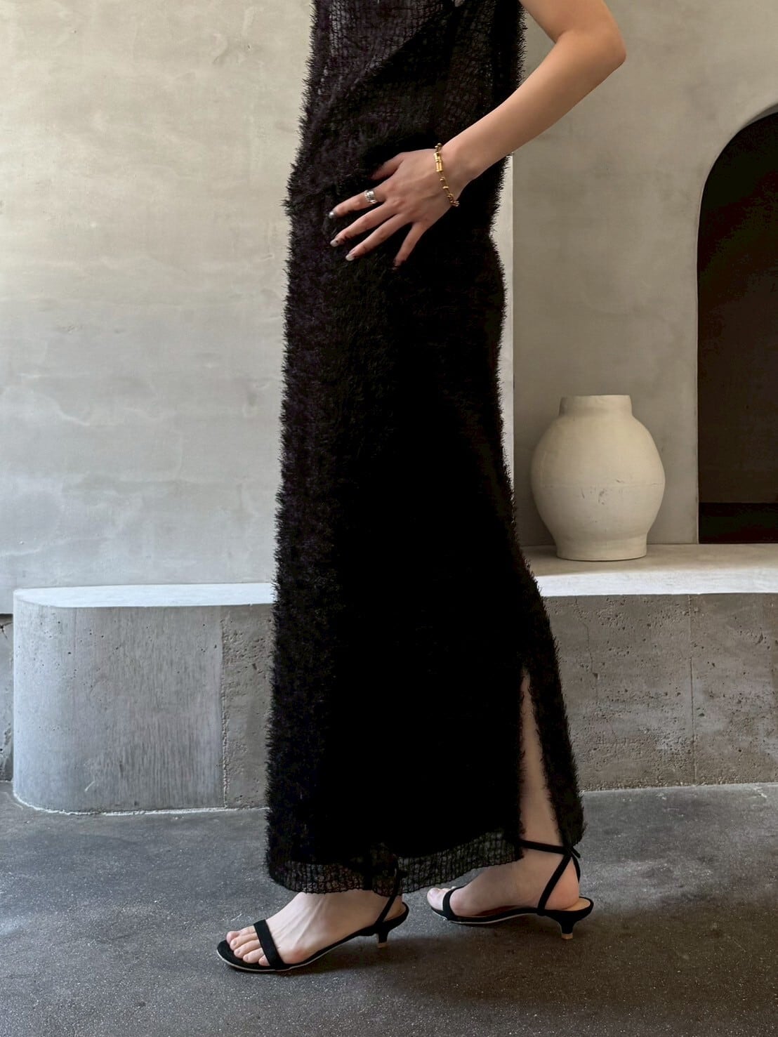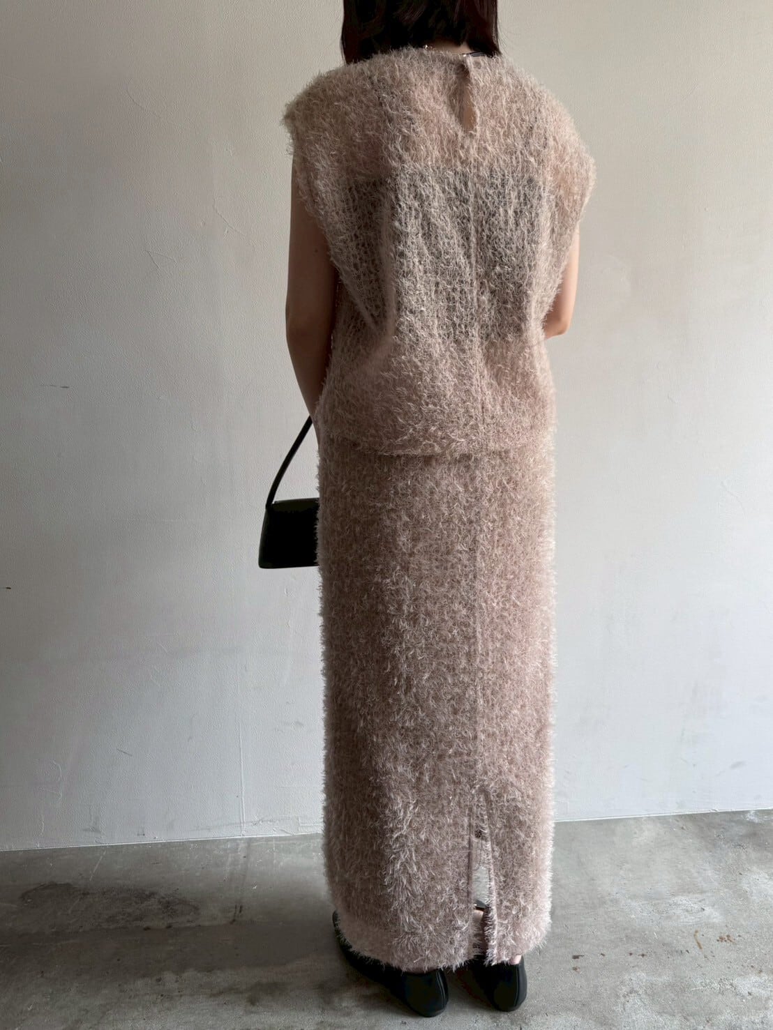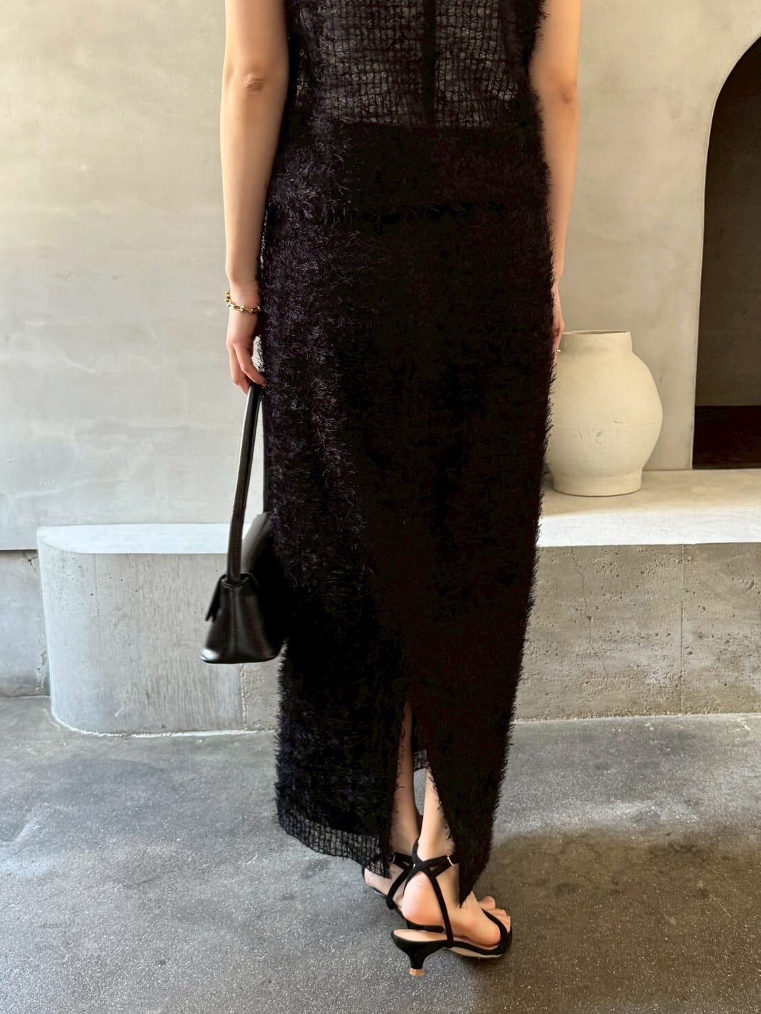 ふわふわの毛足が可愛いチュールにフェザーを編み込んで、軽やかで涼しげなシアー感がポイント✧暑い季節でも快適に楽しめるタイトシルエットです。ストレッチ入りで動きやすさもバッチリ◎裾のスリットが抜け感をプラスして、女性らしい軽やかな足さばきを叶えます‧₊˚