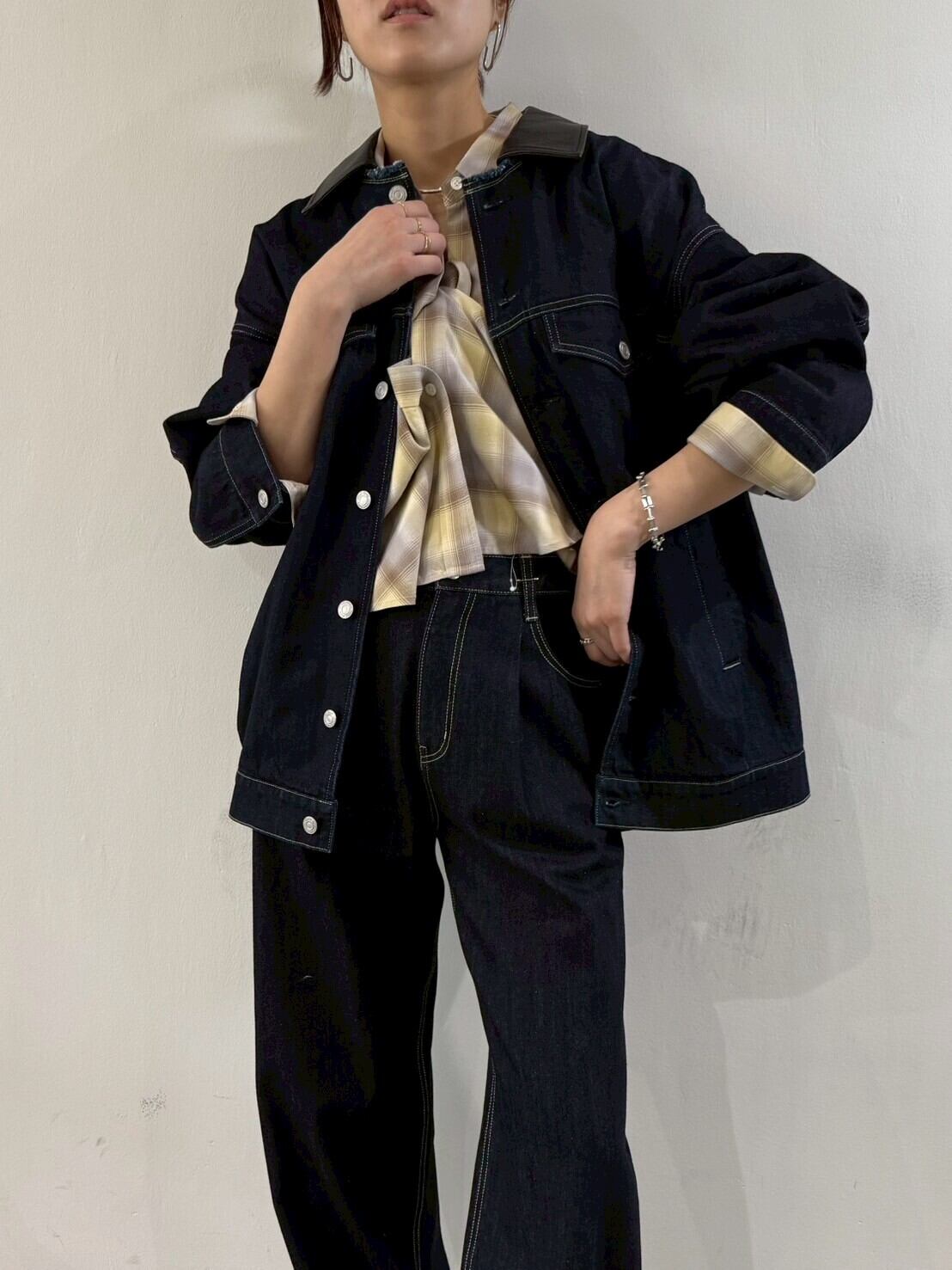 取り外し可能なレザー調の襟で、ノーカラーにもカットオフにもなるお洒落な2WAY仕様✨ゆったりワイドシルエットなのに、オチ感のある柔らかデニムで軽やかに羽織れちゃいます!