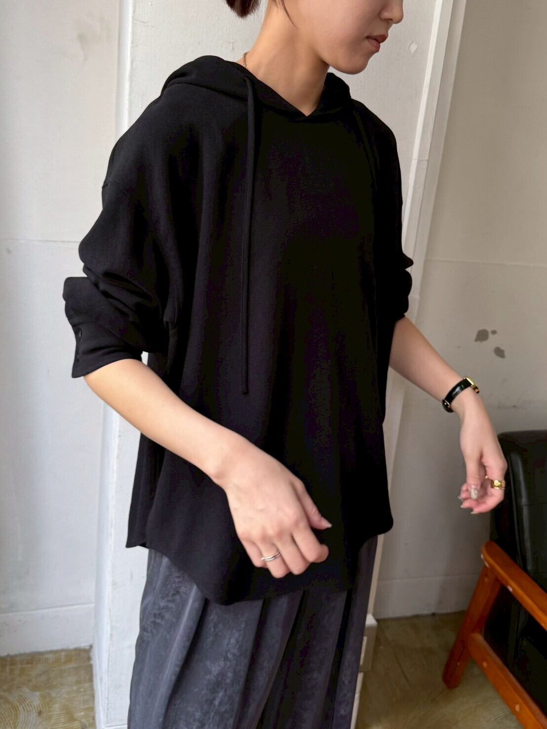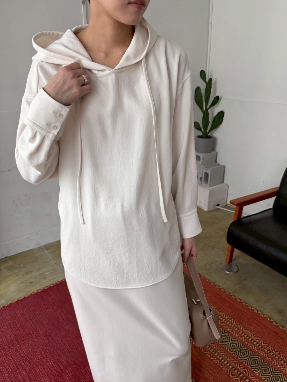 歩くたびに揺れる素材感が印象的なフードプルオーバー。