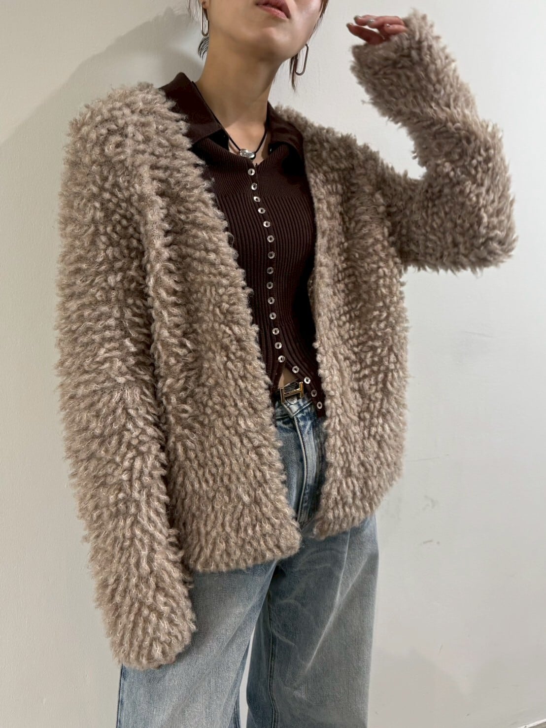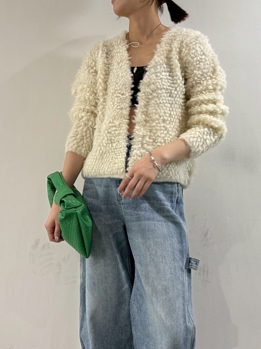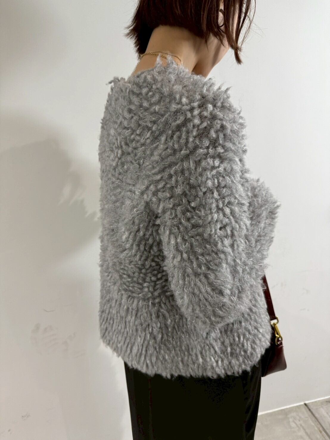 柔らかな糸をループ状に編み立てた、軽やかでふんわりしたタッチのカーディガン。さっと羽織るだけで存在感があり、着こなしのアクセントになる一枚です。
