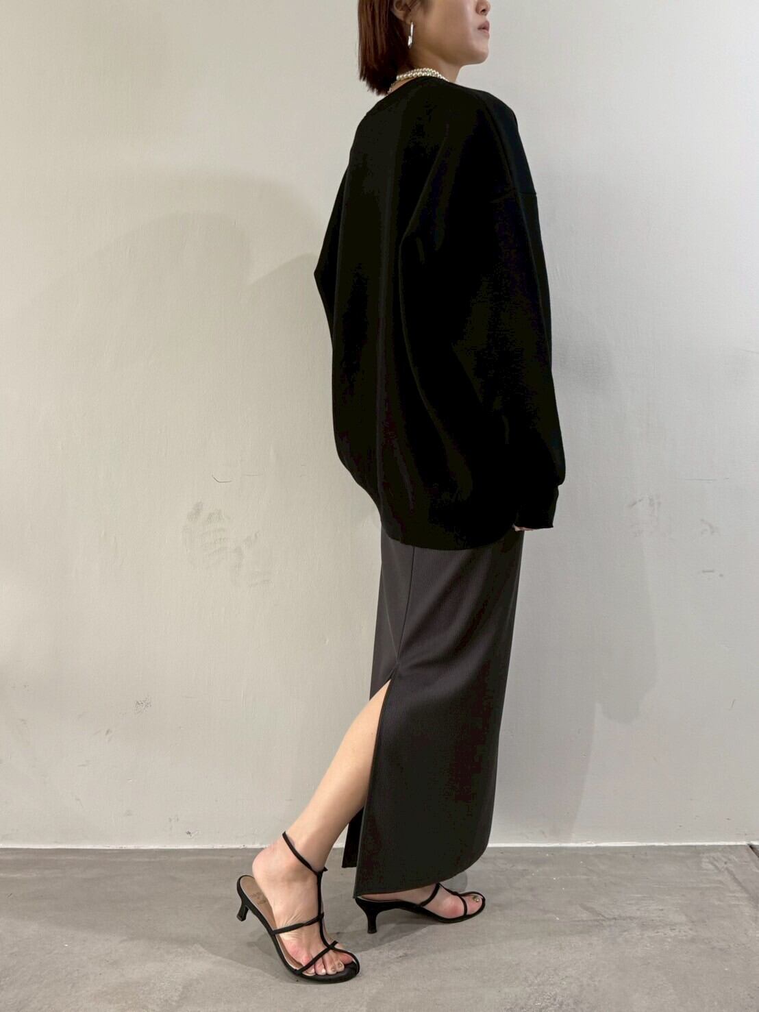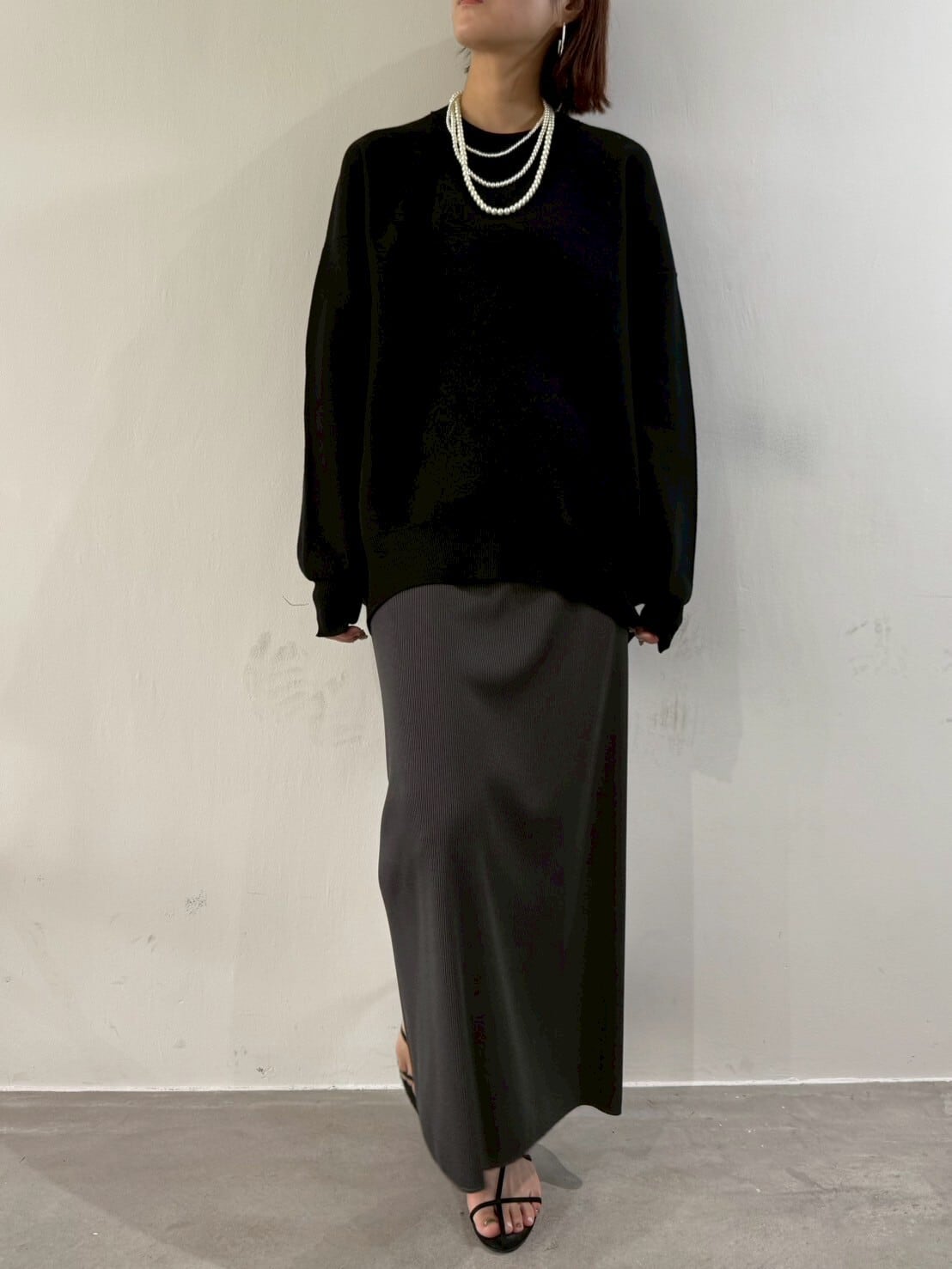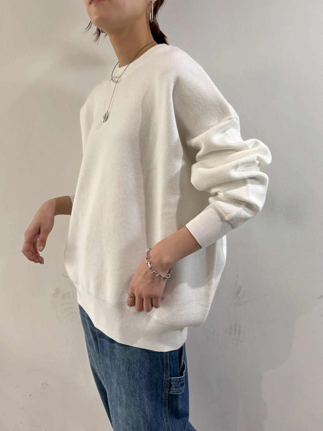 コットン×ポリエステルの糸で編み上げたスウェットみたいな気軽さ、ニットならではの品格✨ふんわりもっちり、でもオチ感が絶妙で、肩まわりはゆったり、全体はスッキリ。肌に触れるとさらっと滑る裏面は、快適ポイント!