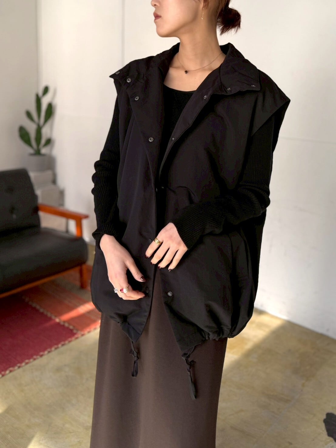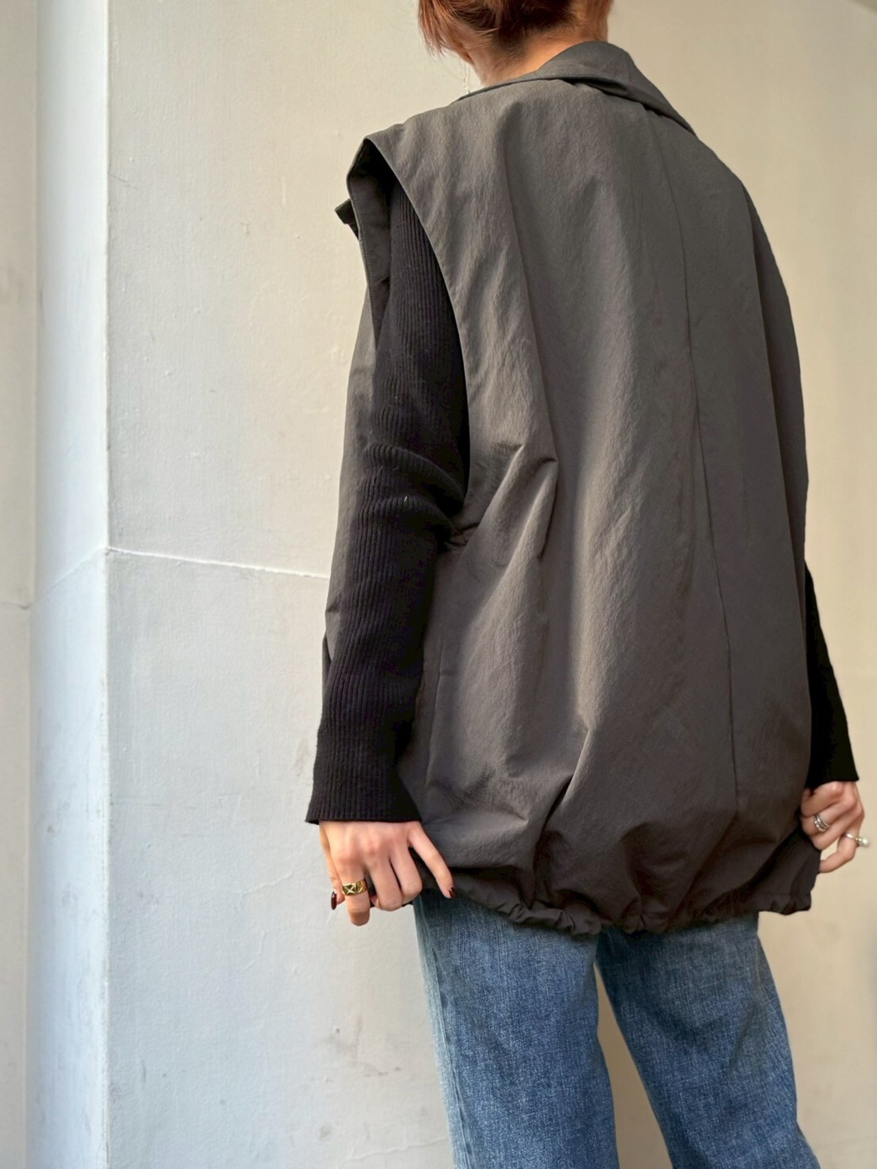 表面感のあるナイロン素材を使用した 軽量中綿ベスト。ラウンドした裾や丸みのあるバックスタイルなど、後ろ姿までおしゃれに見せるこだわりが詰まっています♪