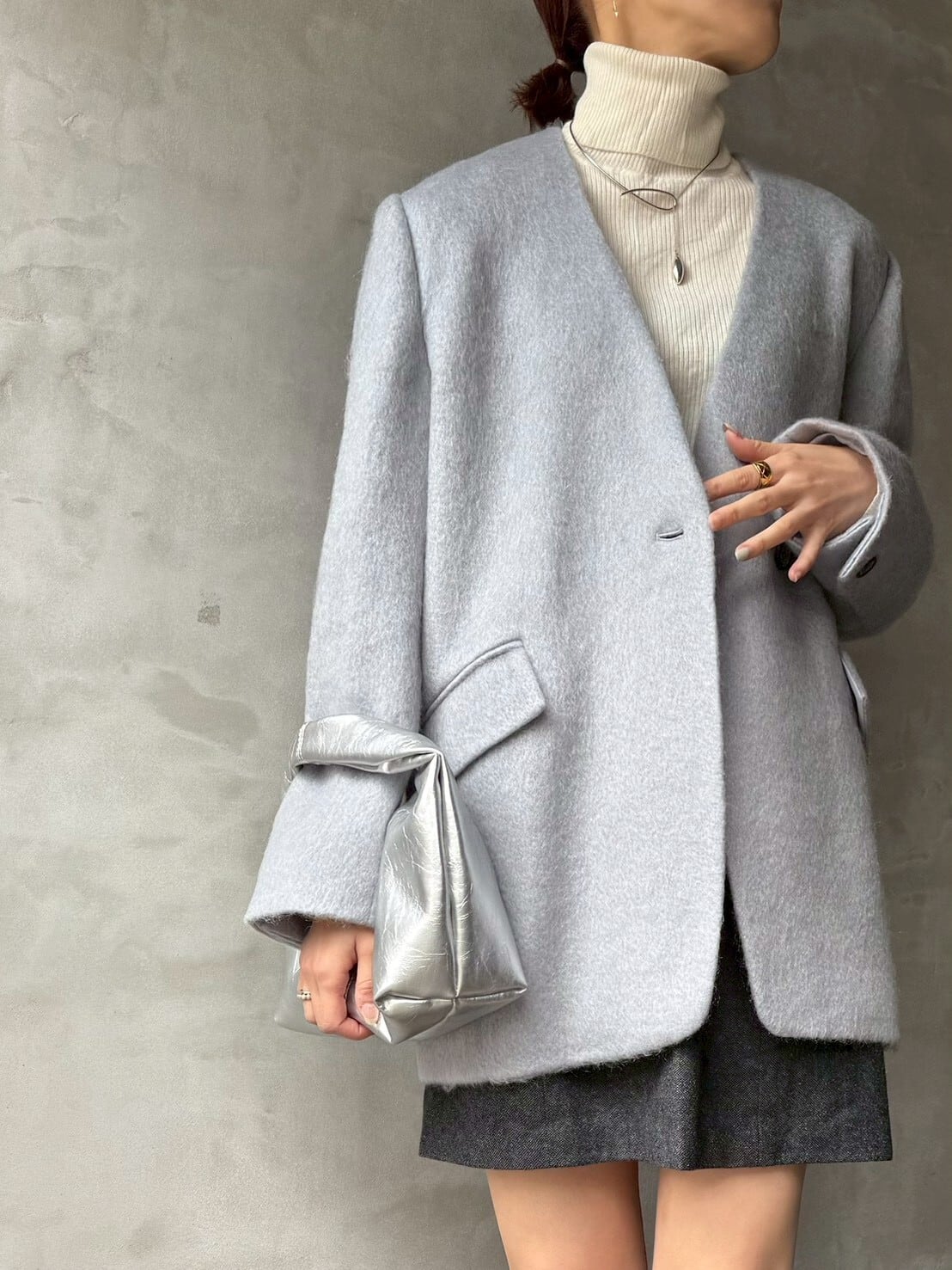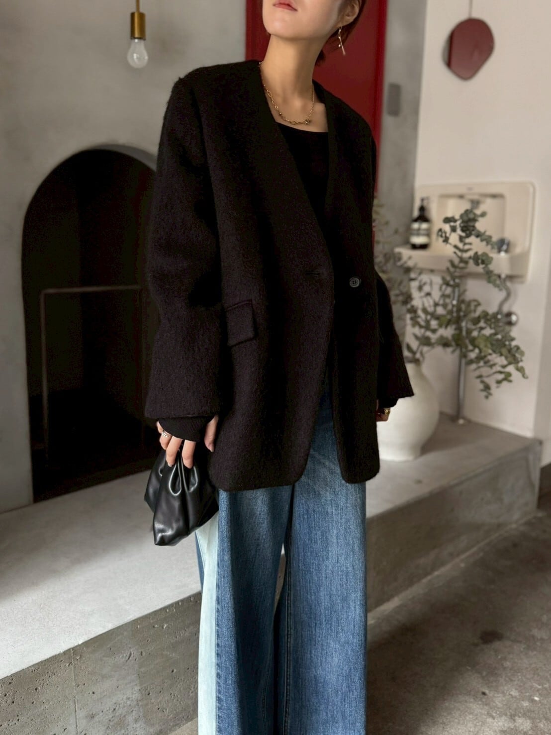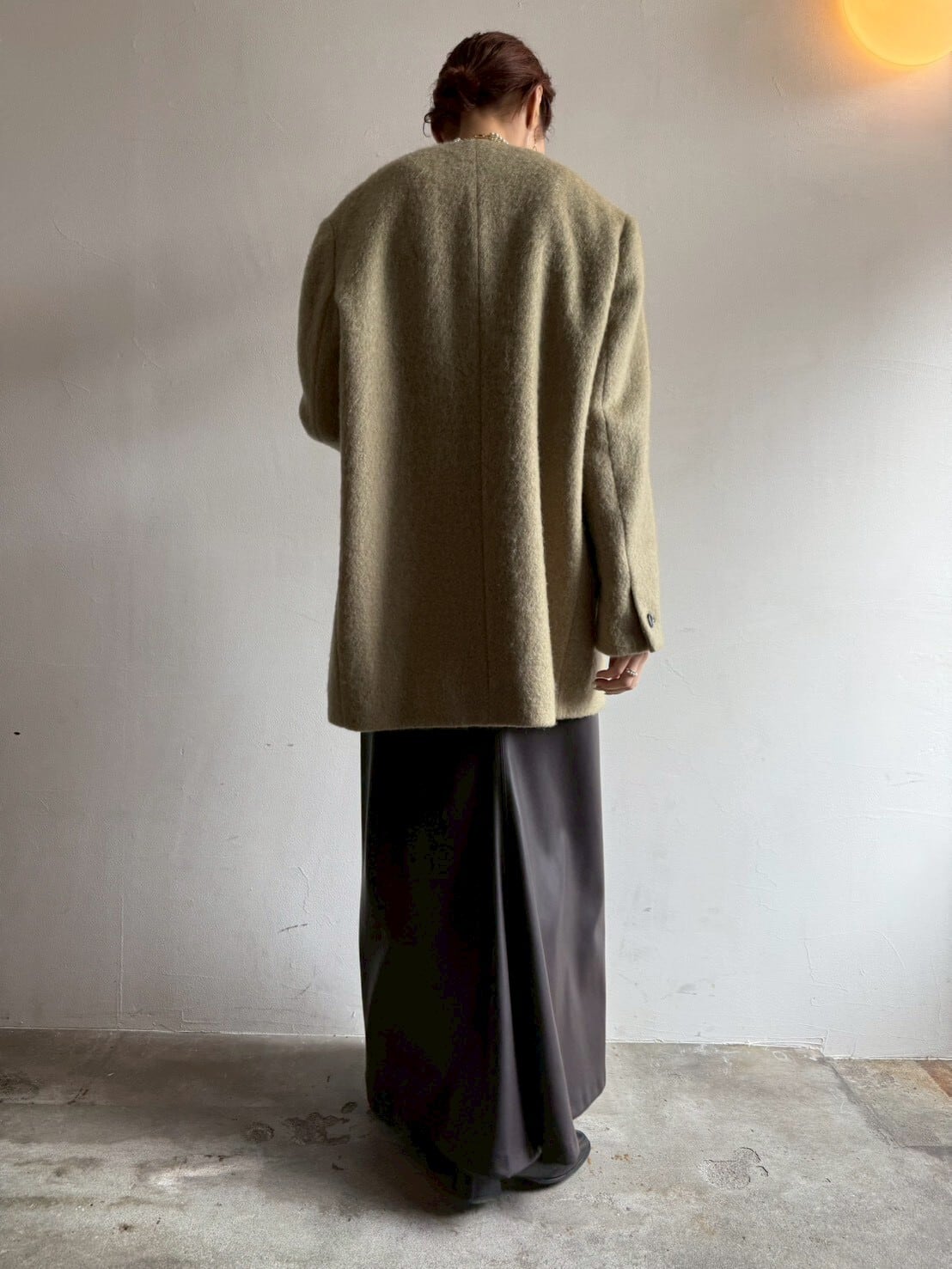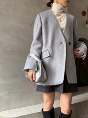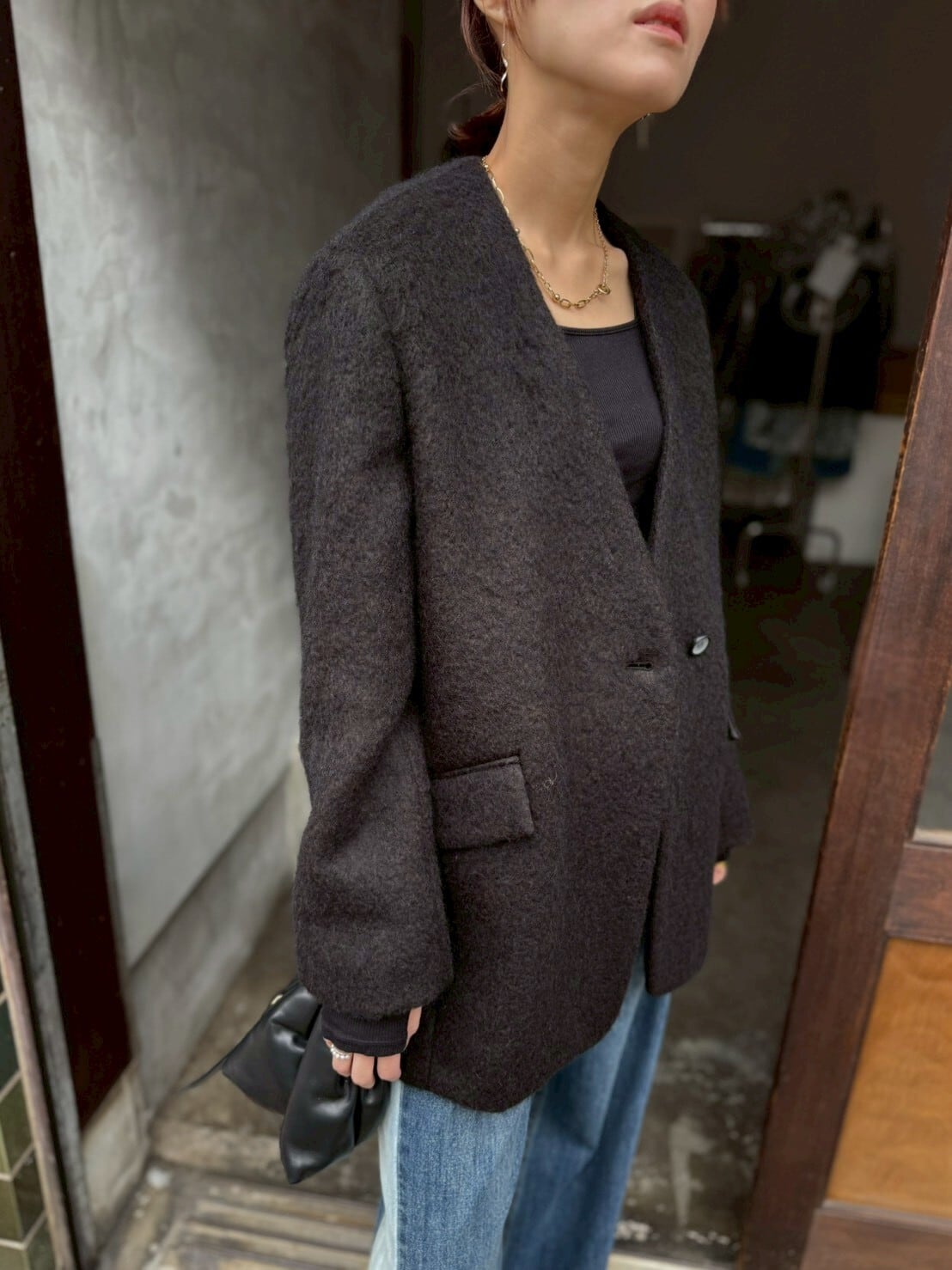 素材は毛足のある 上質なウールモヘアシャギーを使用。見た目は重厚感がありますが、軽量で柔らかく、着心地は快適◎見た目の存在感と軽やかさを両立した、冬のワードローブに加えたい一枚です✨