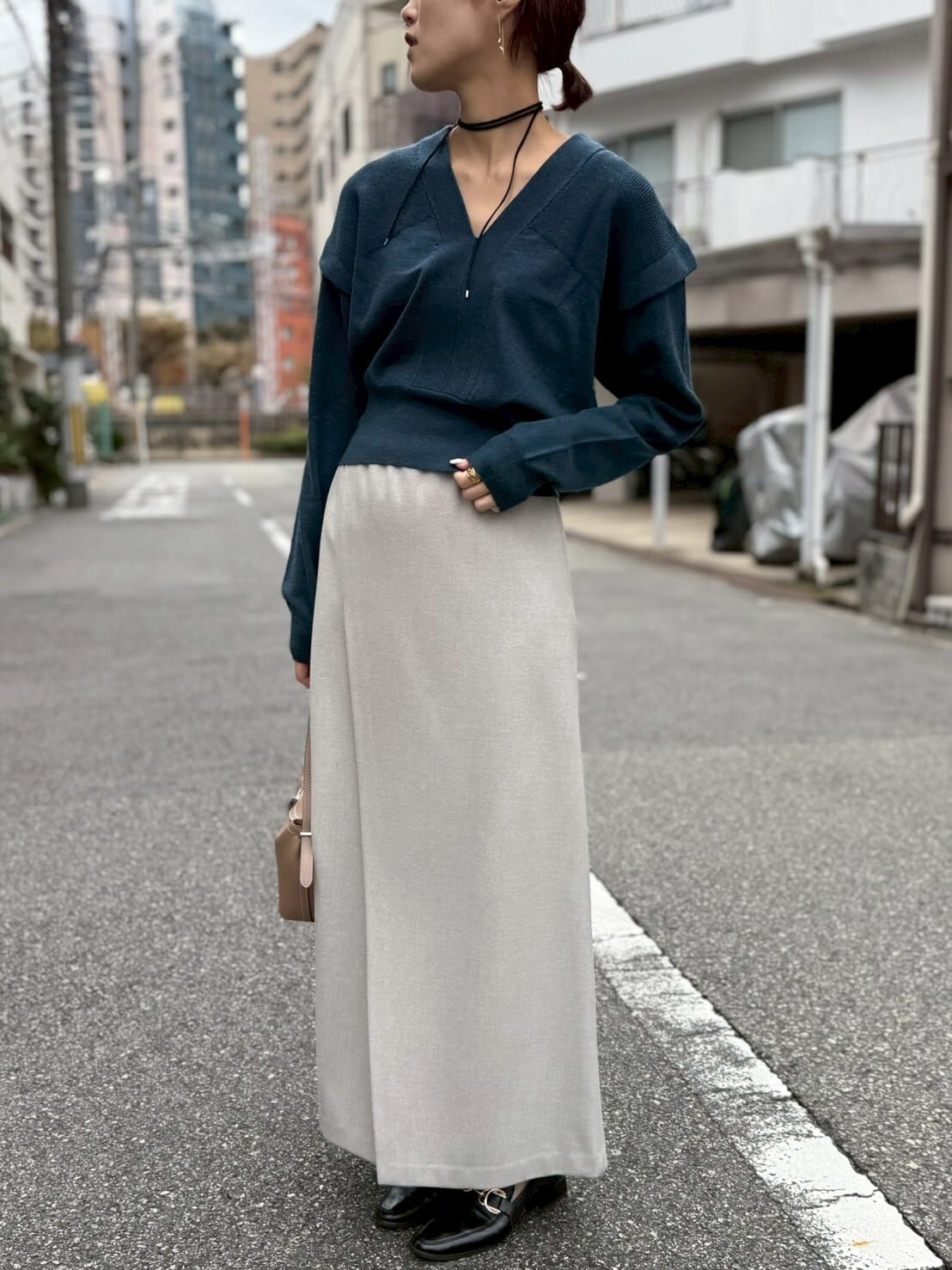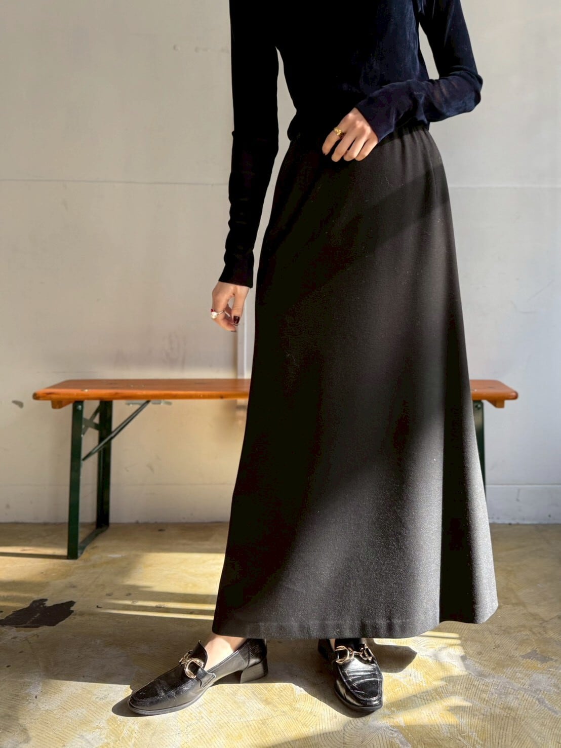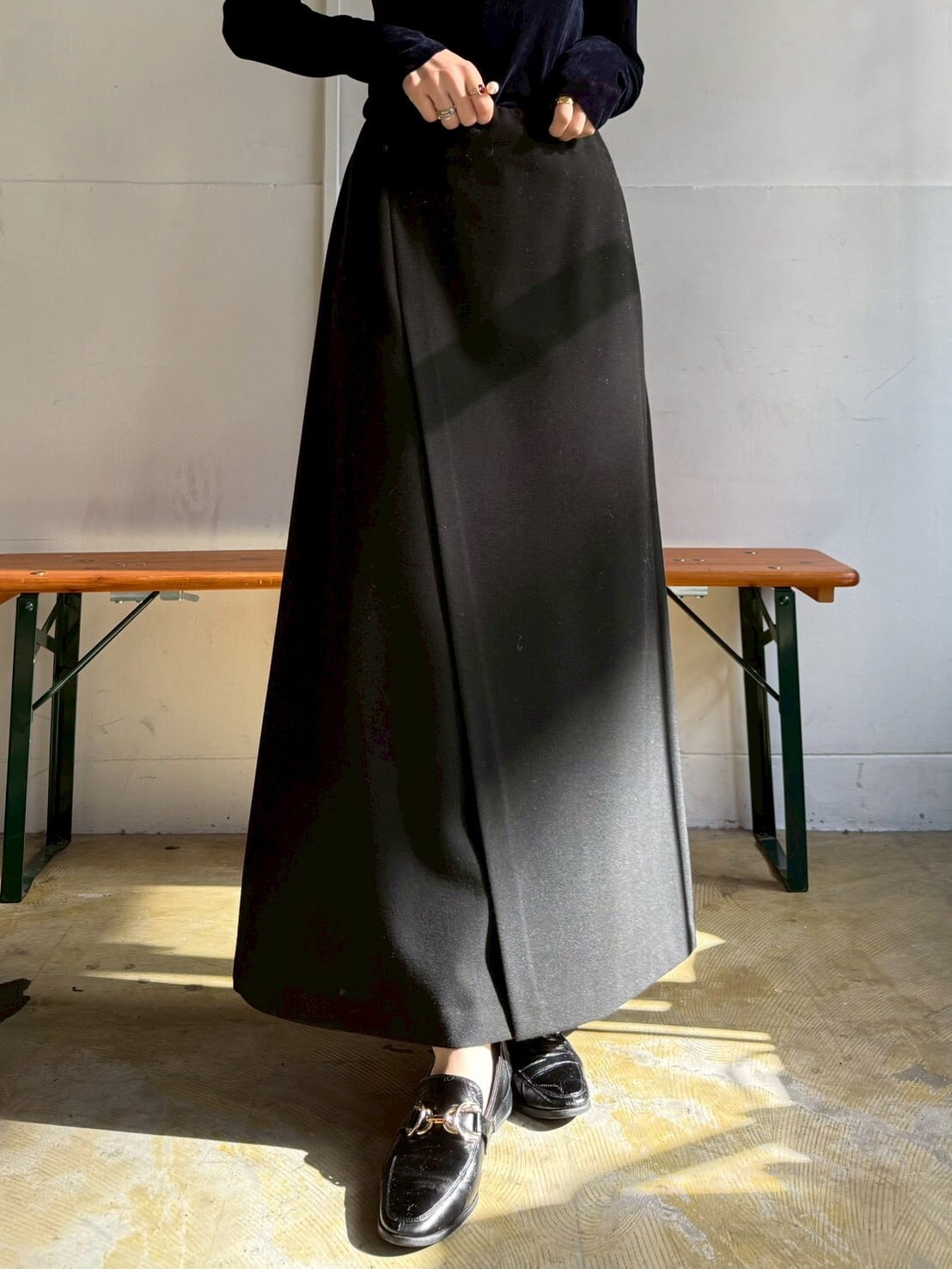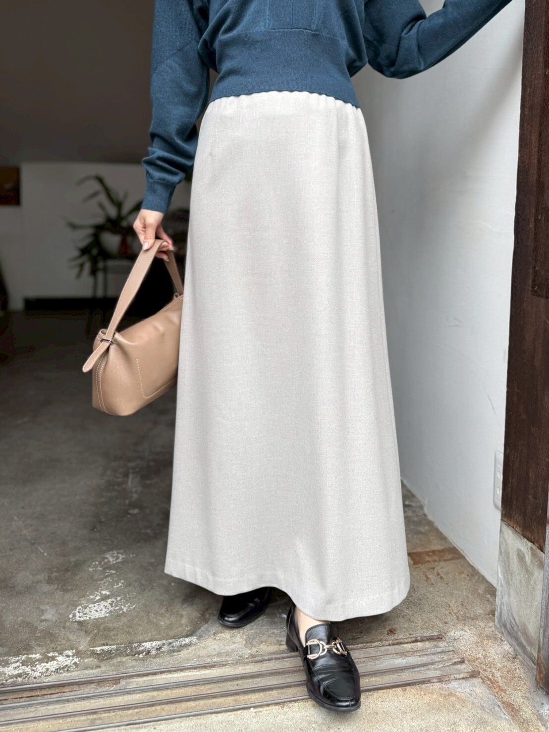 裾に向かって緩やかに広がる 女性らしいシルエット が歩くたび揺れ、ウエスト周りはスッキリしているので トップスをインしたスタイリングも⸝⋆