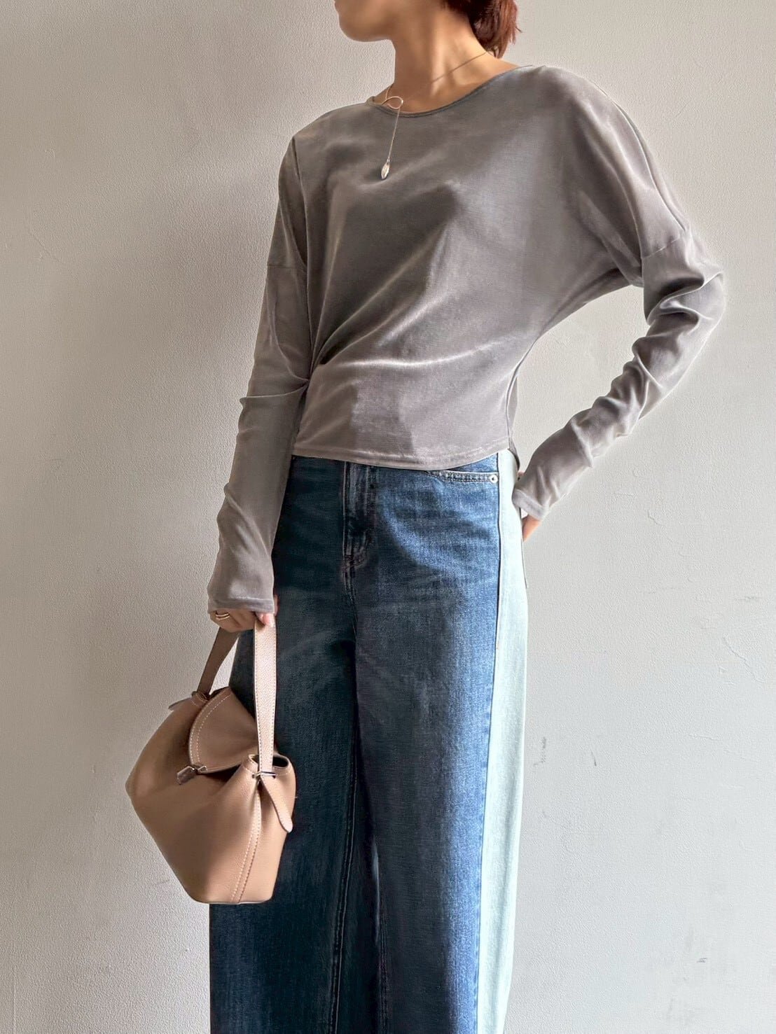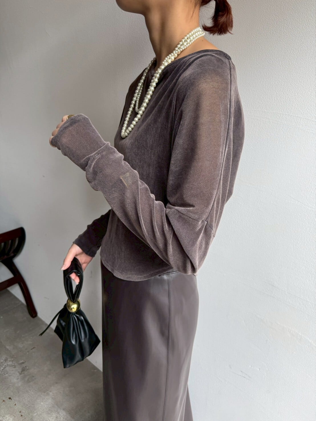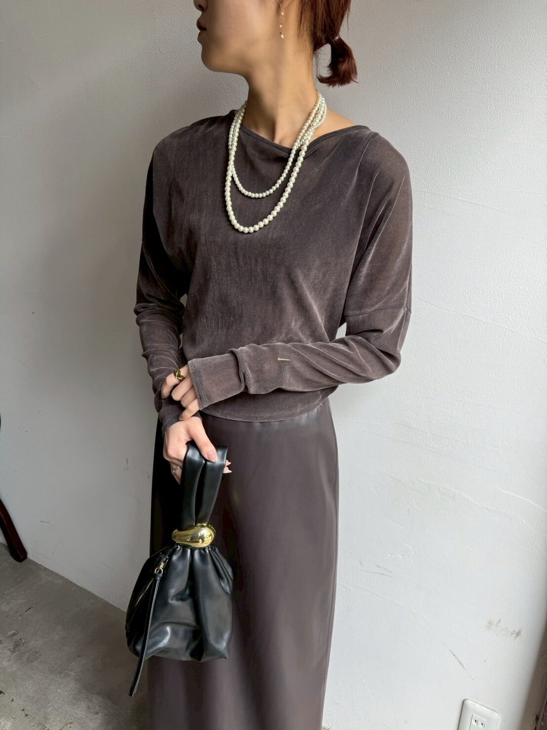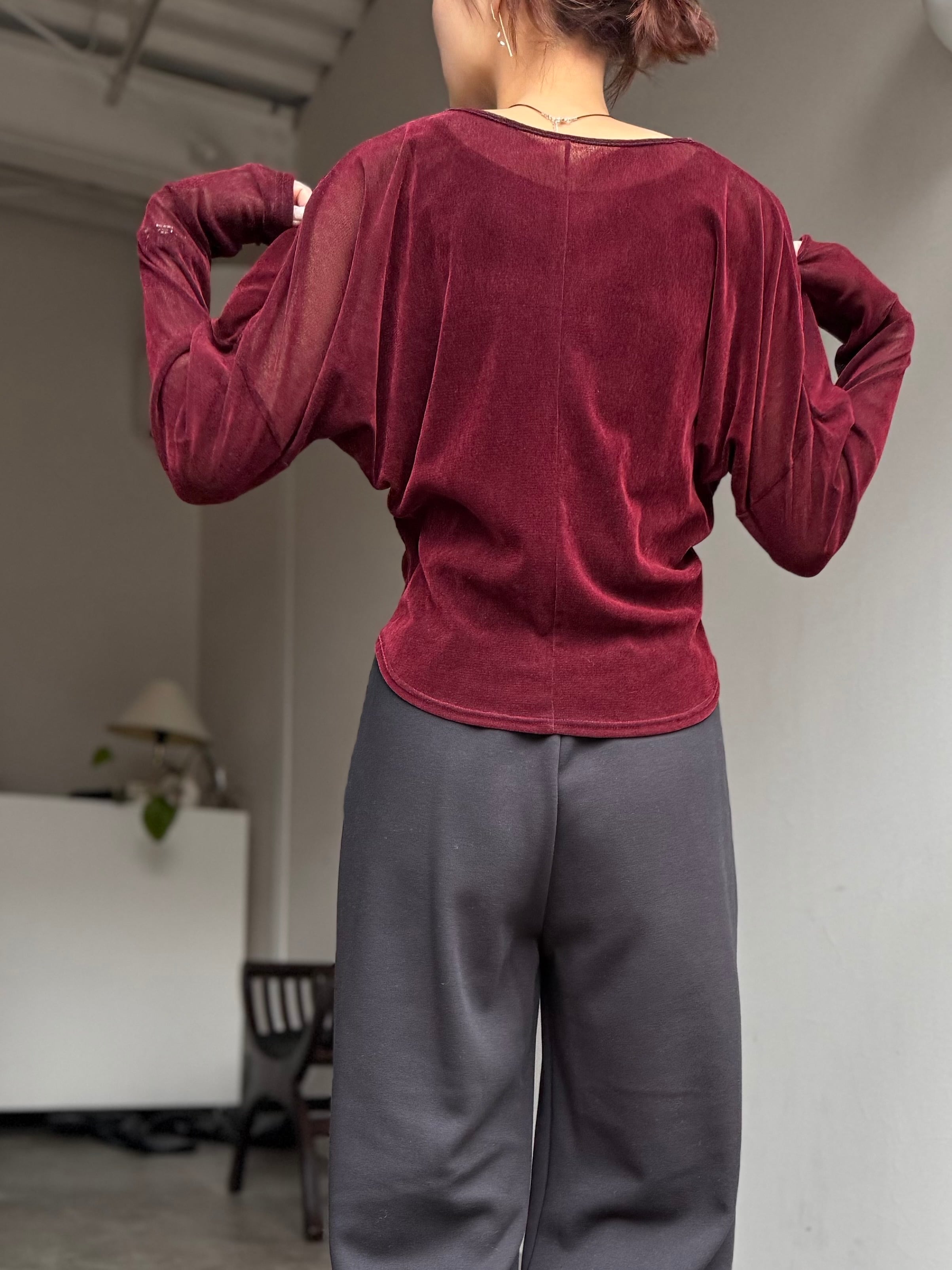 柔らかいチュールにフロッキー加工を施した起毛感ある素材を使用したドルマンスリーブトップス。ゆったりとした身頃と 絶妙な丈感 が特徴で、袖口に向かってピタッと絞ったシルエットが全体のバランスを美しく見せます。