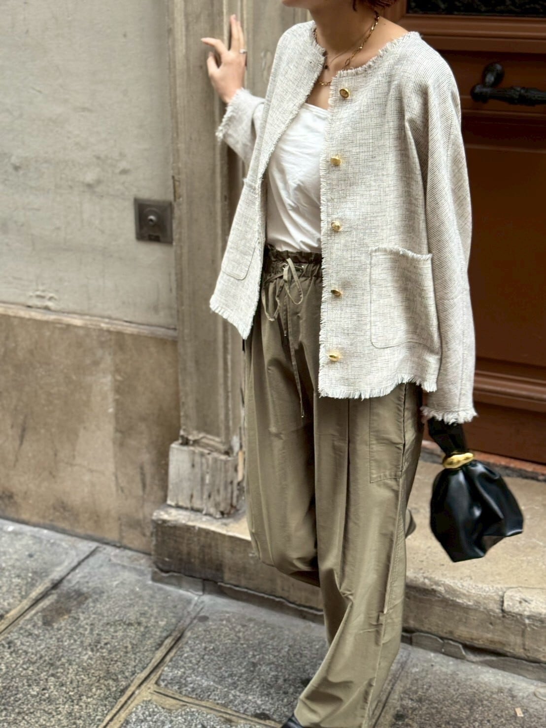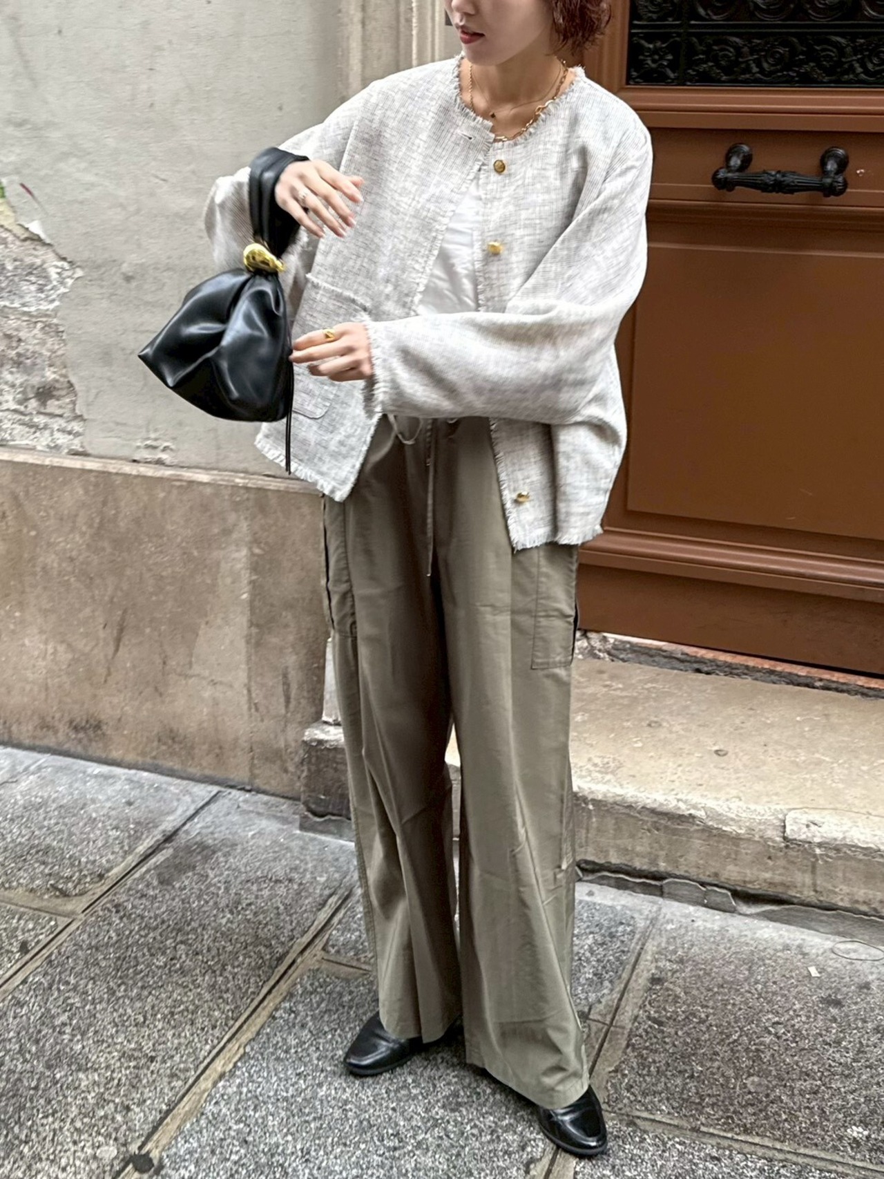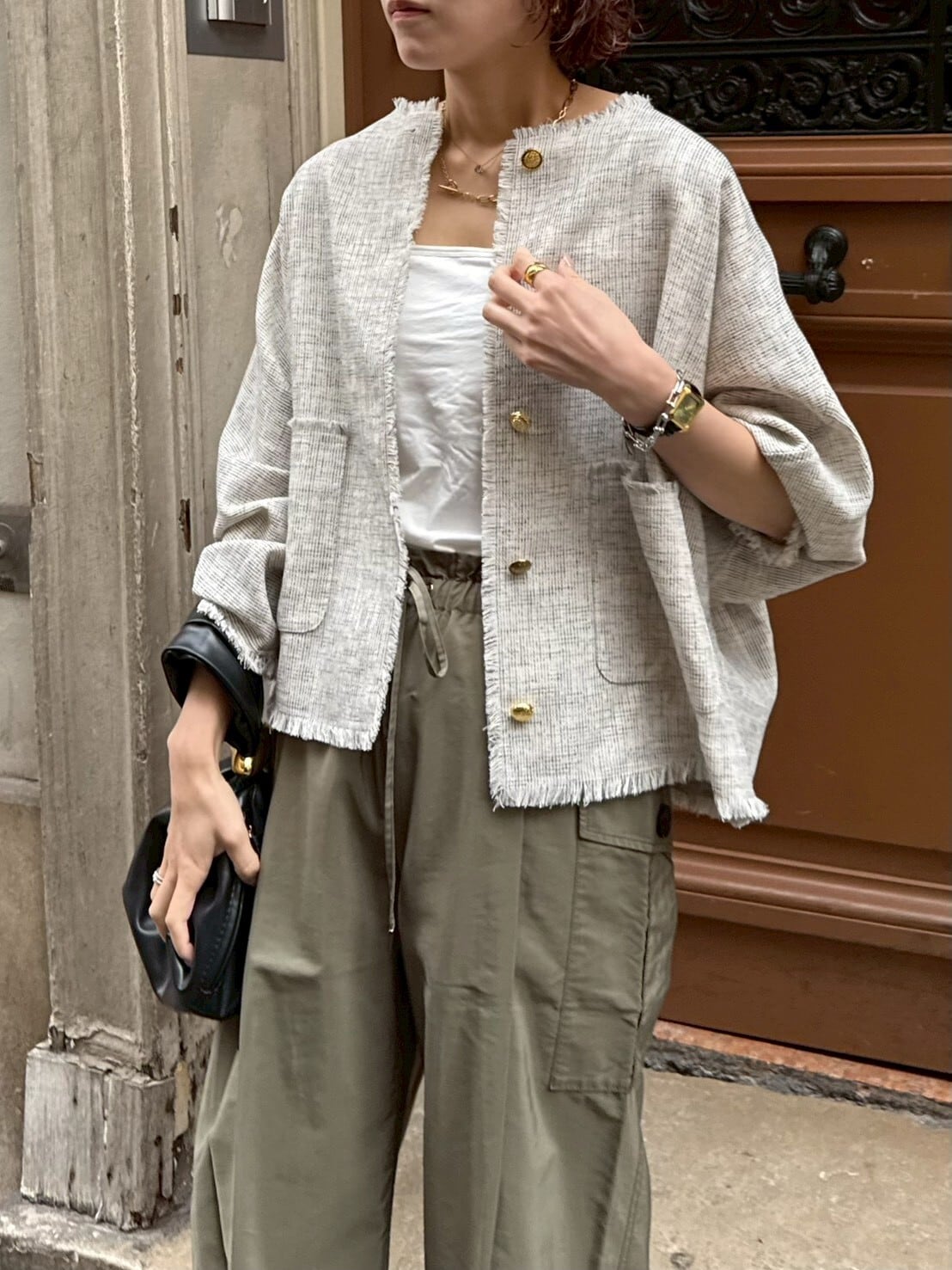 フロントにあしらったアンティーク調の金ボタンは、ヴィンテージライクな一つひとつ表情の異なる特別仕様。同じものは二つとない、さりげない“自分だけ”のポイントが、シンプルなスタイリングに奥行きを与えてくれます。