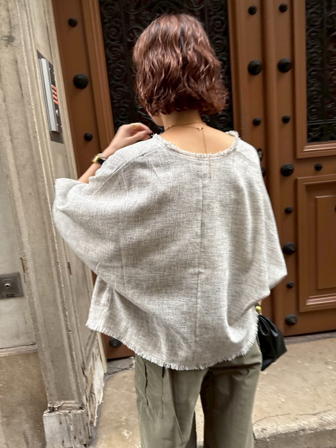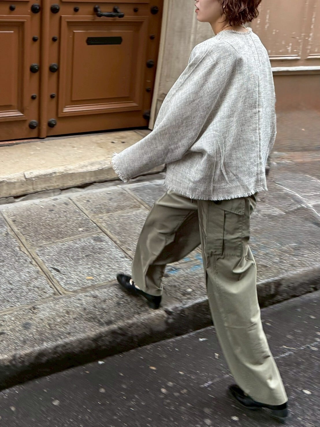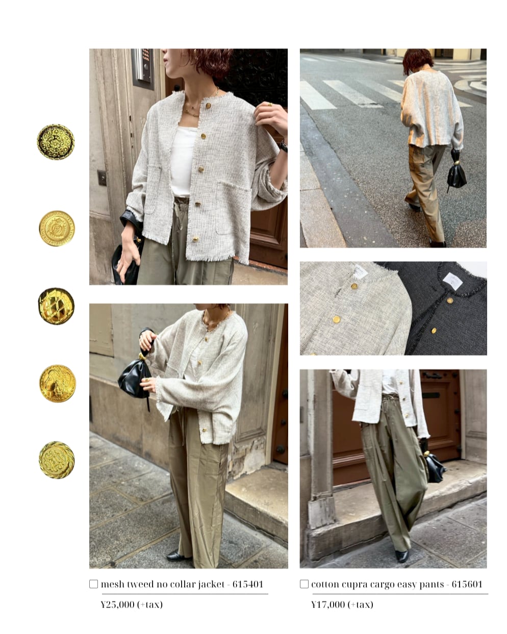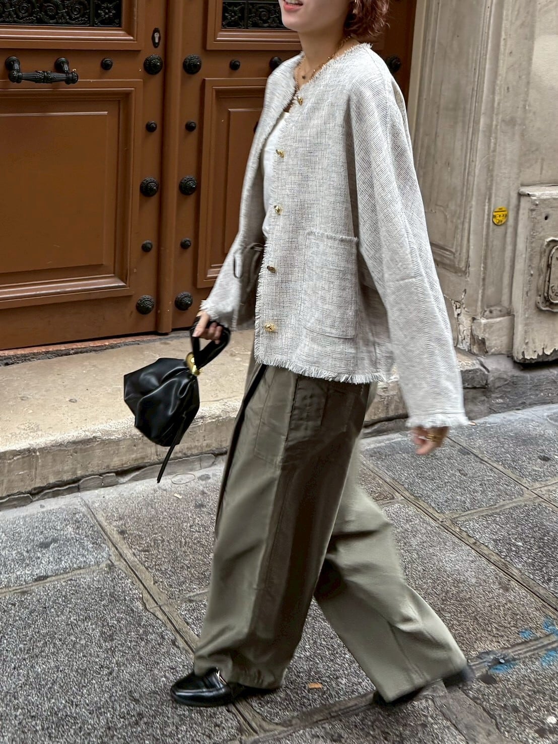 フロントにあしらったアンティーク調の金ボタンは、ヴィンテージライクな一つひとつ表情の異なる特別仕様。同じものは二つとない、さりげない“自分だけ”のポイントが、シンプルなスタイリングに奥行きを与えてくれます。