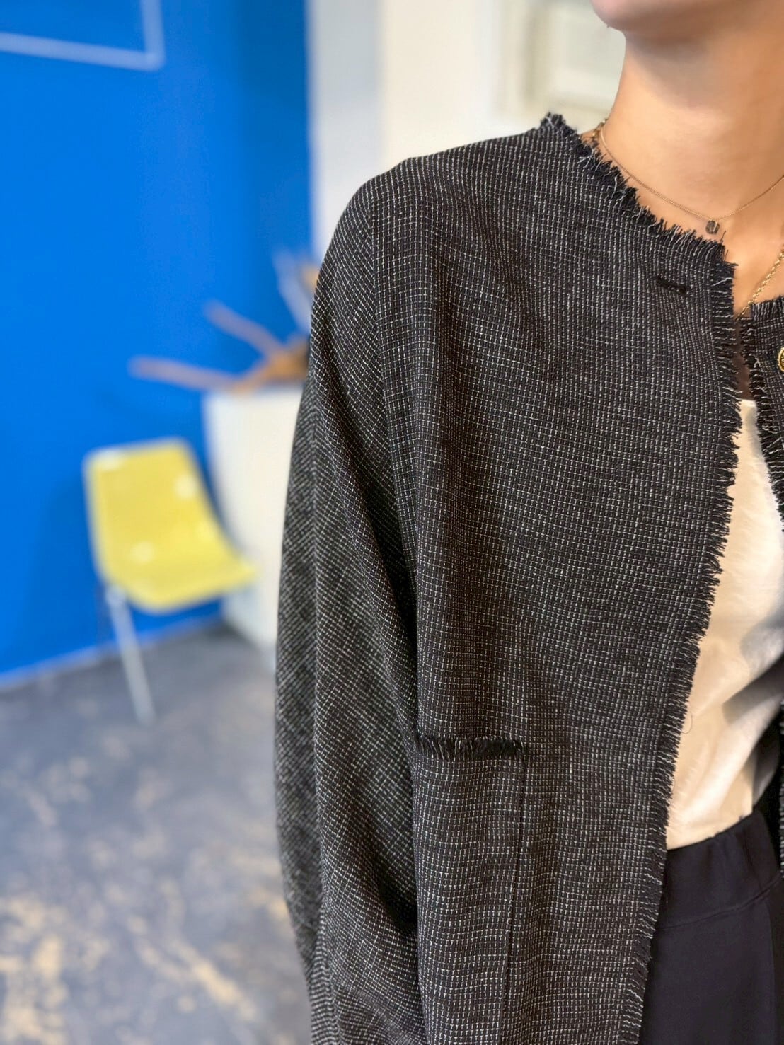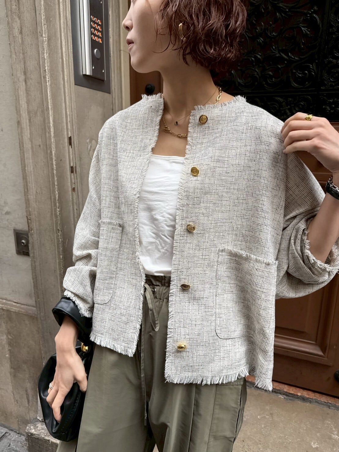 夏にも羽織れるツイードライクジャケット。