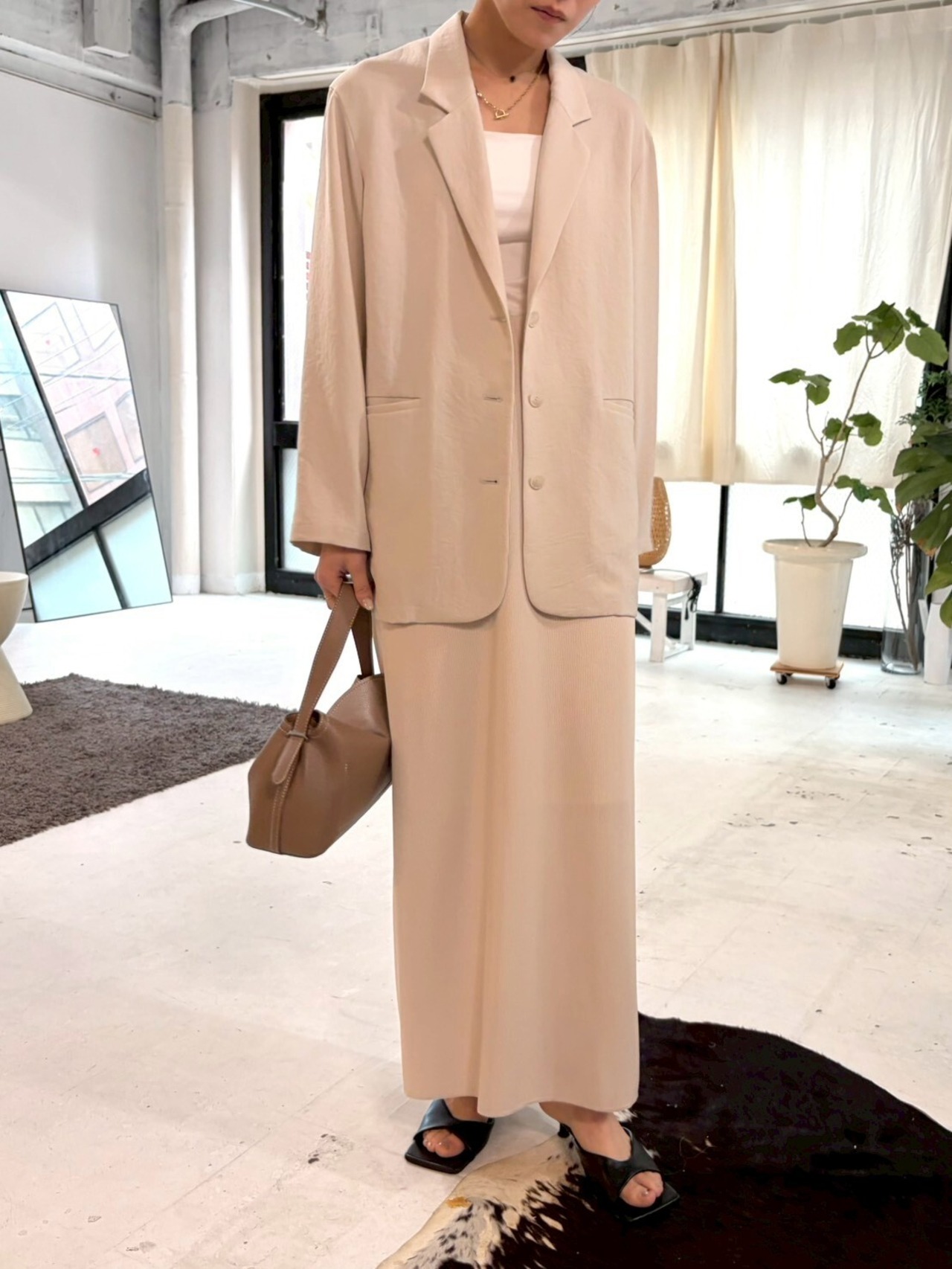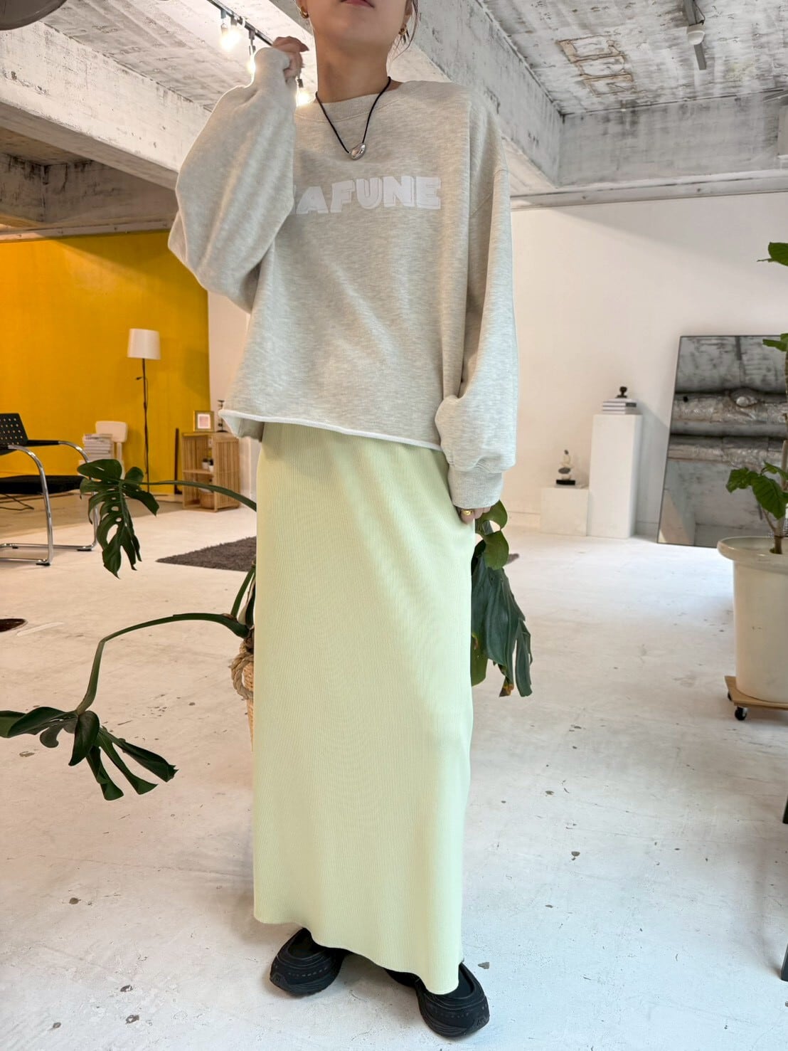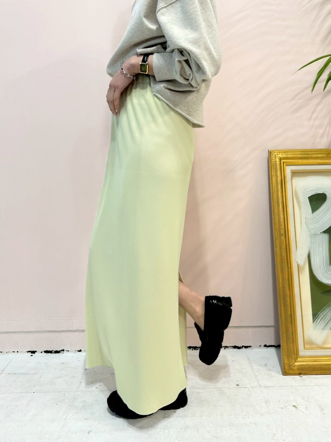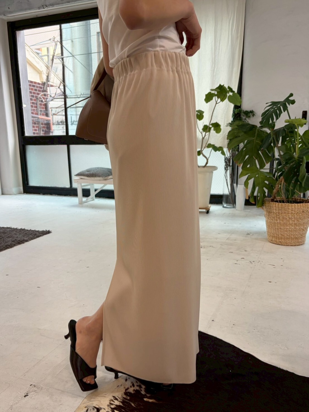 柔らかく表情のあるリブ素材を使用し、落ち感のある生地がカジュアルになりすぎず、きれいめな印象に仕上げています。
