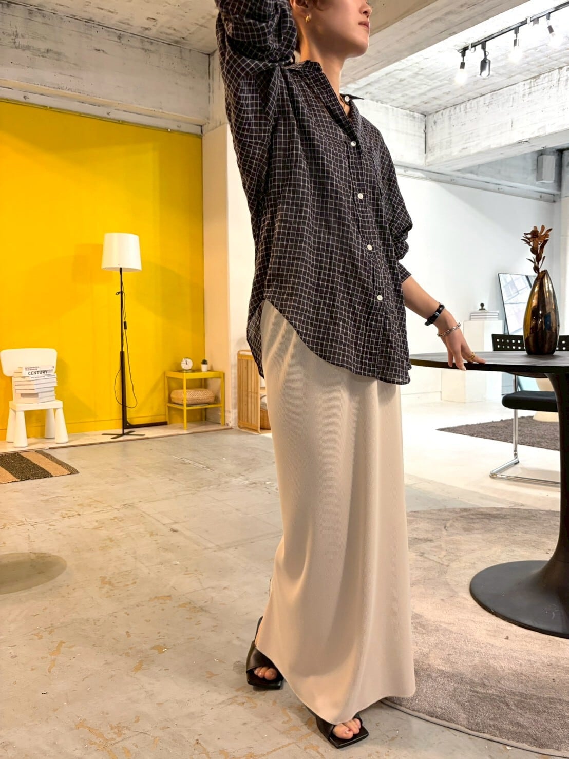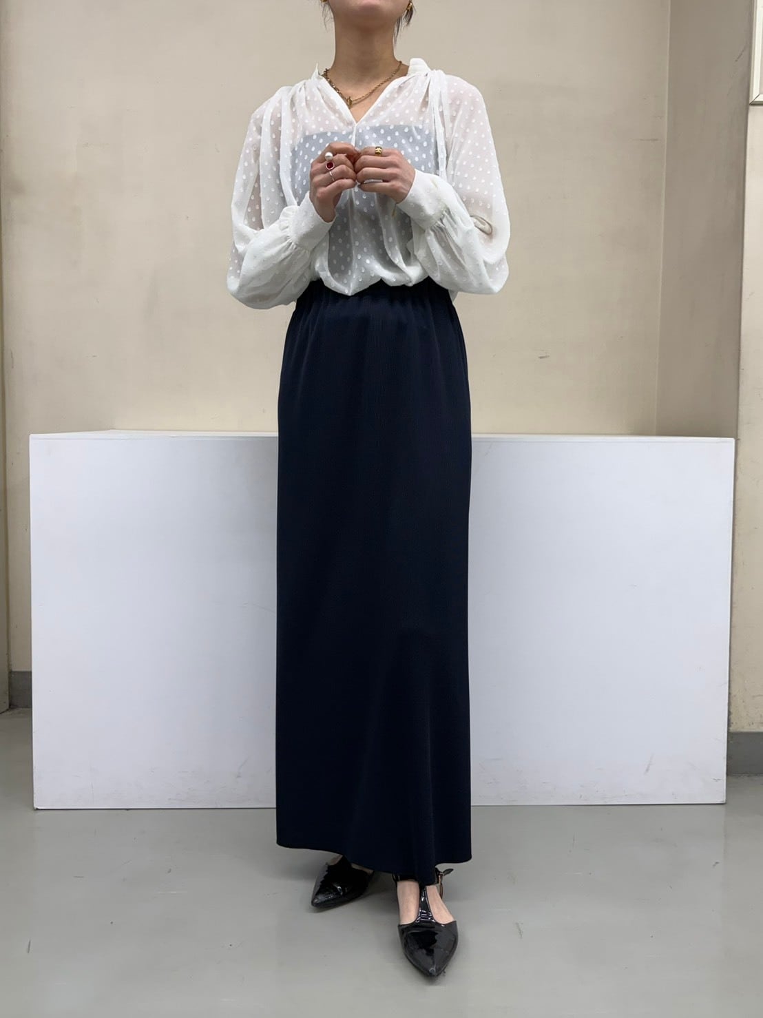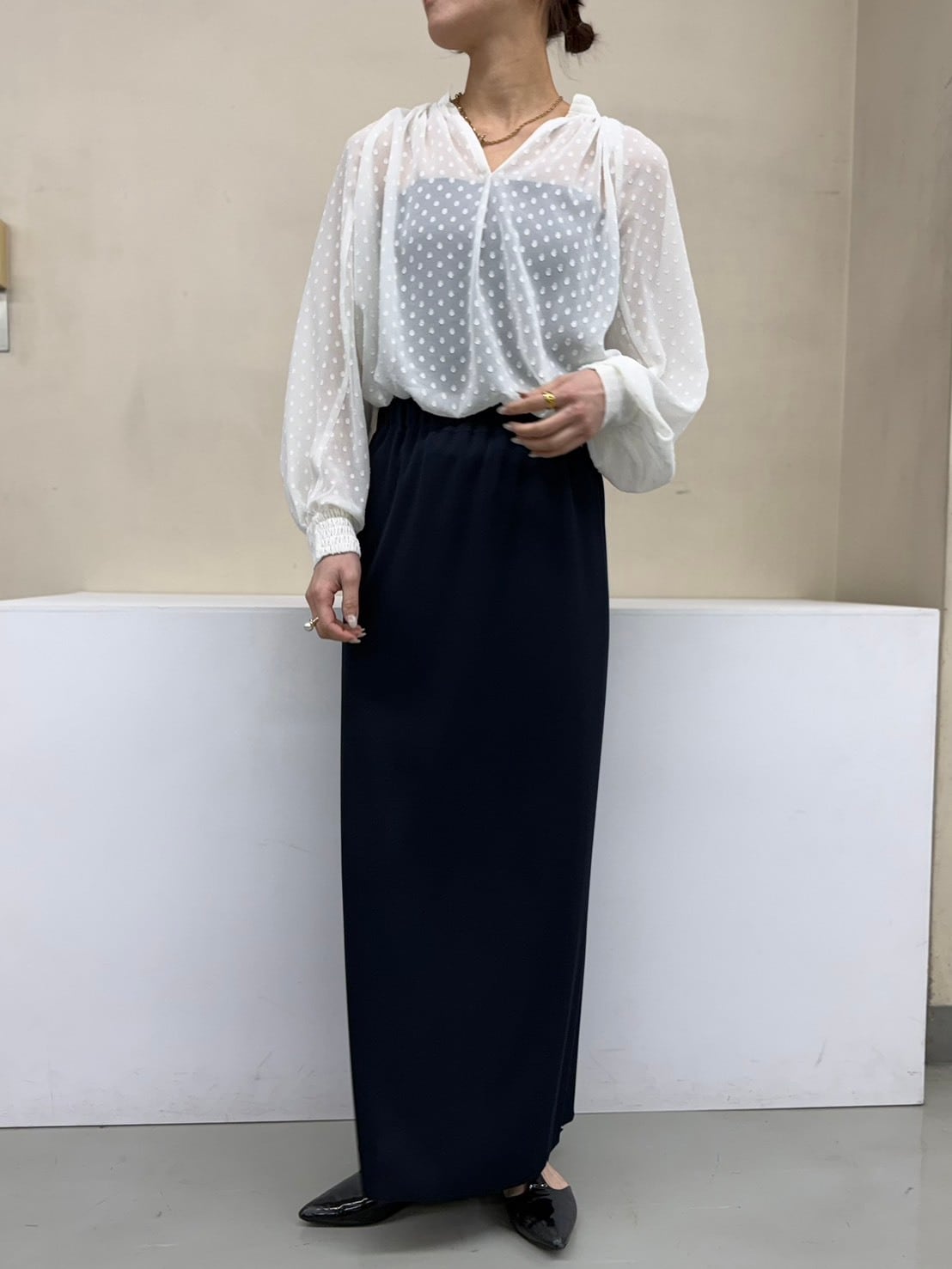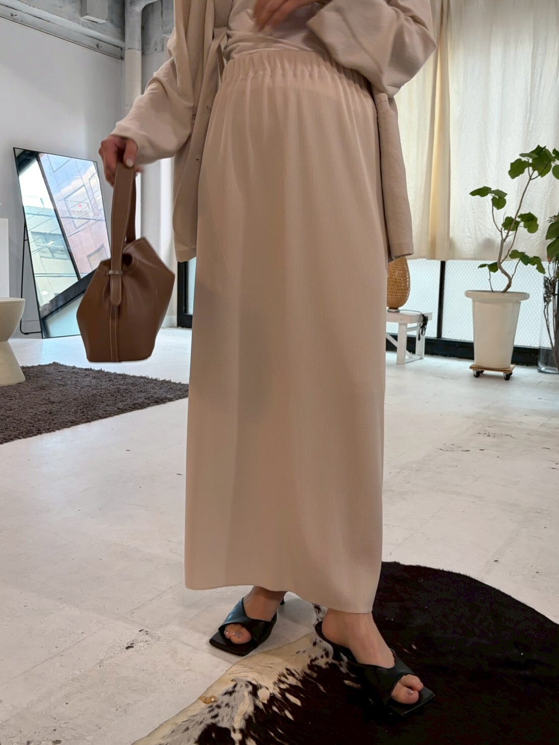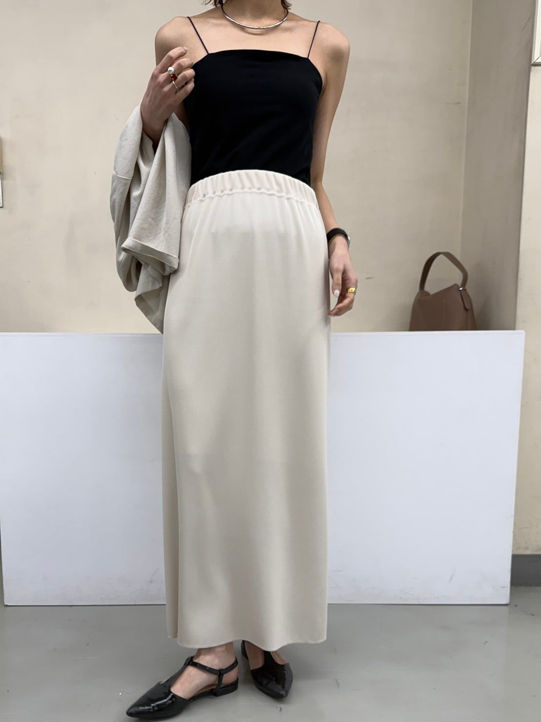 柔らかく表情のあるリブ素材を使用し、落ち感のある生地がカジュアルになりすぎず、きれいめな印象に仕上げています。