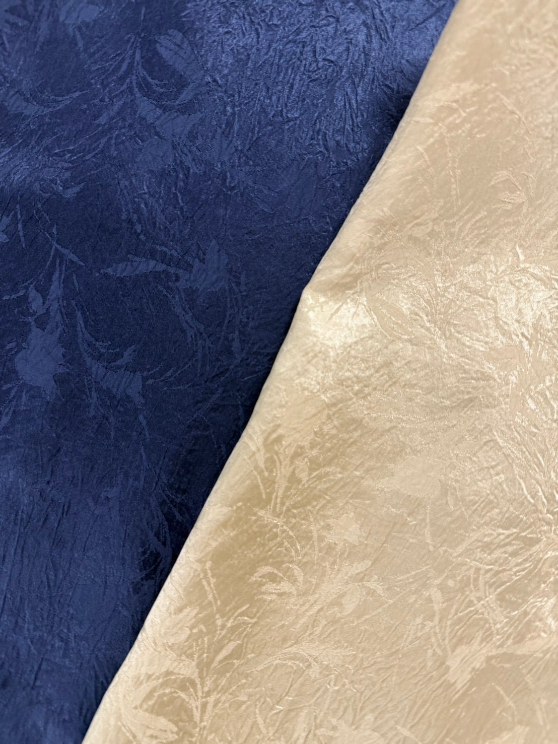 ボタニカル柄のジャガード素材に、サスティナブルなアセテート100%を使用。素材特有の美しい光沢と、特殊なタンブラー加工によるナチュラルなシワ感が、シンプルなのに印象に残る表情を生み出します。