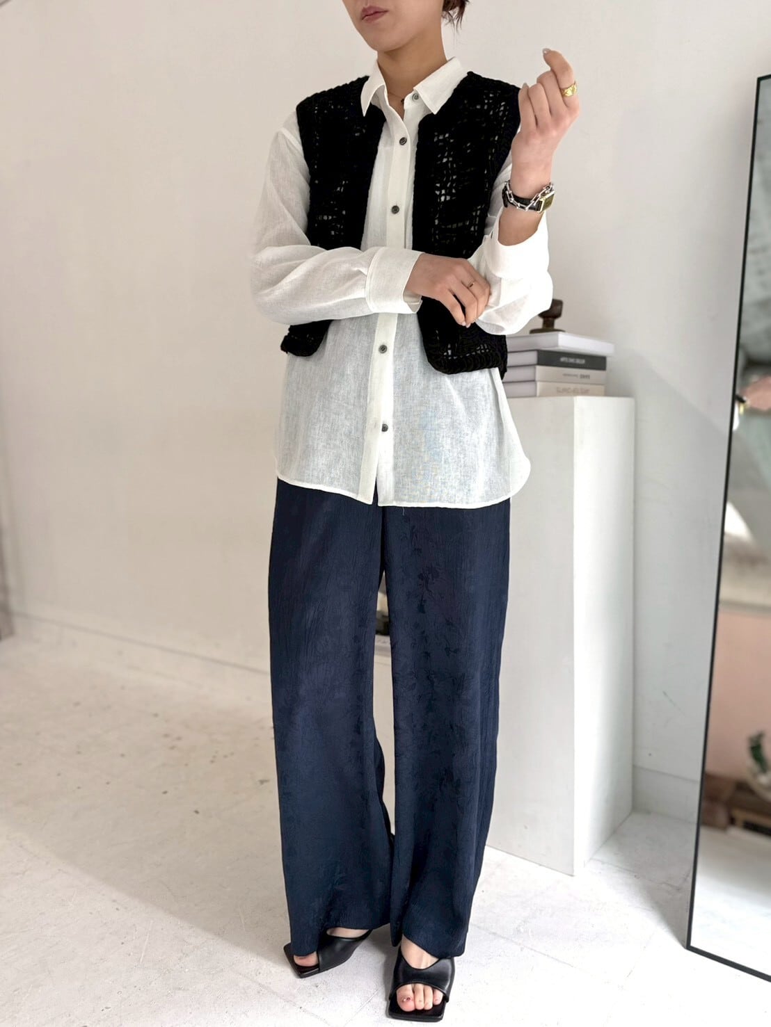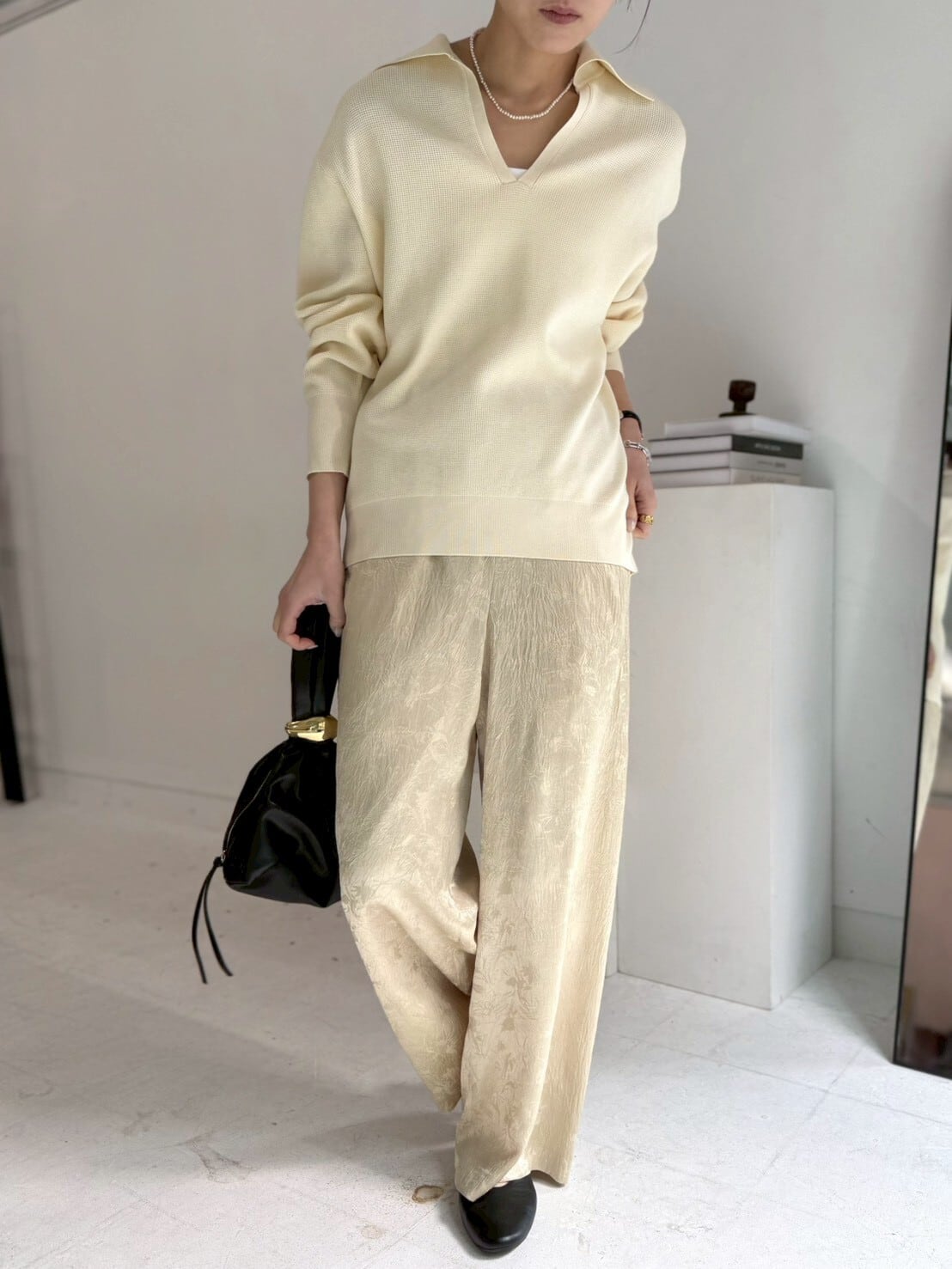 トップスはあえてシンプルに。素材の存在感を楽しみたくなる、主役パンツです。