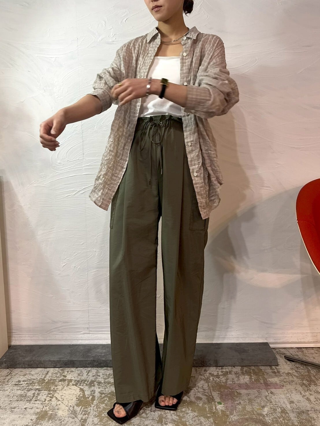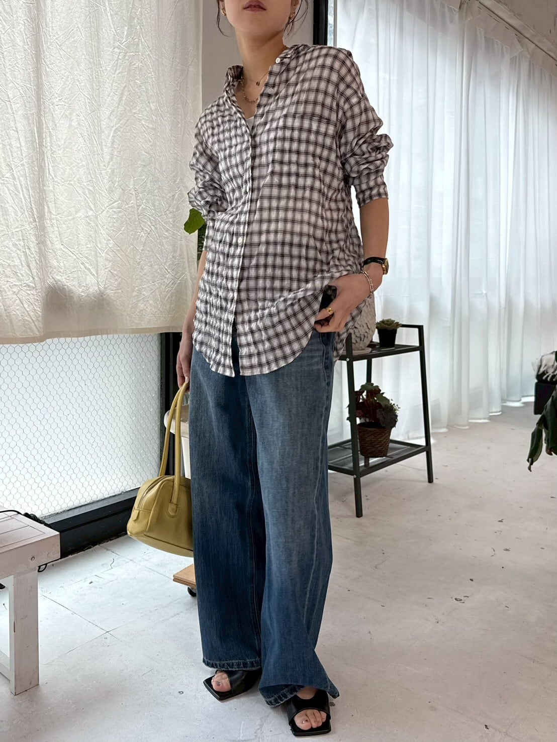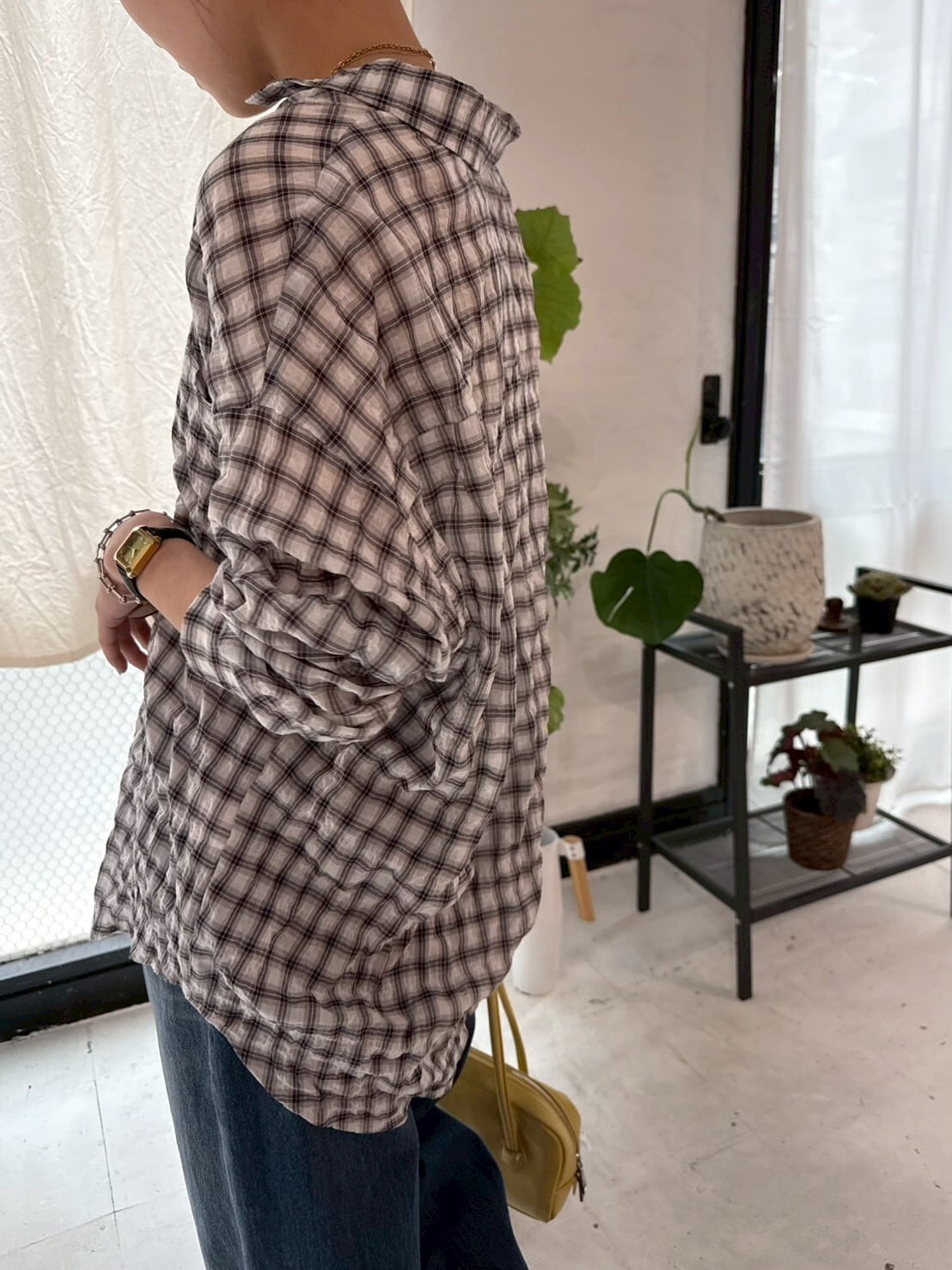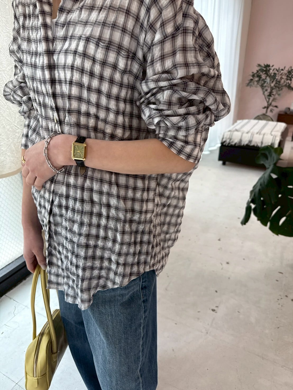 季節の変わり目にも軽い羽織としても活躍。もともとある素材のお洒落なシワ感によりバッグの中にくしゅくしゅと入れて持ち運ぶにも丁度いい♪気温差のある日にも頼れる存在。