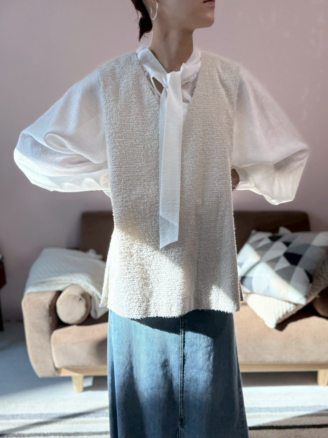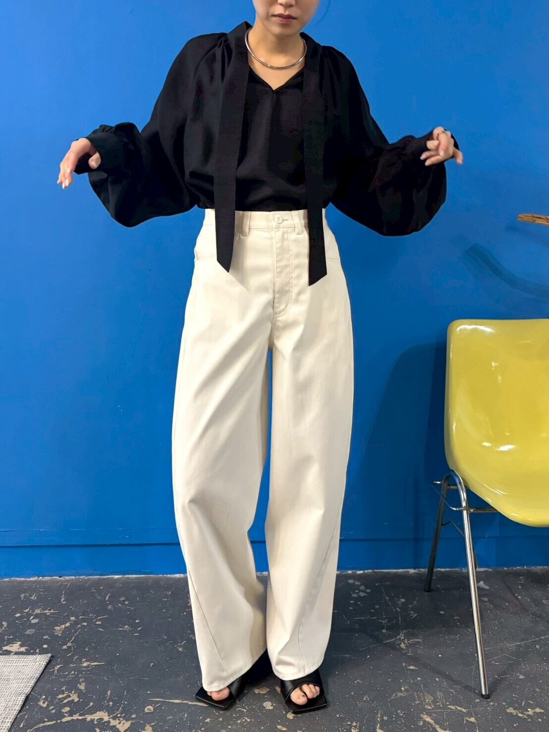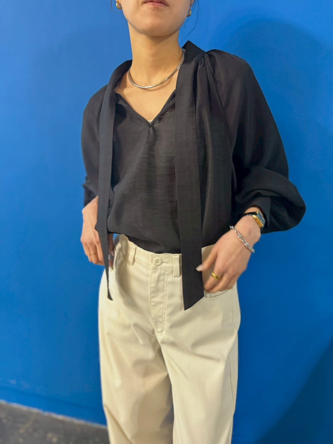 ボウタイは前後どちらでも着用可能。甘さを抑えたい日は後ろに回して、気分やシーンに合わせた着こなしを楽しめます。