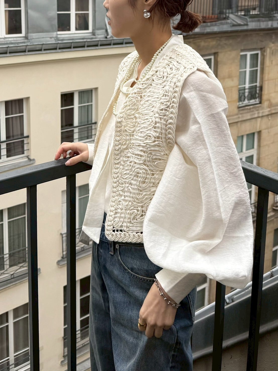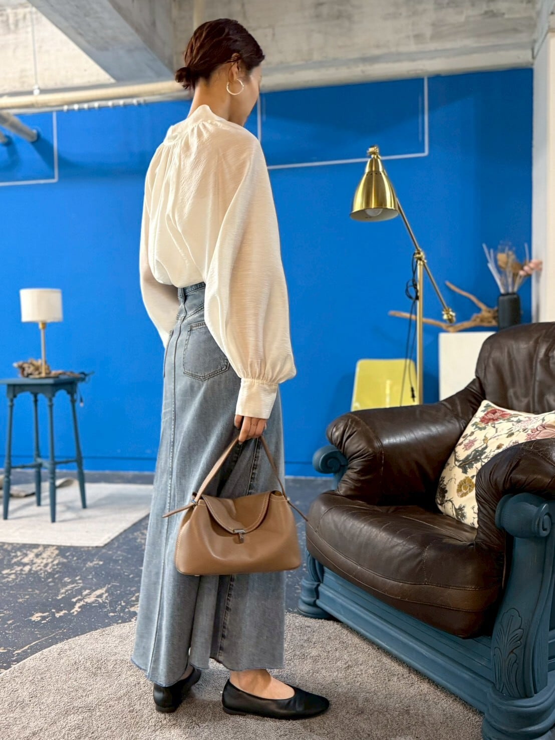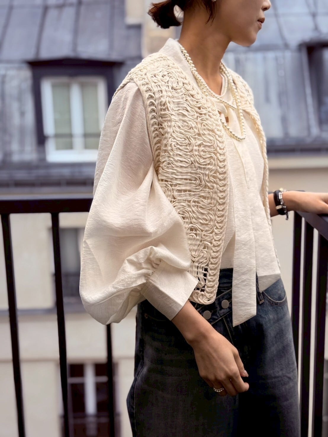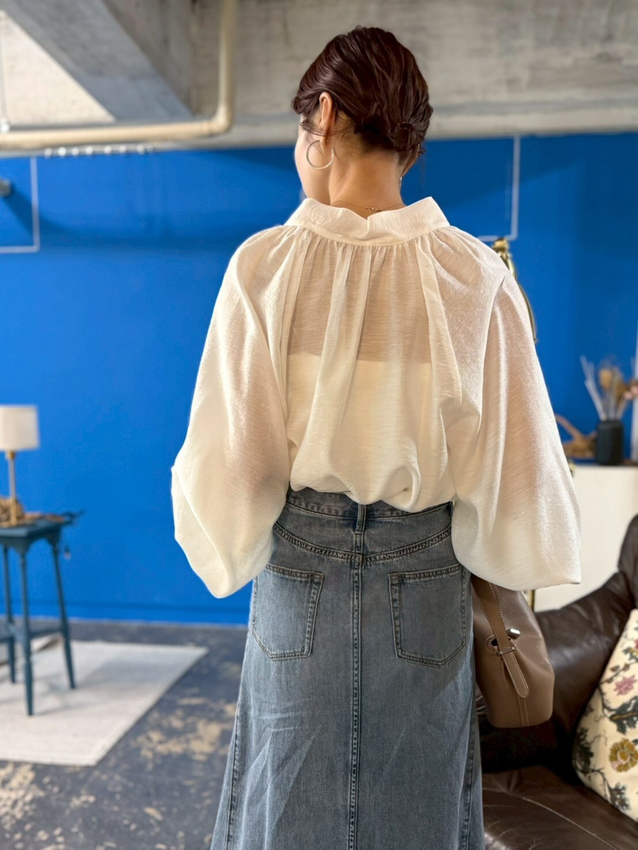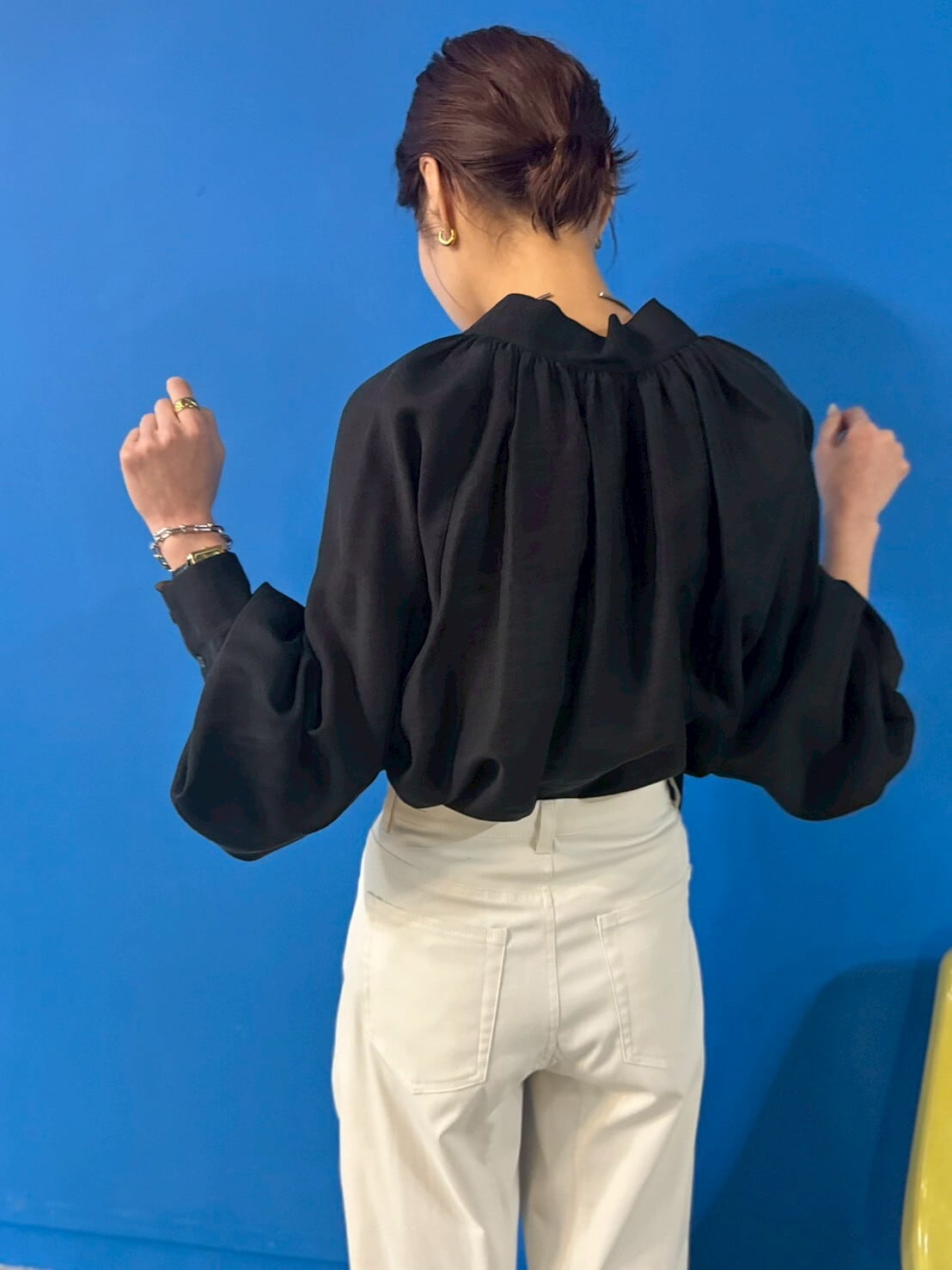 襟まわりと袖口にギャザーを寄せ、ふんわりと立体感のあるフォルムに仕上げることで、シンプルなボトム合わせでも自然と華やかな印象に。