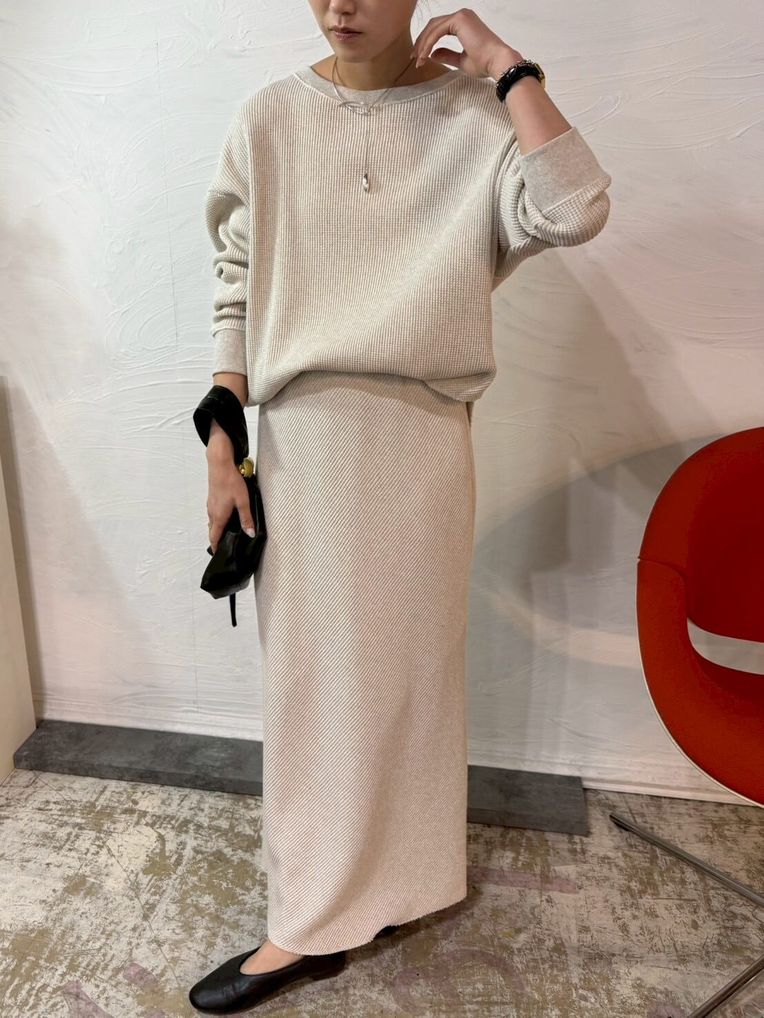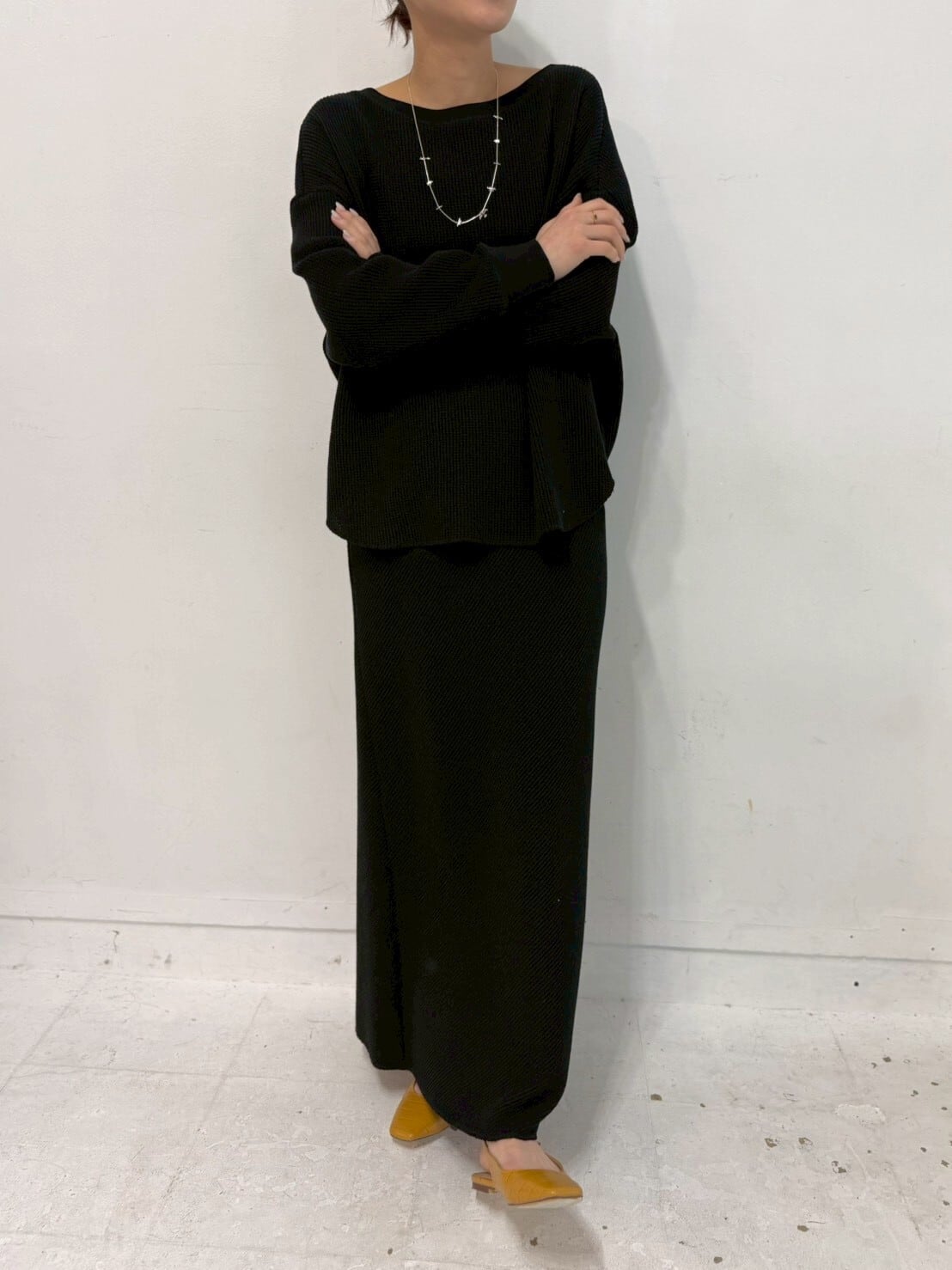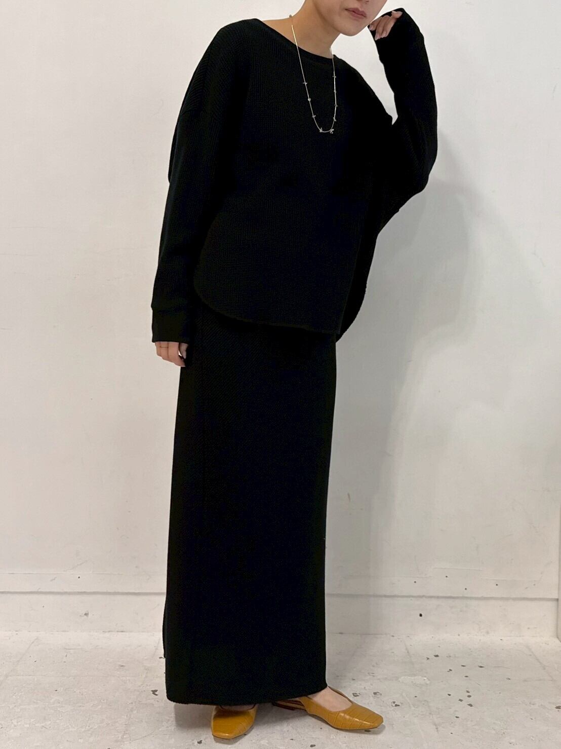 ボートネックは、そのままはもちろんオフショルダーとしての着用もお洒落✨さりげく肌を見せたスタイリングで、女性らしさをプラスできます。