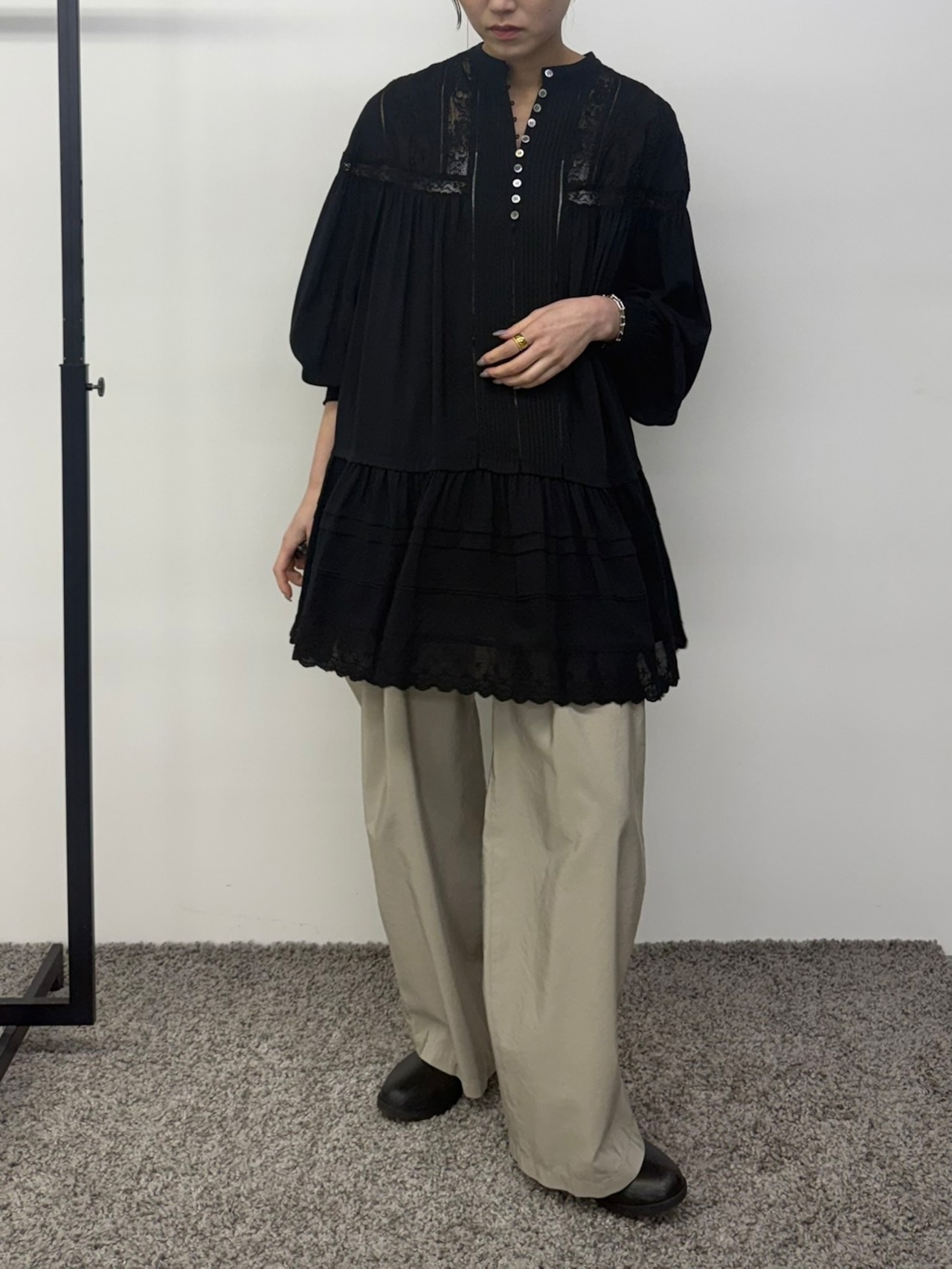 落ち感のあるやわらかなレーヨンに、繊細なレース、細やかなピンタック、贅沢にあしらったディテールが視線を惹きつける一枚。