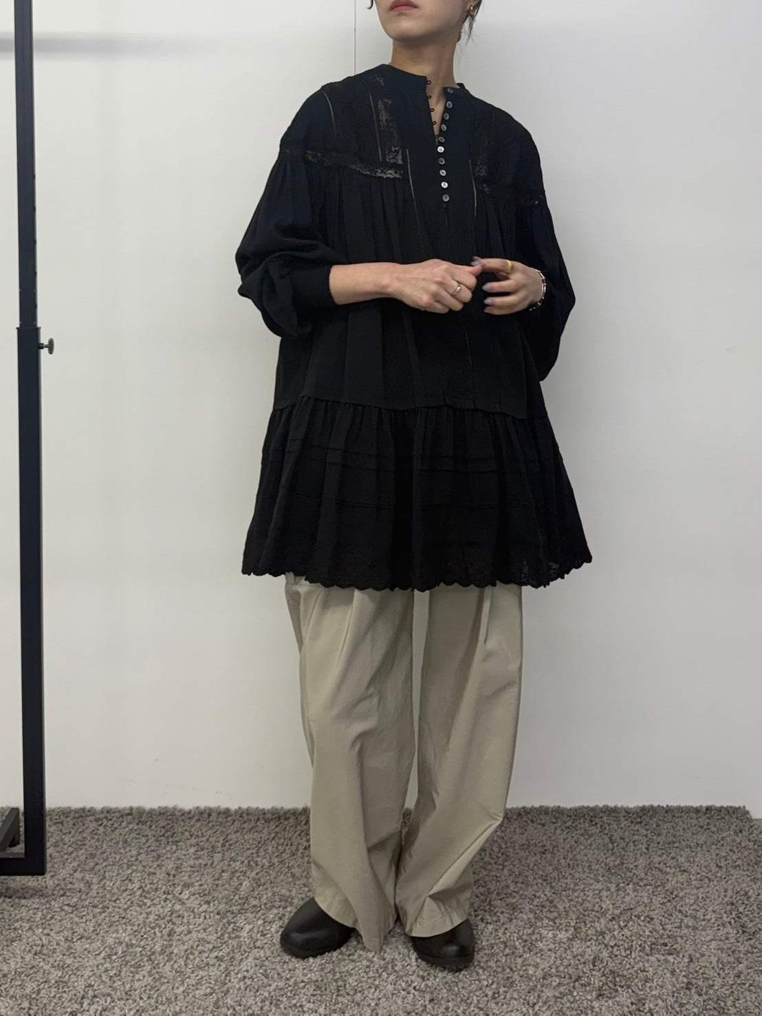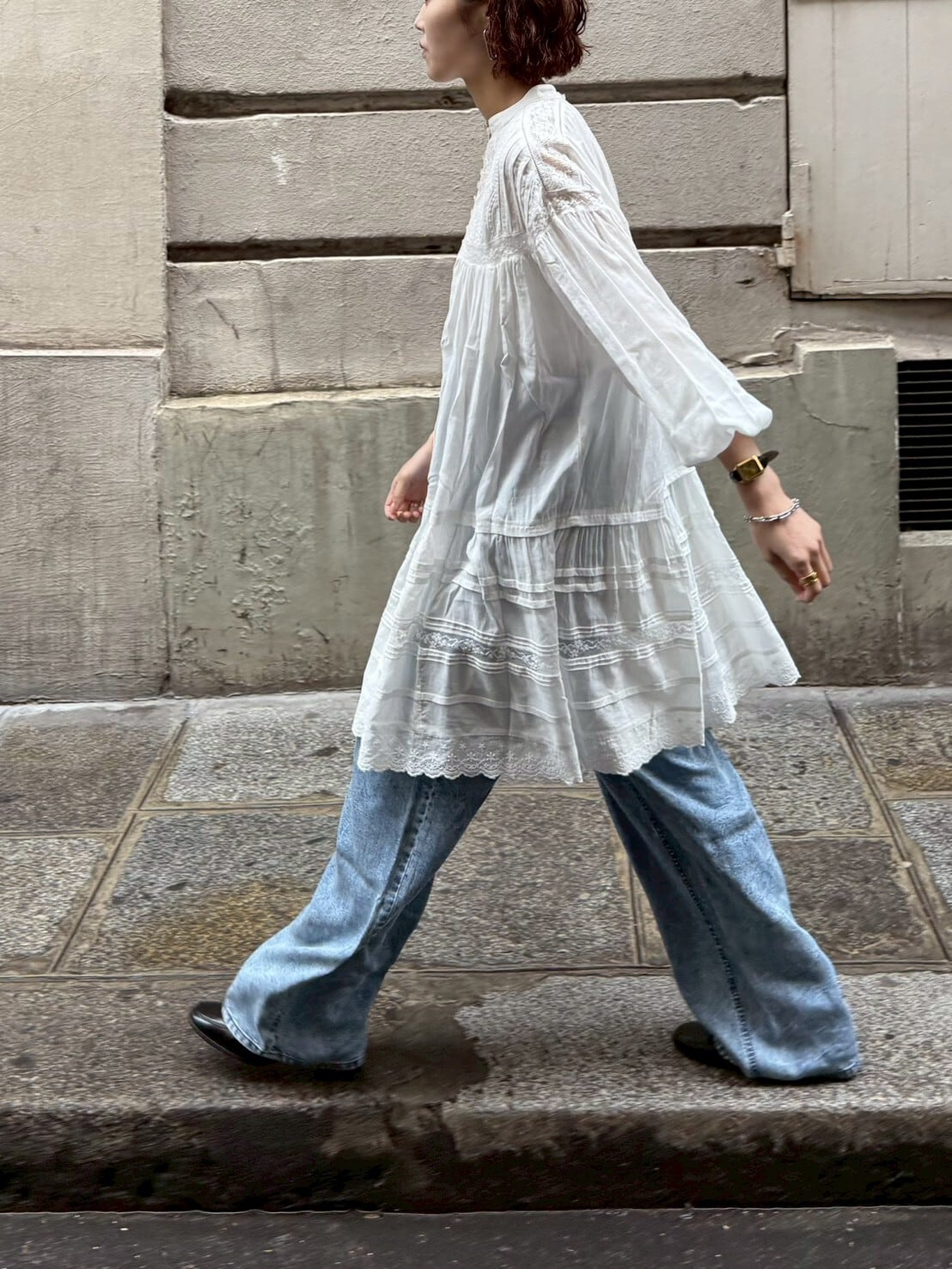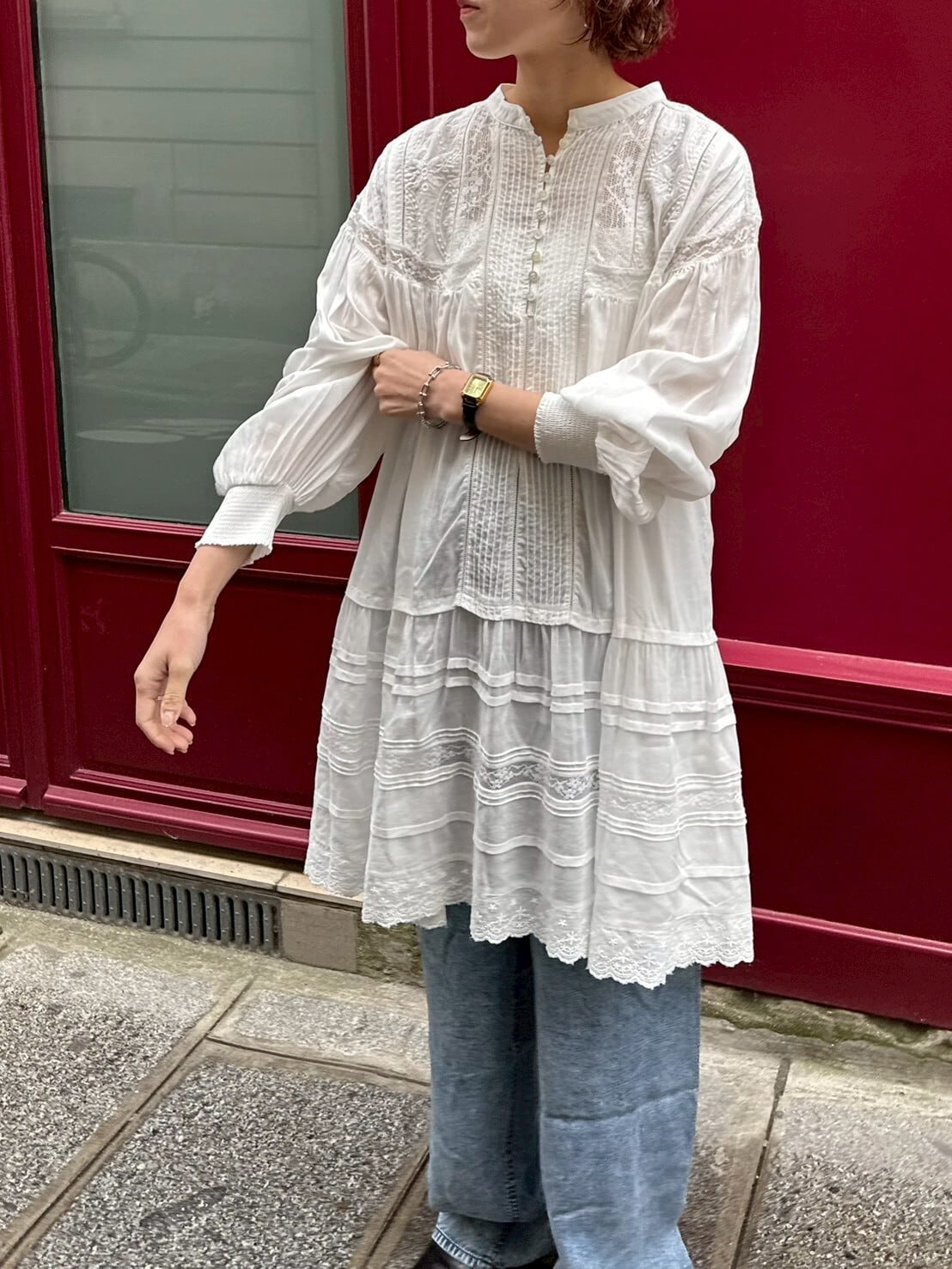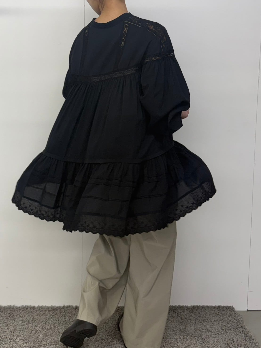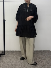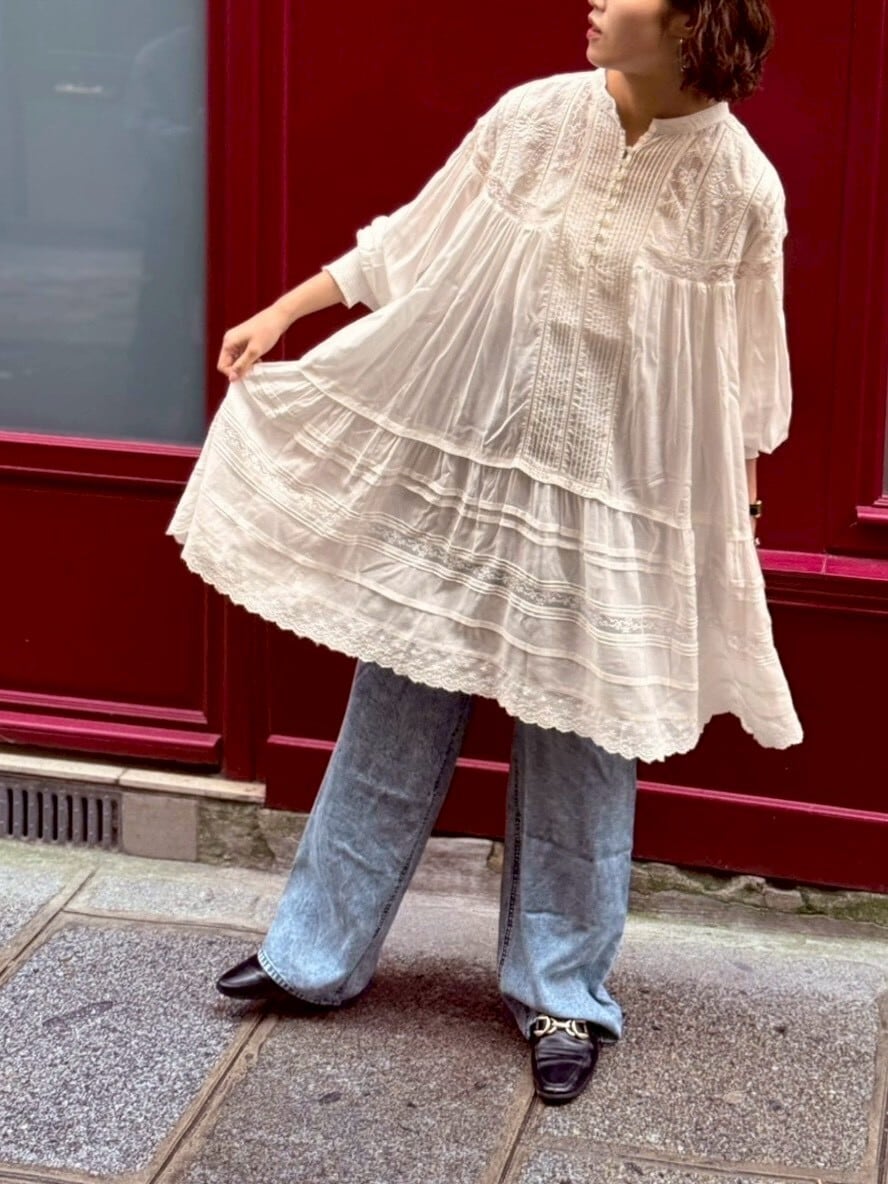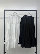 たっぷりと寄せたギャザーから広がる空気を含んだエアリーなシルエット。動くたびにふわりと揺れて、まるでアンティークのドレスのような雰囲気に。