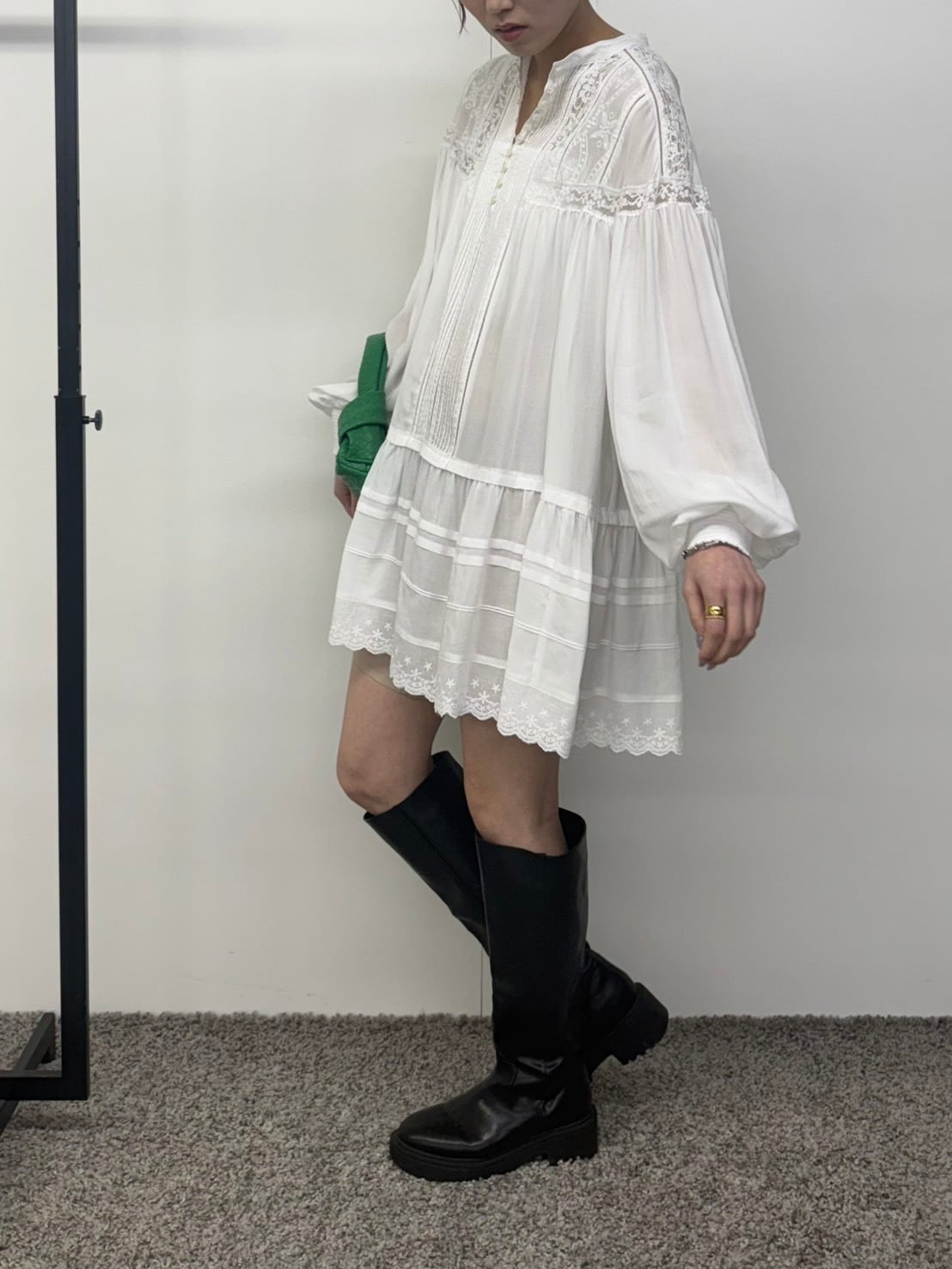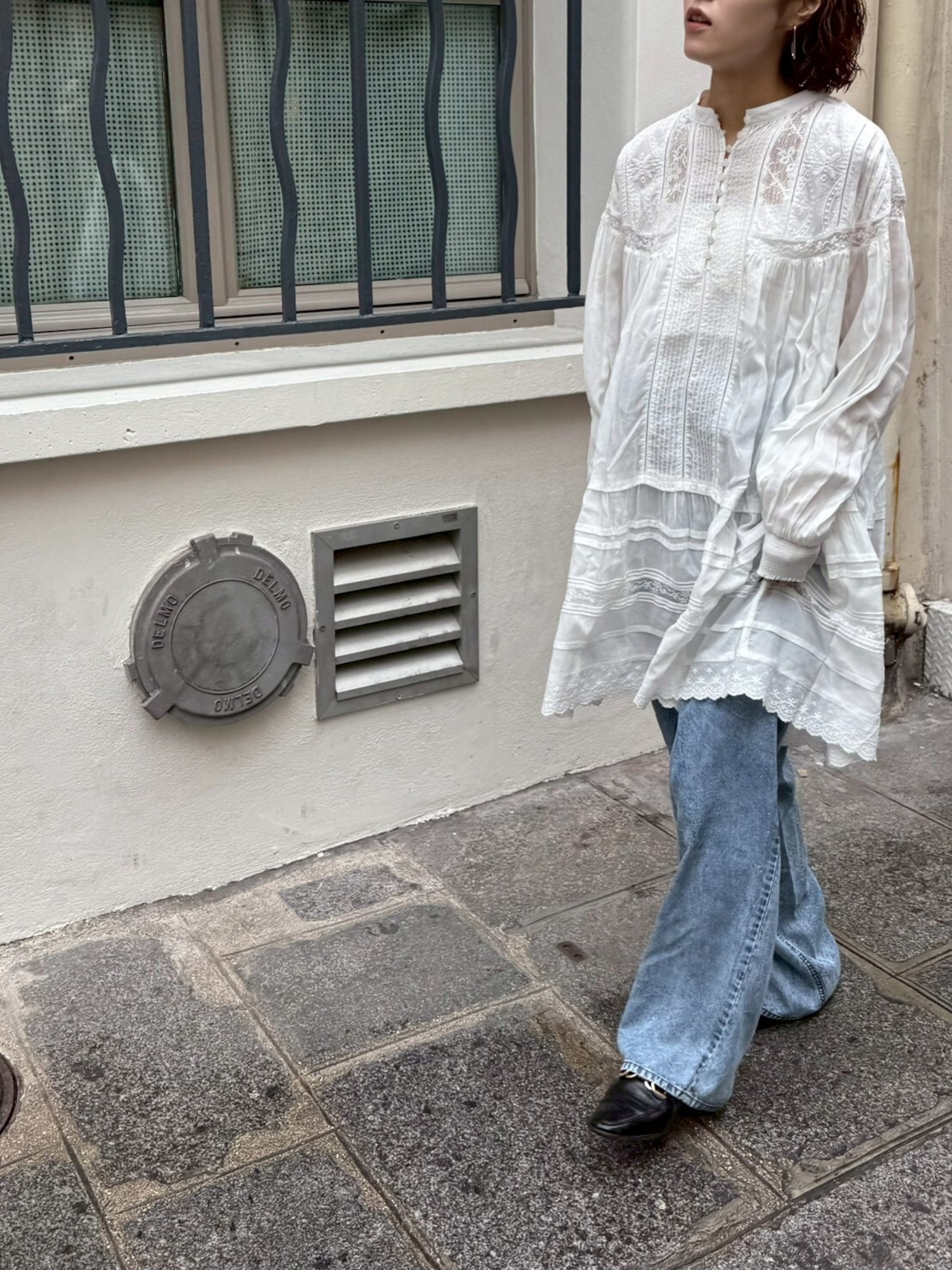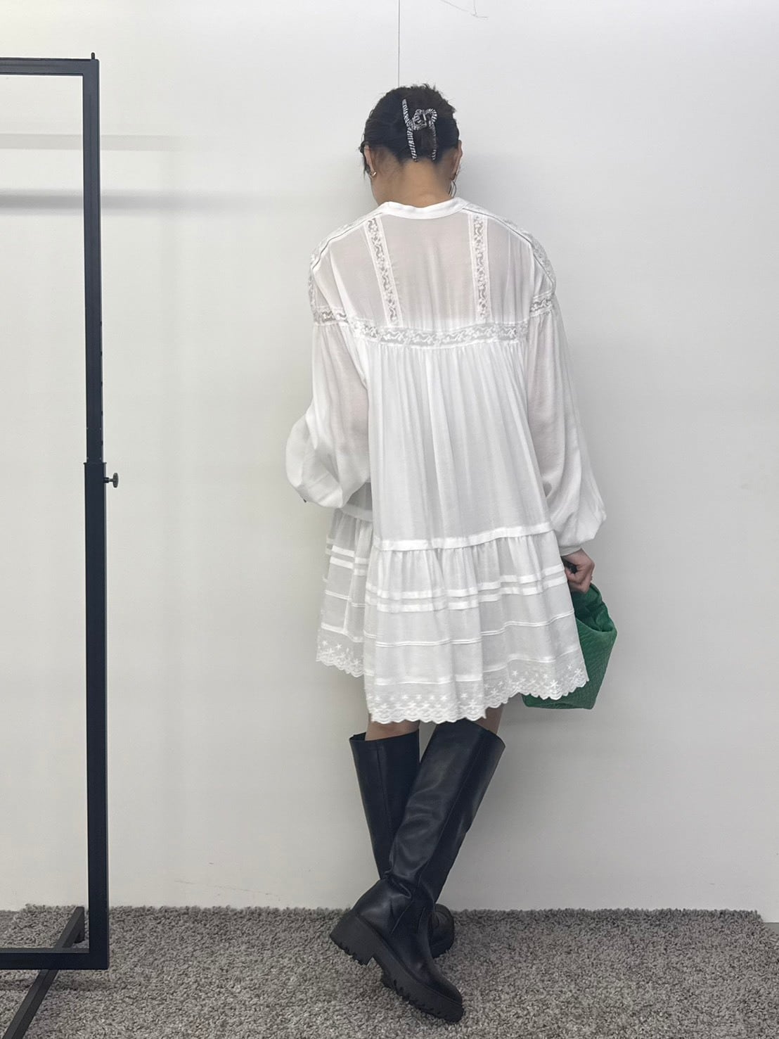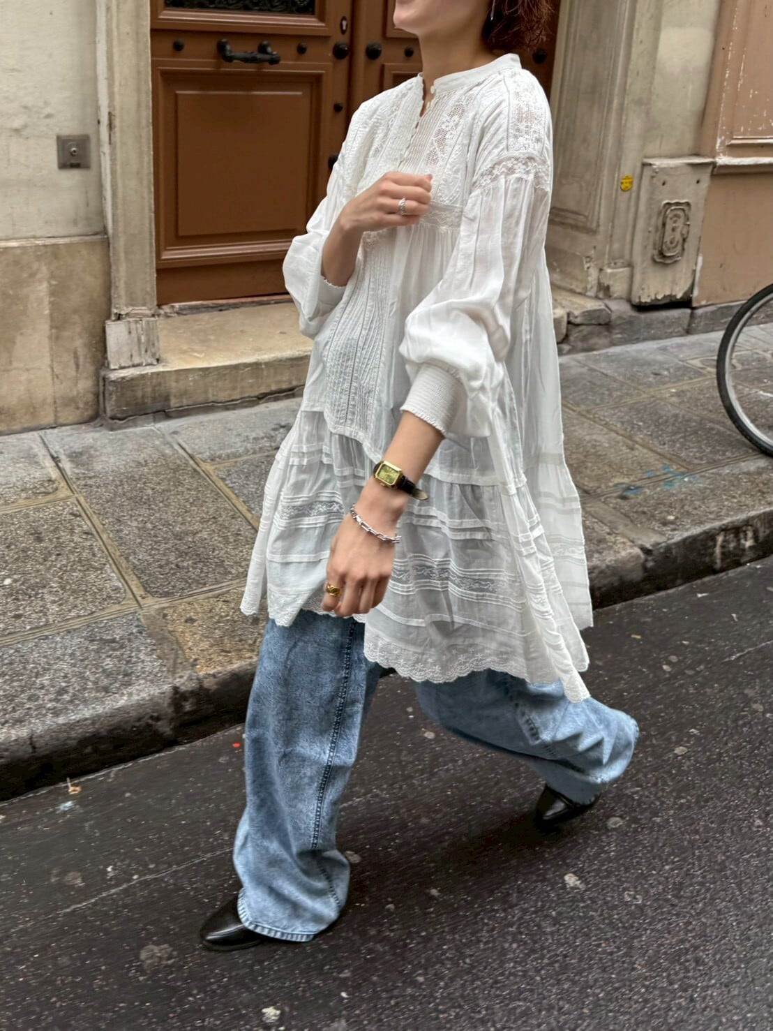 たっぷりと寄せたギャザーから広がる空気を含んだエアリーなシルエット。動くたびにふわりと揺れて、まるでアンティークのドレスのような雰囲気に。