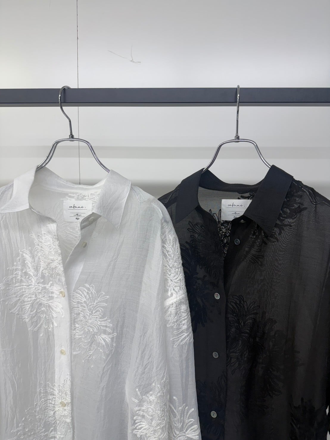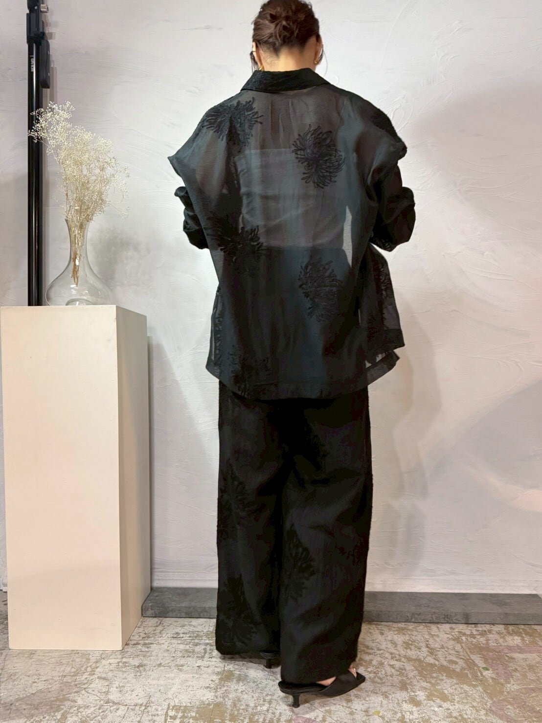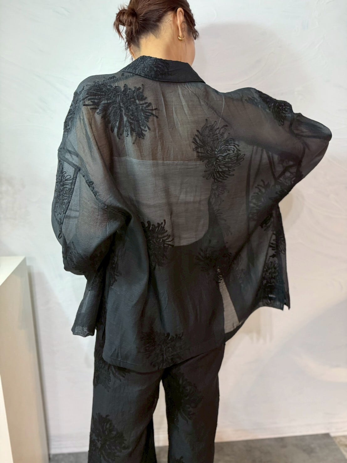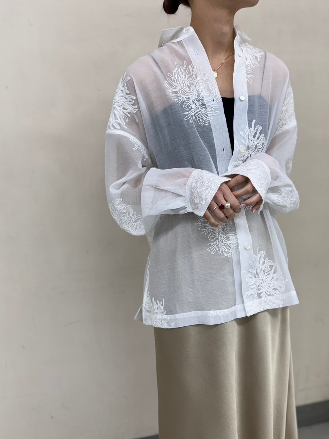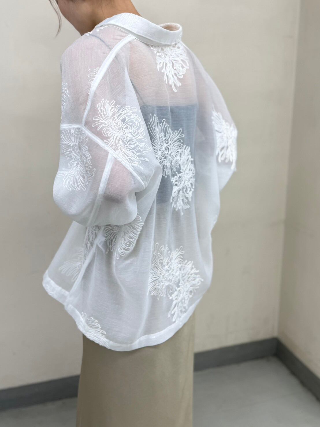 派手じゃないのに、ちゃんと印象に残る。繊細なボタニカル刺繍がふわっと浮かぶ大人のためのシアーシャツ。