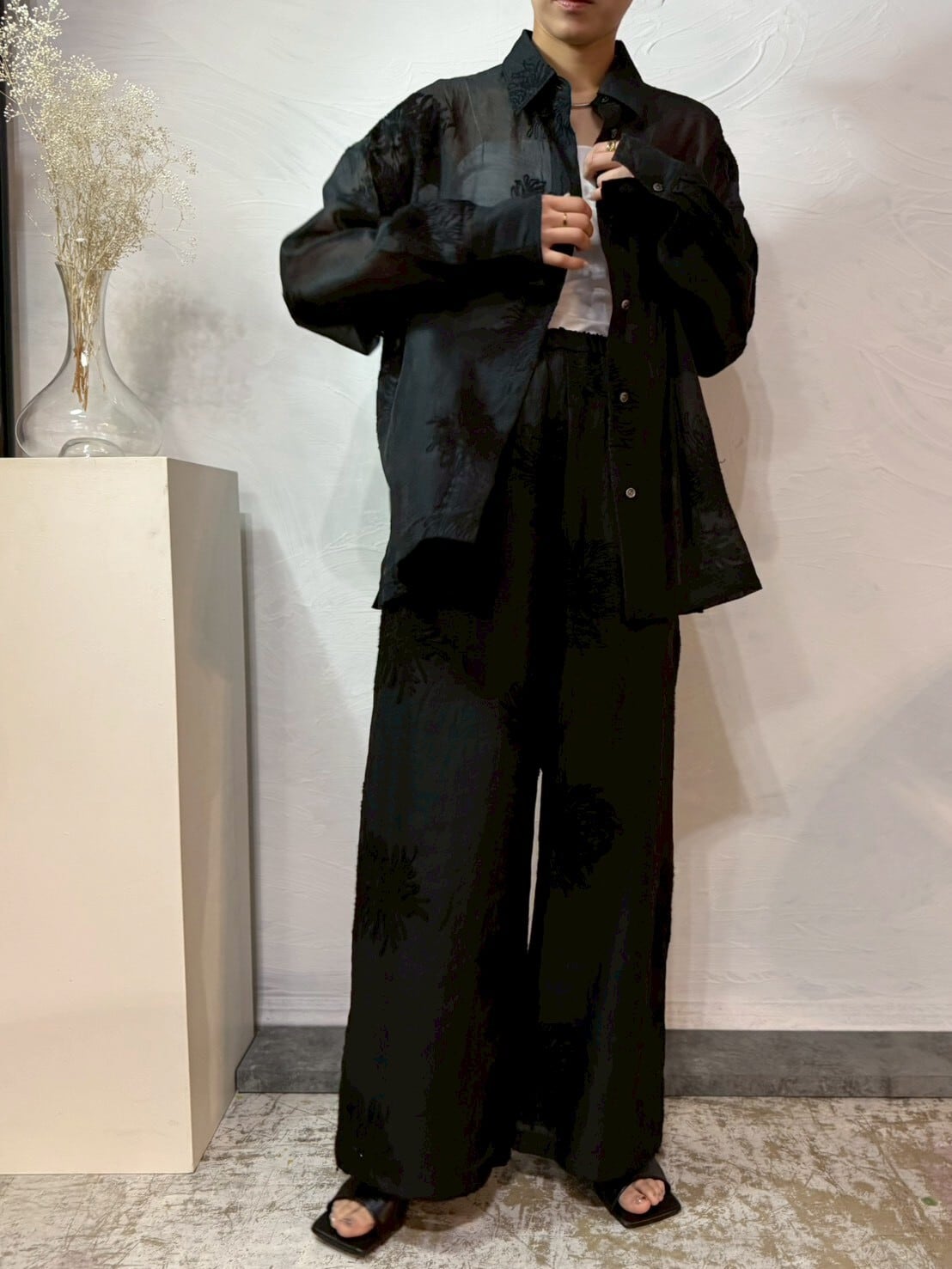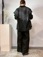 タンクやキャミにさらっと重ねるだけで一気に今っぽいバランスに。同素材パンツとセットアップで着れば統一感のある洗練スタイルが完成。そんな空気を纏えるシアーシャツです♪