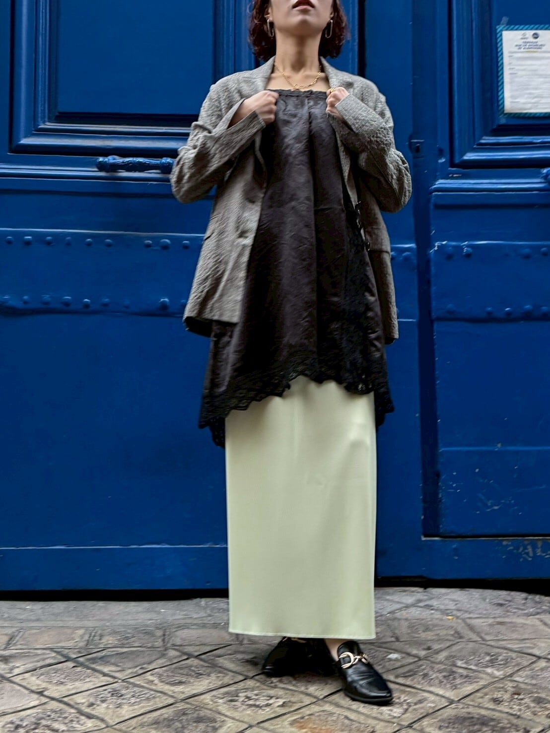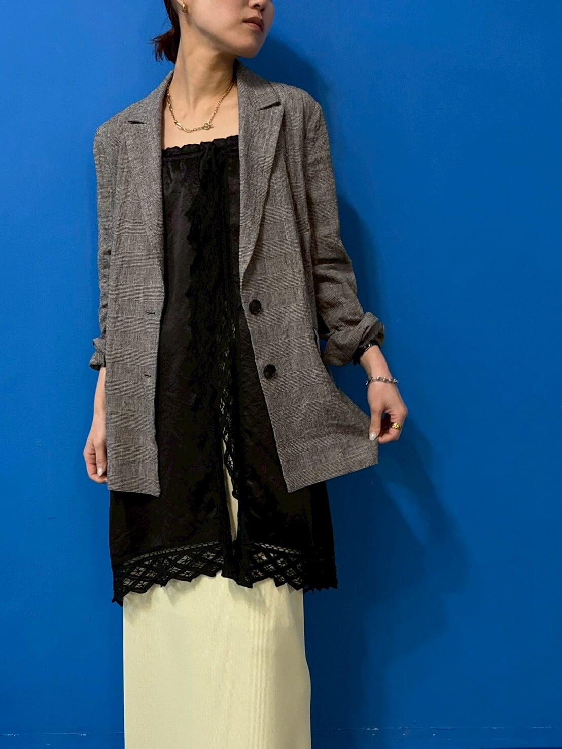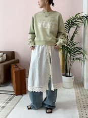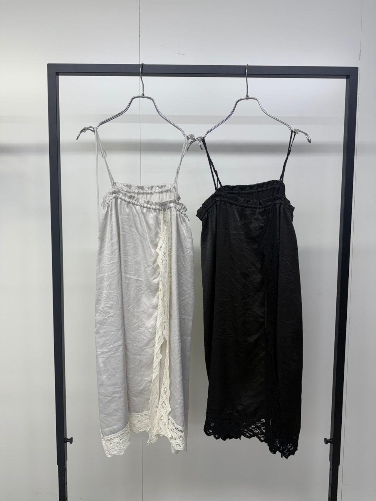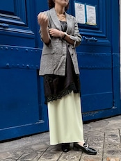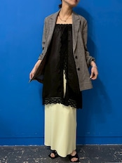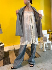 肩紐を外してウエストをきゅっと絞れば存在感のあるレーススカートに。そのまま重ねればチュニック丈のレイヤードトップスとしてシンプルな装いに華やぎをプラス。