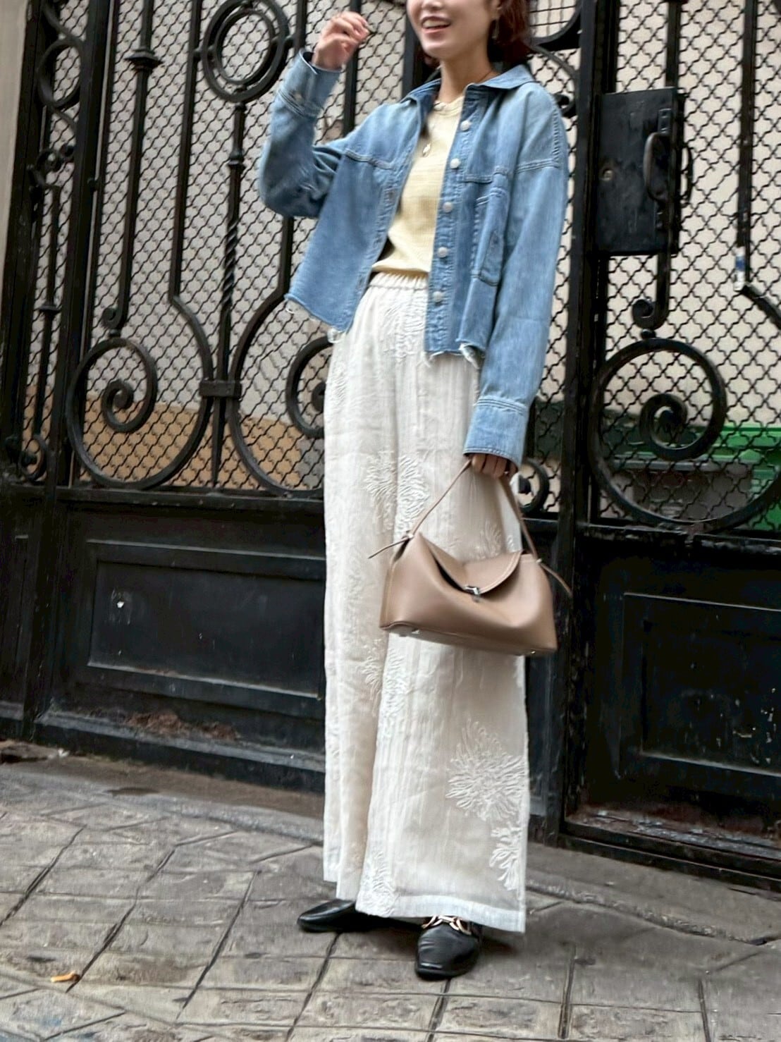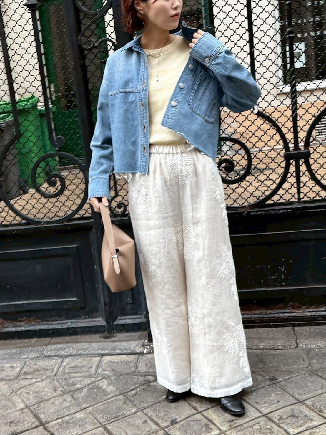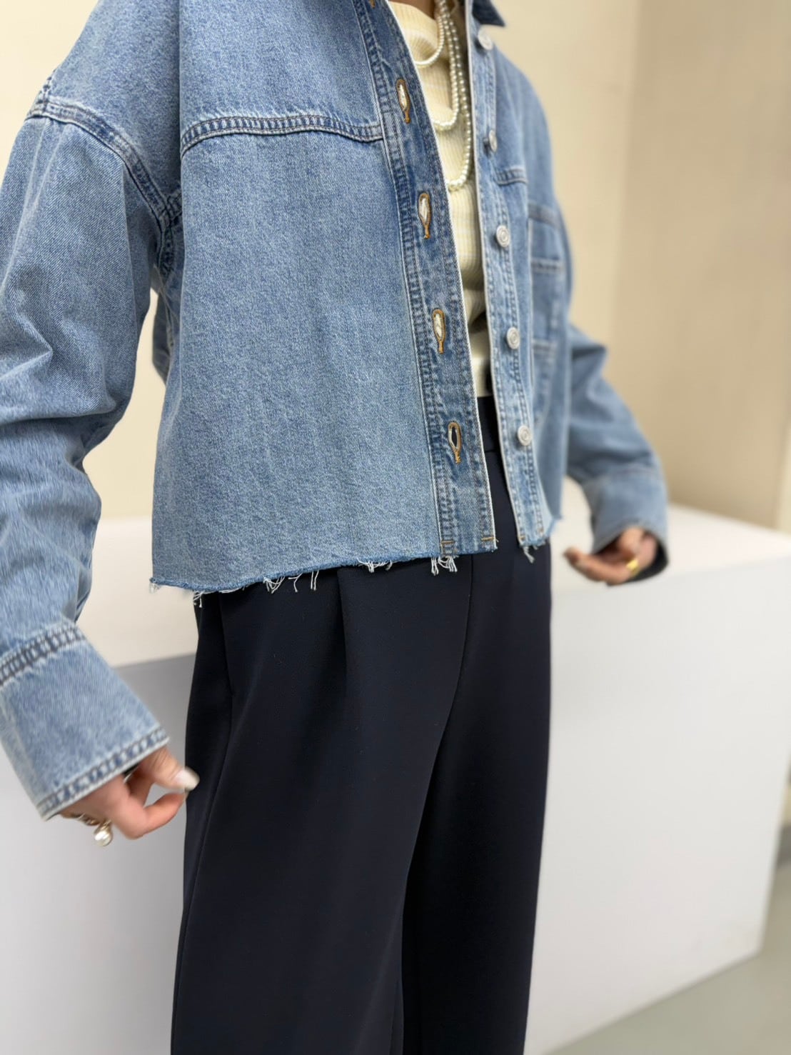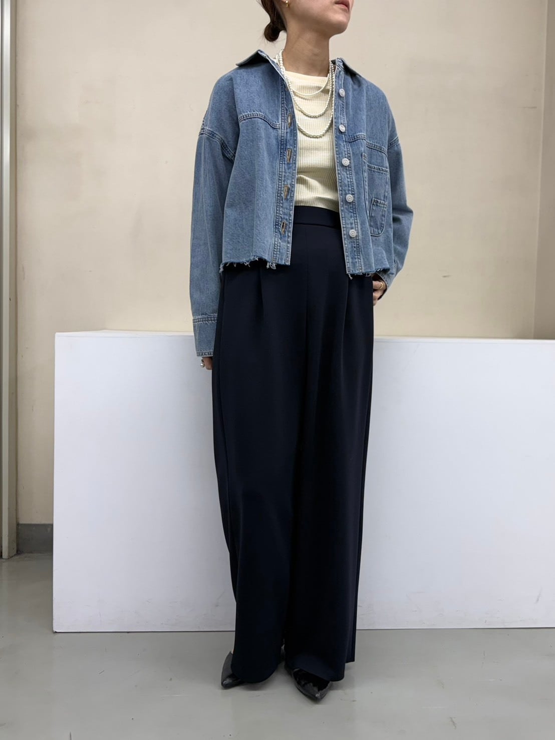 ゆったりとしたボックスシルエットに、柔らかく落ち感のある素材感。クロップド丈がバランスを取りやすく、抜け感のあるスタイリングに仕上がります。