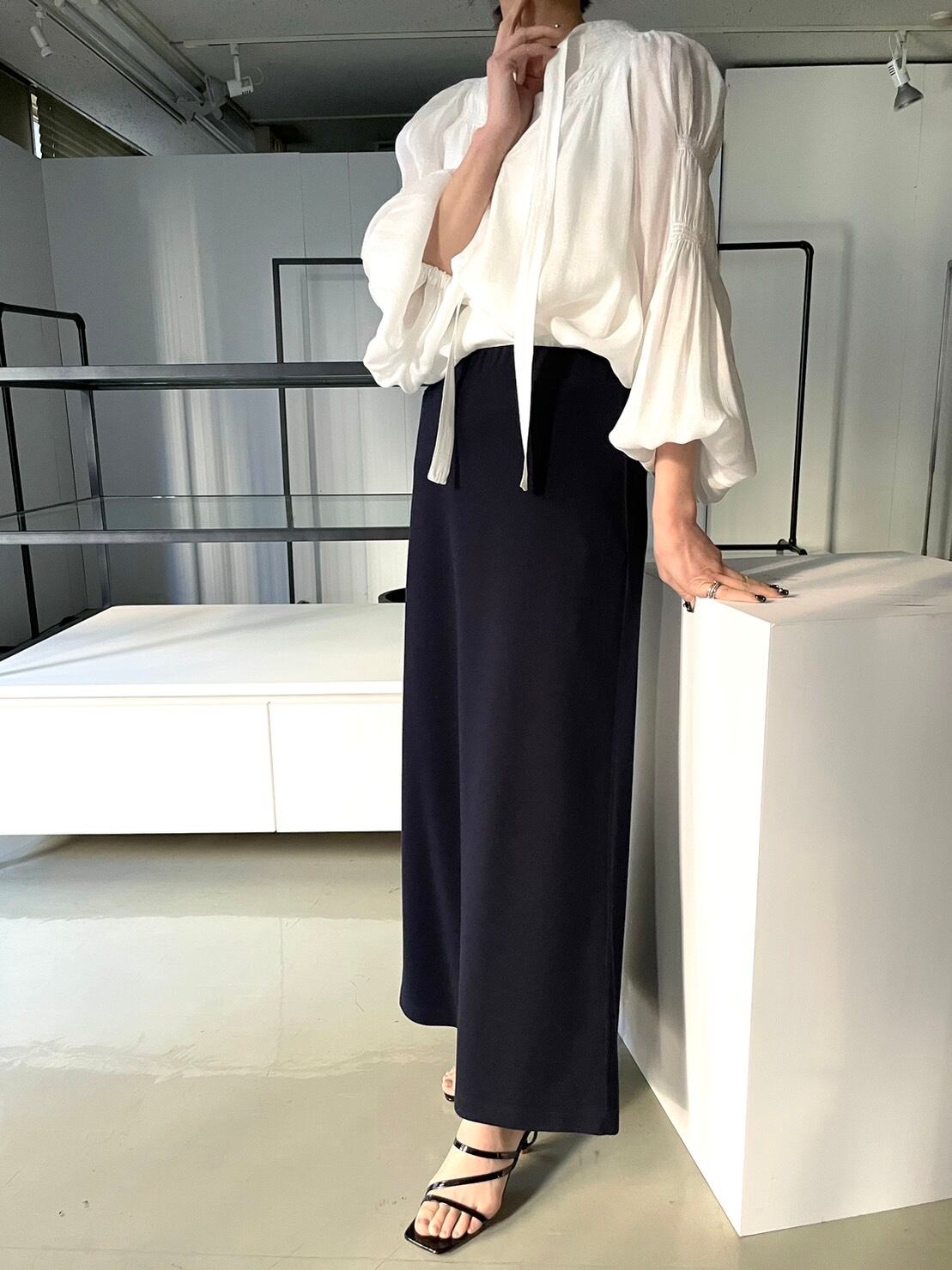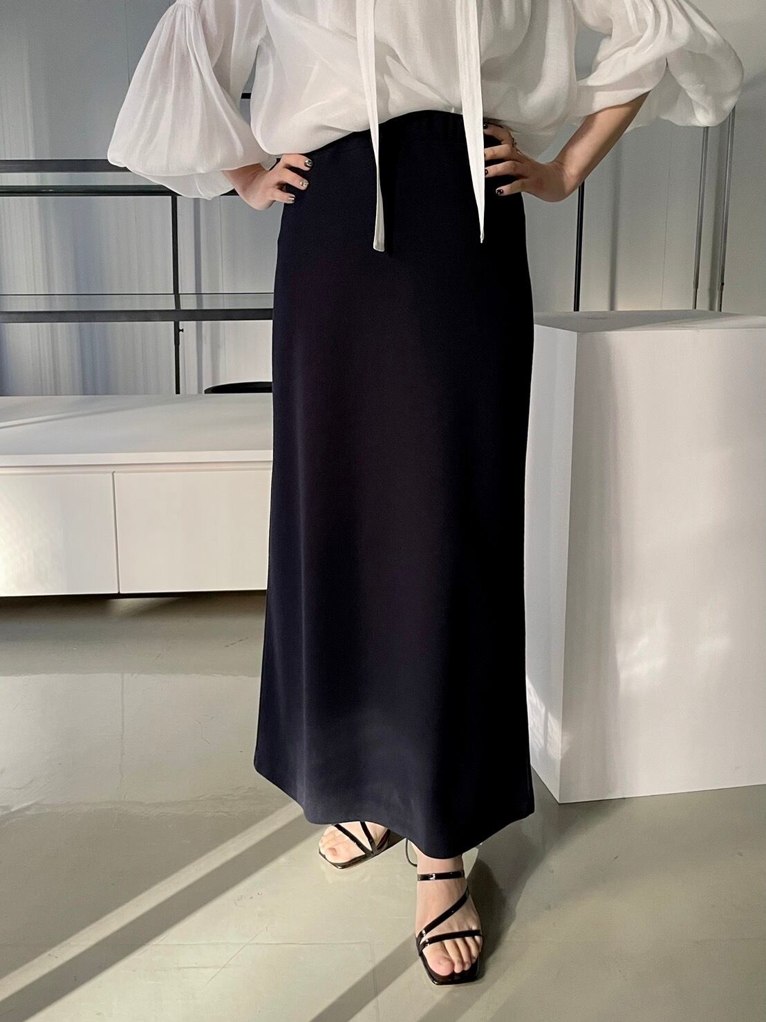 デイリーに使いやすいきれいなシルエットのロング丈スカート。ウエストからヒップあたりまではタイトめにし、裾に向かって少しフレアを出した大人の女性らしいシルエットです。後ろ身頃の裾に施したタックデザインで歩くたびに揺れるフレアラインがポイント。ウエストはゴム仕様のため楽な履き心地です。