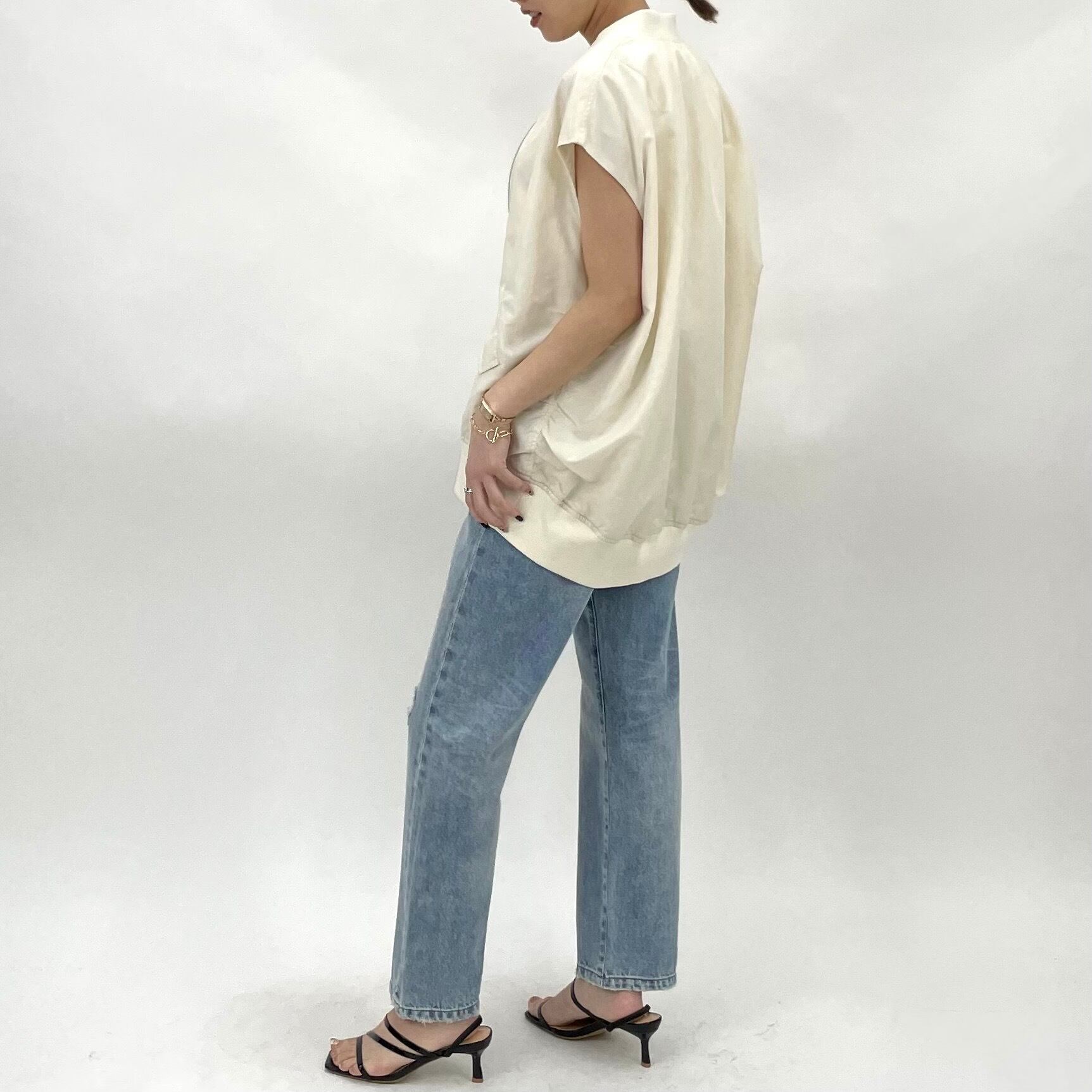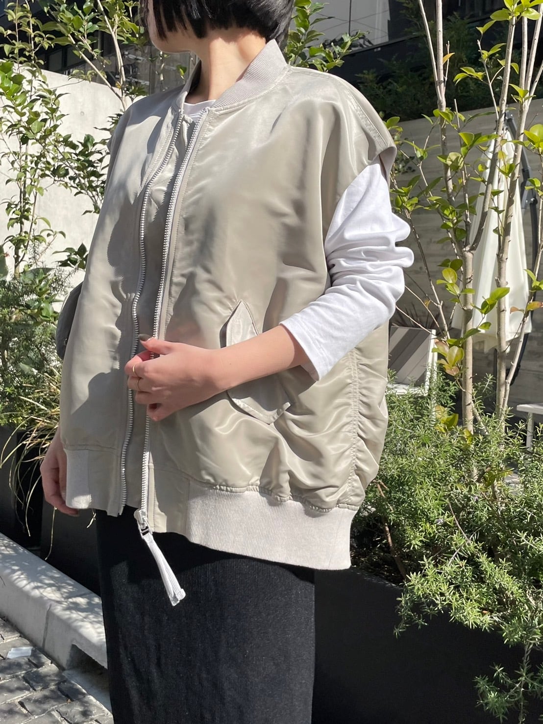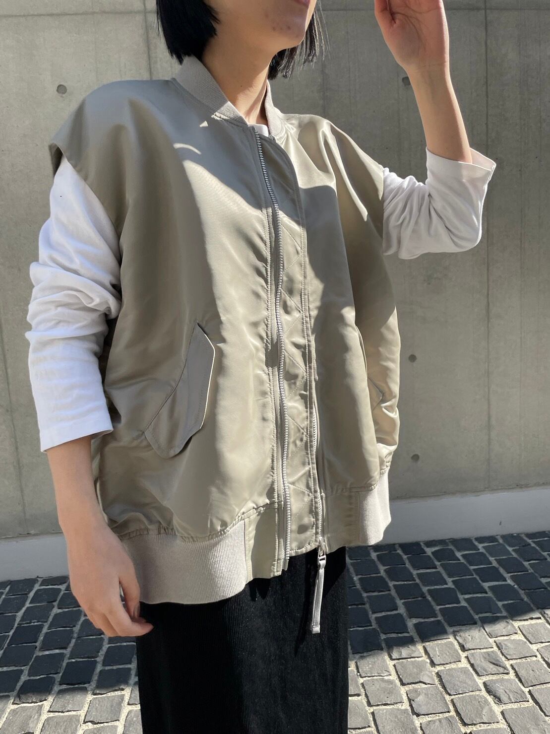 ゆったりとしたサイズ感に前後差をつけた抜け感のあるシルエットのMA-1ベスト。程よいハリのあるナイロン素材を製品で特殊加工を施し、しなやかな風合いに仕上げています。ゆったりめのアームホールのためニットなど、厚手のインナーの上からも着ていただけます。上品な光沢で大人の女性らしい仕上がりに。