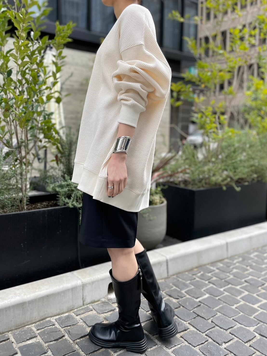 空紡糸のコットンを使用したドライな質感でややしっかりめのワッフル素材。深めのVネックと長めの着丈、ゆったりとしたサイズ感が特徴です。インナーにクルーネックやTシャツと合わせるスタイリングがおすすめです。