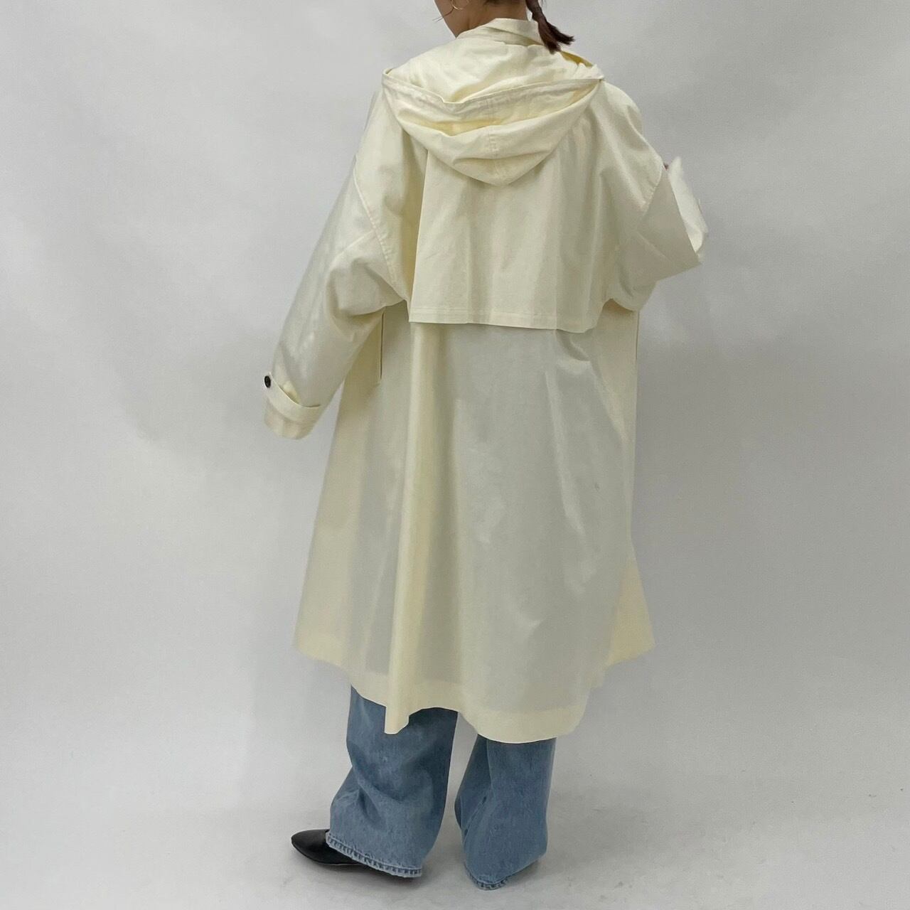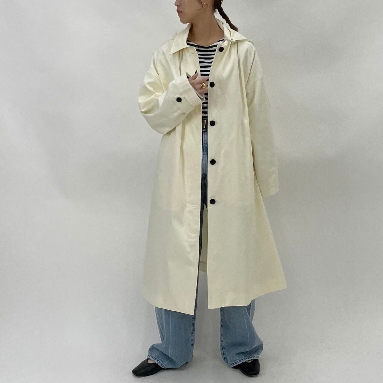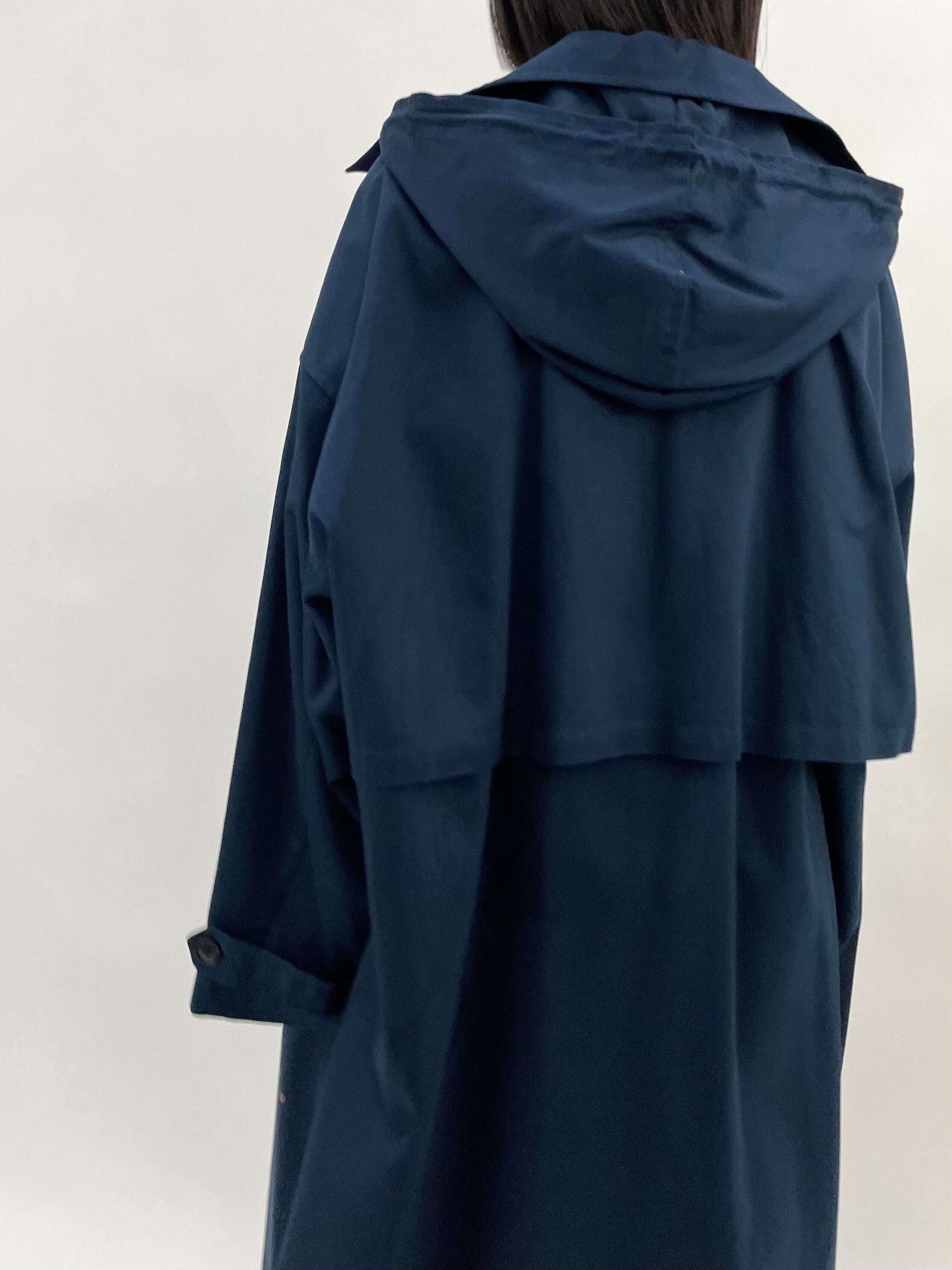背面に大きめのヨークを施し、トラディショナルなトレンチコートの要素を取り入れたロングコート。程よいハリとマットなツヤを兼ね備えた柔らかな風合いのコットンツイル素材です。フードを取り外せる2way。配色ボタンや裏のパイピング仕様もポイントです。ゆったりとしたサイズ感のため厚手のトップスにも合わせて着ていただけます。