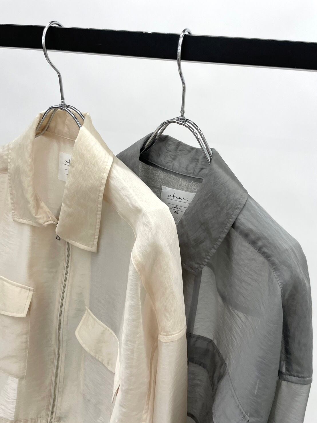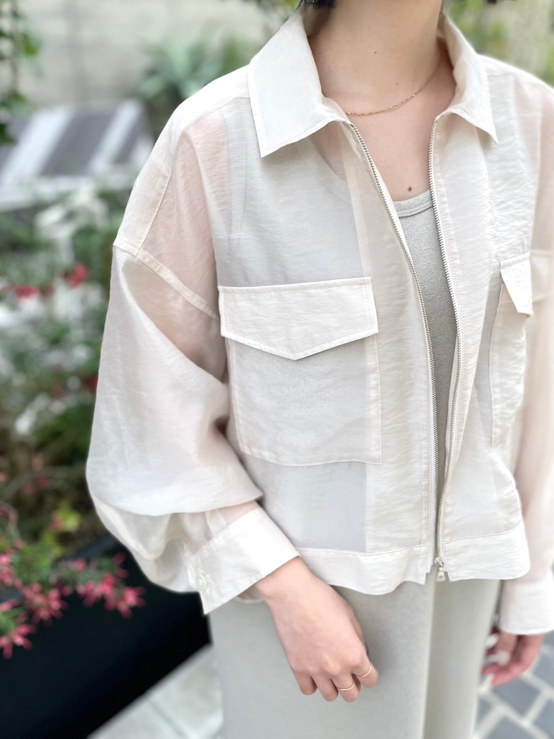 ほんのり光沢と表情のあるシアー素材を使用したジップジャケット。ポケットデザインや衿のあるジップデザインですが透け感があるため、重たくならずクールな印象に!短めの着丈が今年らしい印象で、カジュアルながら女性らしい雰囲気も演出してくれます。薄手の軽やかな素材のためシャツ感覚で羽織っていただけます。イージーケアなのも嬉しいポイント。大人気のワンピースと合わせて着用していただくのもオススメです*