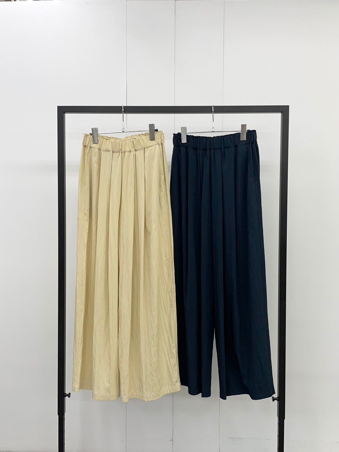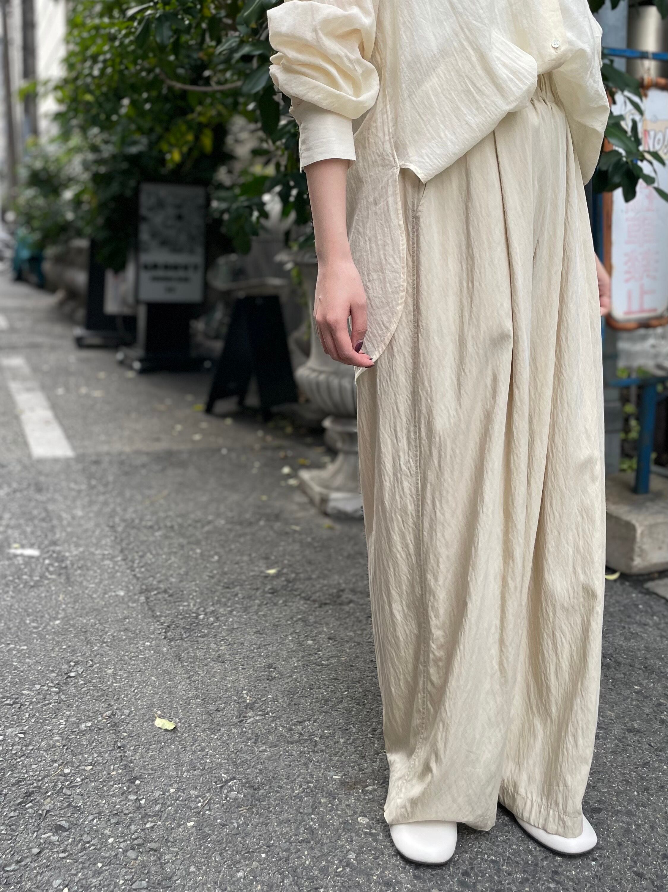 表情のあるコットンナイロン素材を使用したワイドイージーパンツ。ナチュラルな表情とオチ感のある素材です。腰まわりにたっぷりとったギャザ ーでリラックス感のあるシルエットに。程良く光沢もありカジュアルながらも大人っぽい仕上がりです。※ベージュは若干の透けがございます。予めご了承くださいませ。