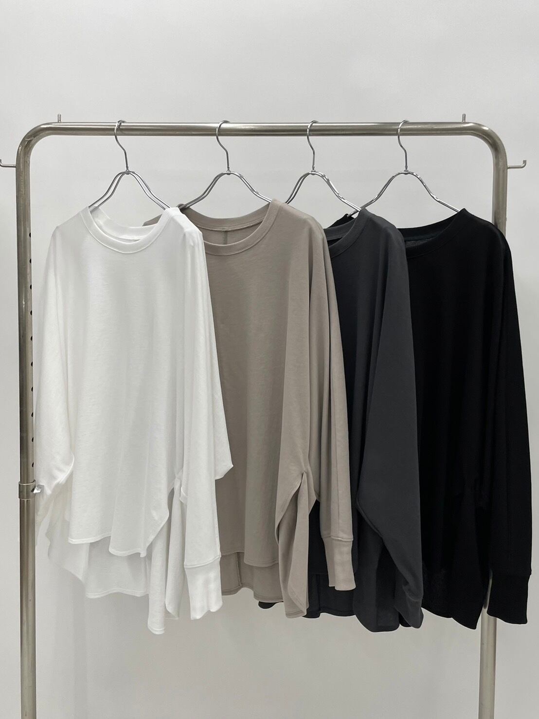 ゆったりとしたリラクシーなシルエットのドルマンスリーブプルオーバー。オーバーなサイジングながらも程よくオチ感のある素材が華奢見え効果をプラスしてくれます。ドルマンスリーブのため脇の部分にゆとりがあり汗染みも気になりづらいです♪シャツテールとバックの切り替えもポイント。同素材スカート(No.425603)とセットアップでの着用もコーディネートが楽ちん、かつお洒落にきまってオススメです!