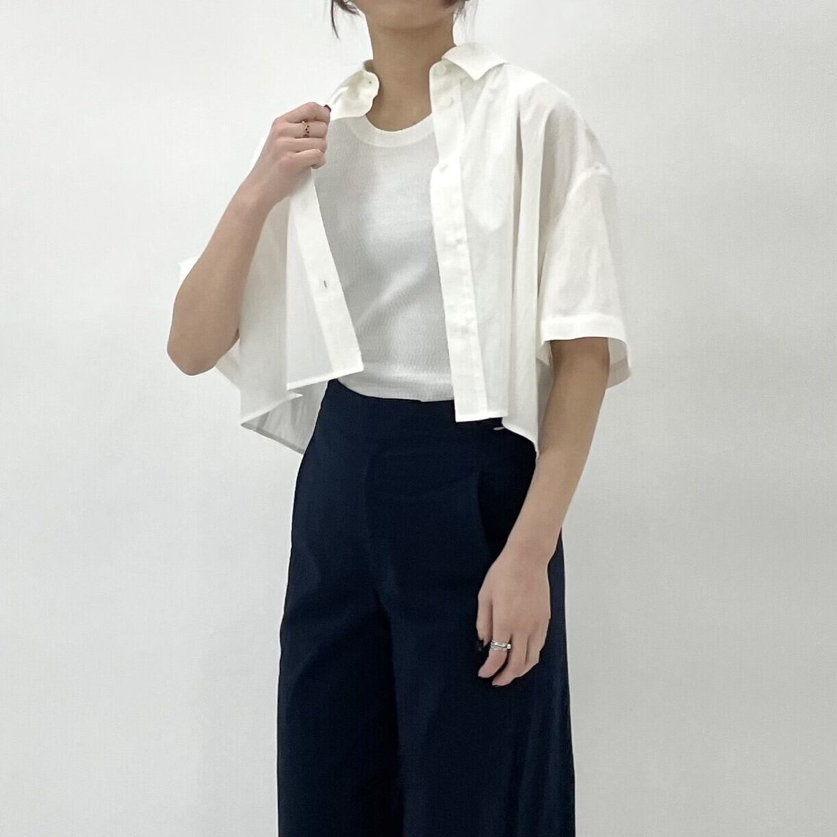 トレンドムード漂うショート丈に仕上げたレギュラーカラーシャツ。程よくハリがあるためショート丈のシルエットが綺麗に出ます。裾に向かってすとんとおちるボクシーなシルエットもポイント。トレンド感はありながら⼤⼈が着こなしやすいシンプルなデザイン。同素材パンツ(No.425607)とセットアップで着用いただくととても格好良く着こなせます。
