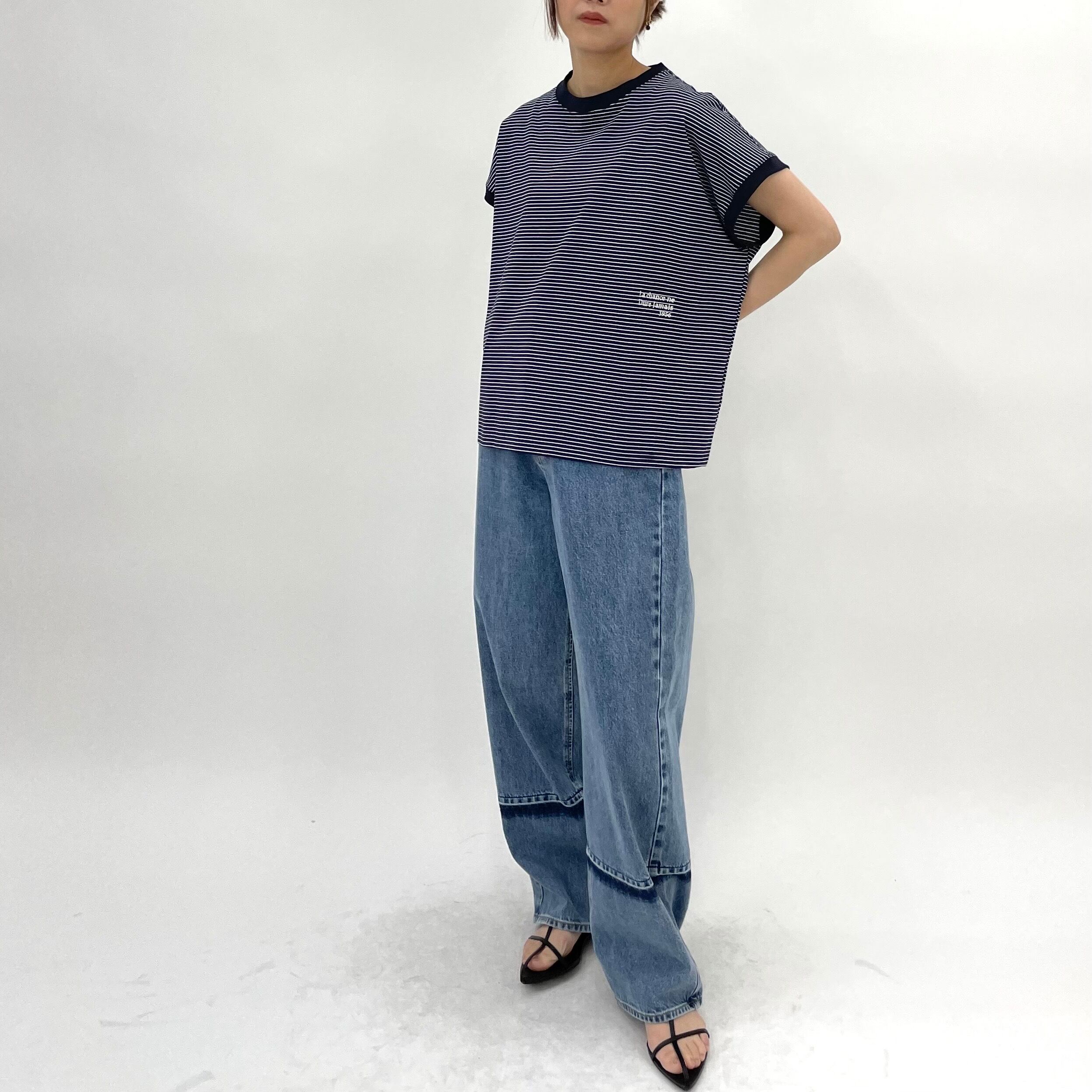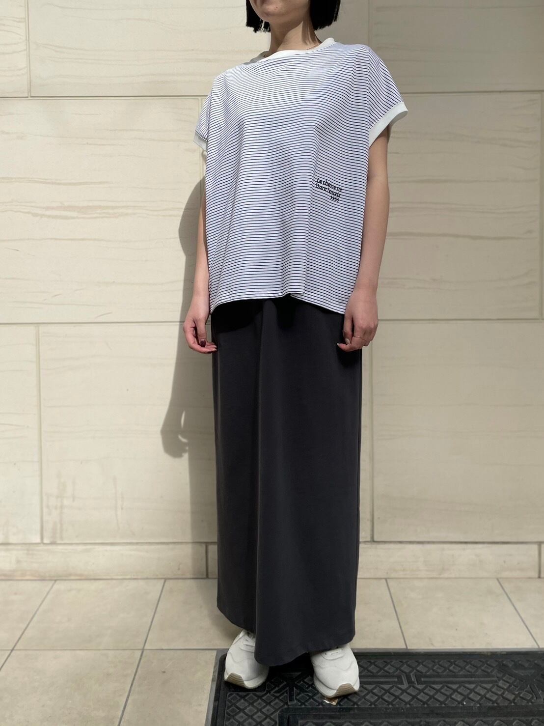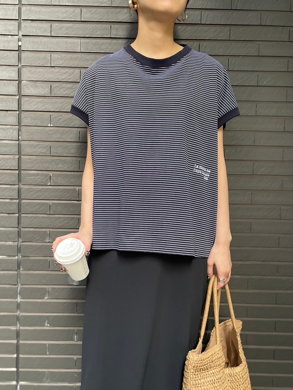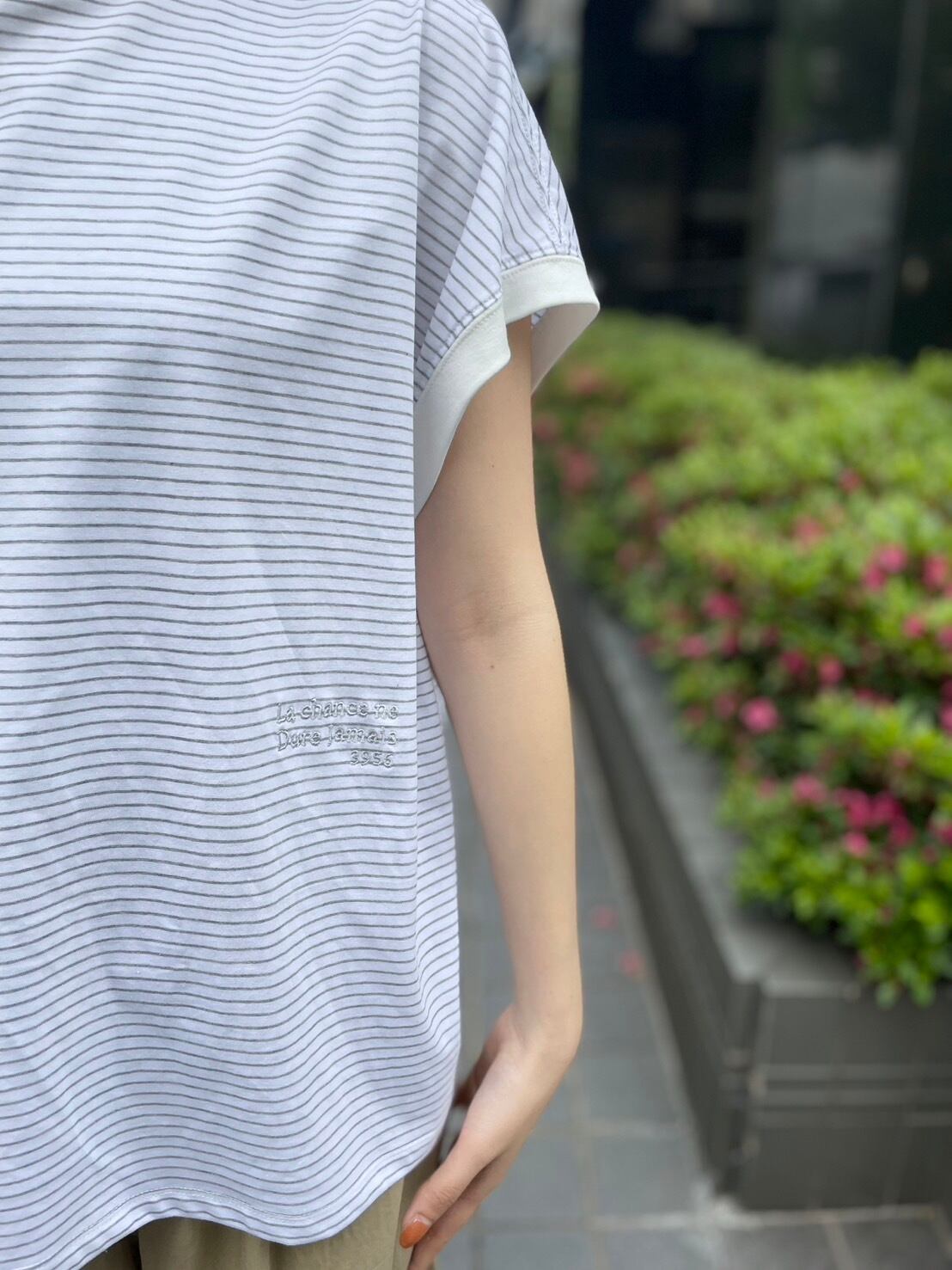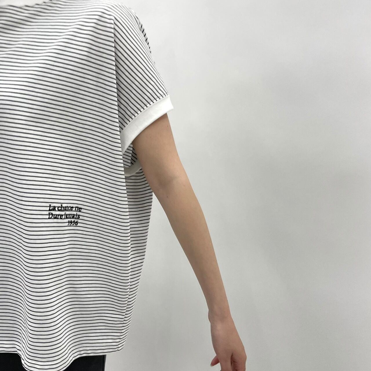 刺繍ロゴがワンポイントのボーダーTシャツ。コットン100%のきれいめの天竺素材はさらっとした肌触りで着⼼地◎程よくゆとりのあるサイジングで抜け感を演出してくれます。オリジナル刺繍は<幸運はいつもある>という意味。