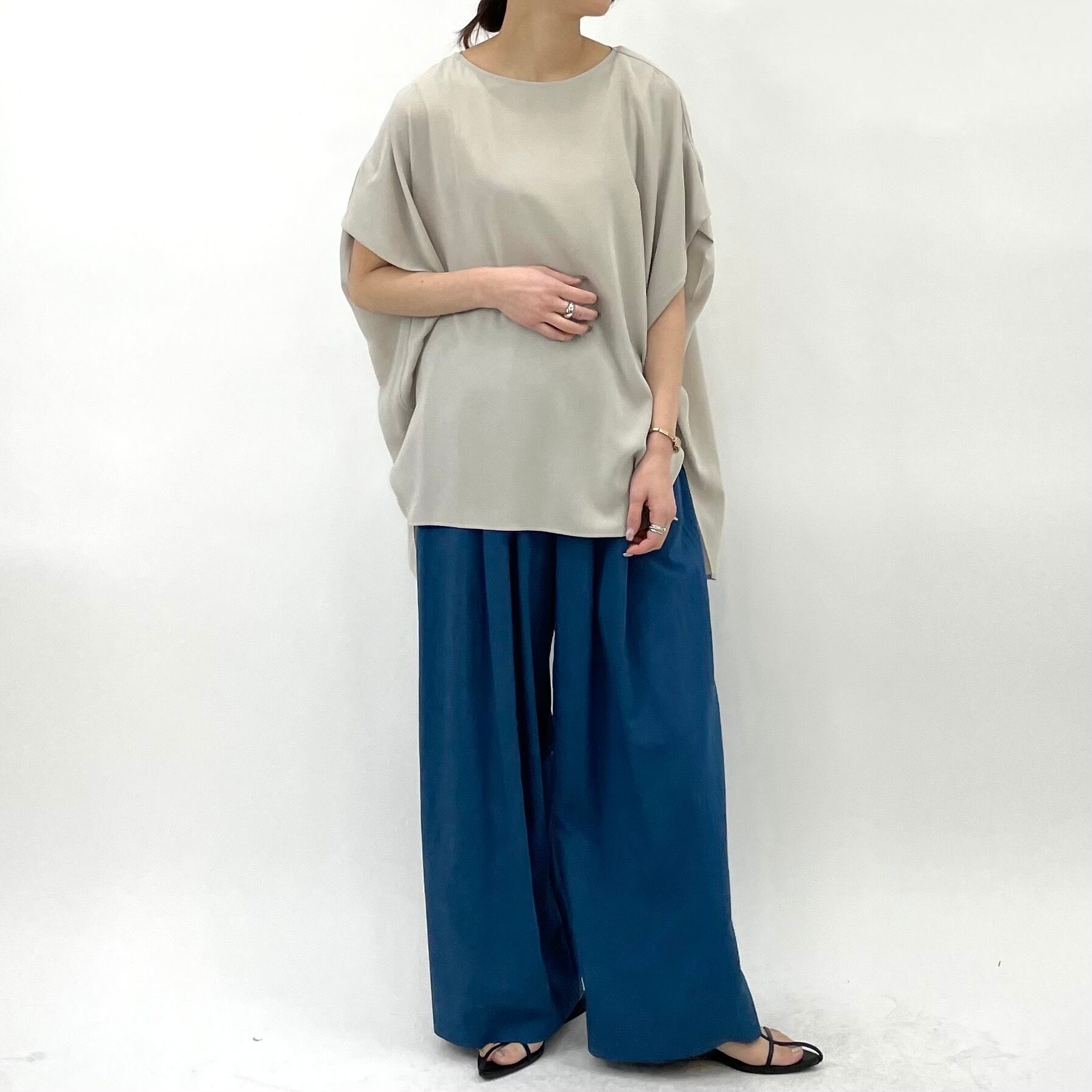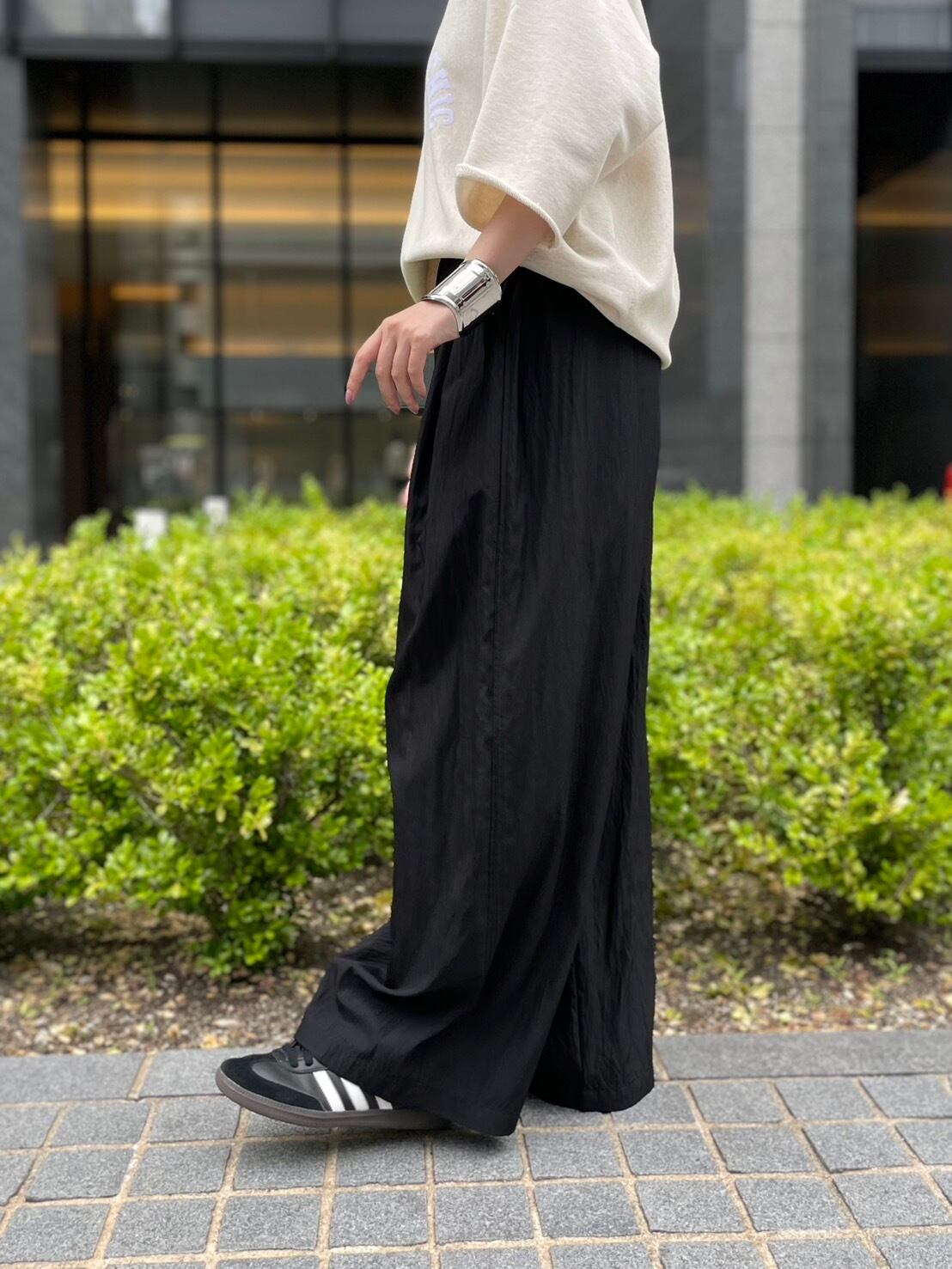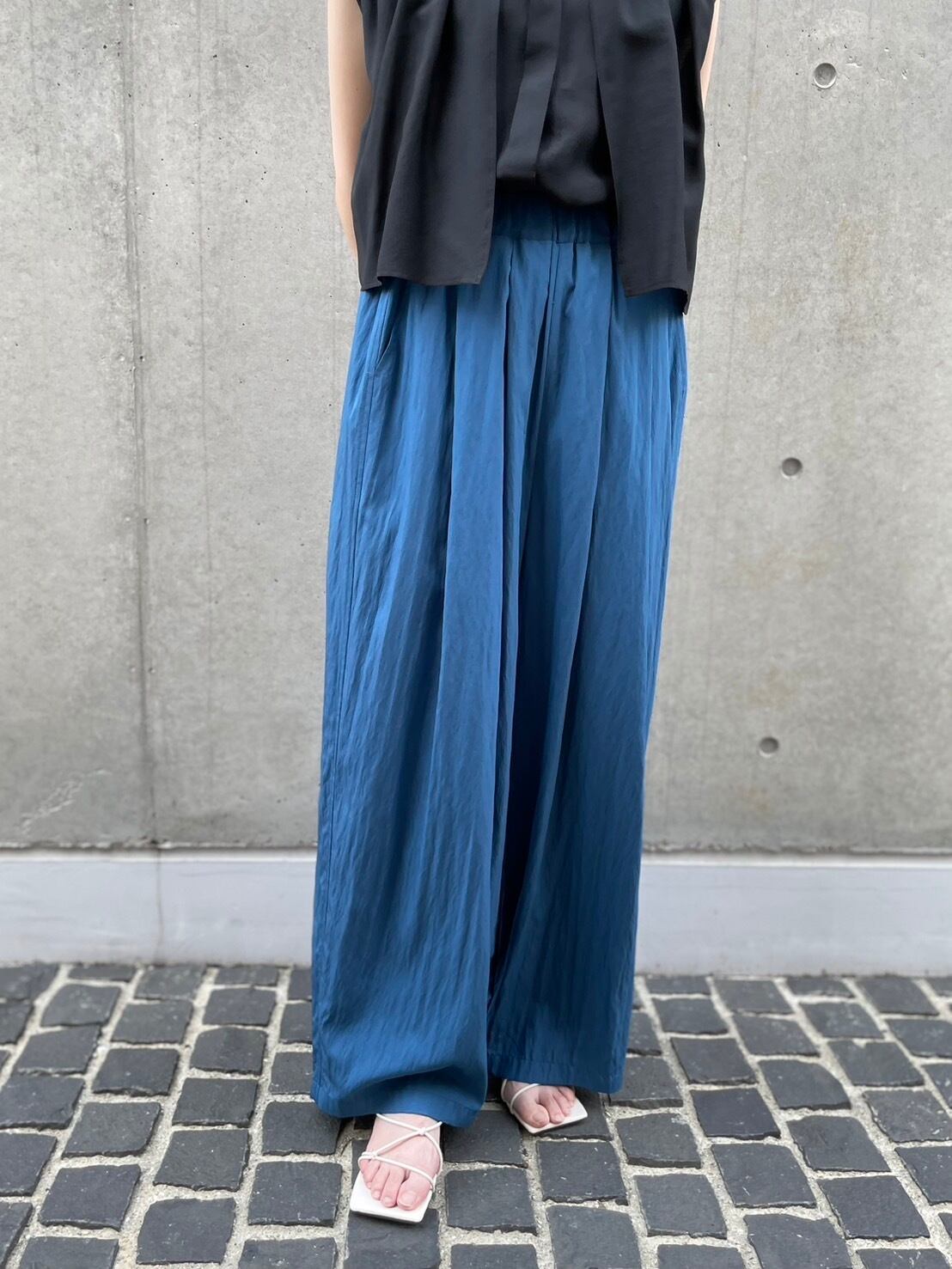 表情のあるコットンナイロン素材を使⽤したワイドイージーパンツ。腰まわりにたっぷりとったギャザーでリラックス感のある印象に。程よい光沢とワッシャー加⼯によるナチュラルな表情とドレープで、カジュアルながらも⼤⼈っぽい仕上がりです。シンプルなTシャツと合わせるだけでも、表情のある素材のためコーディネートがワンランクアップしてくれること間違いなし!