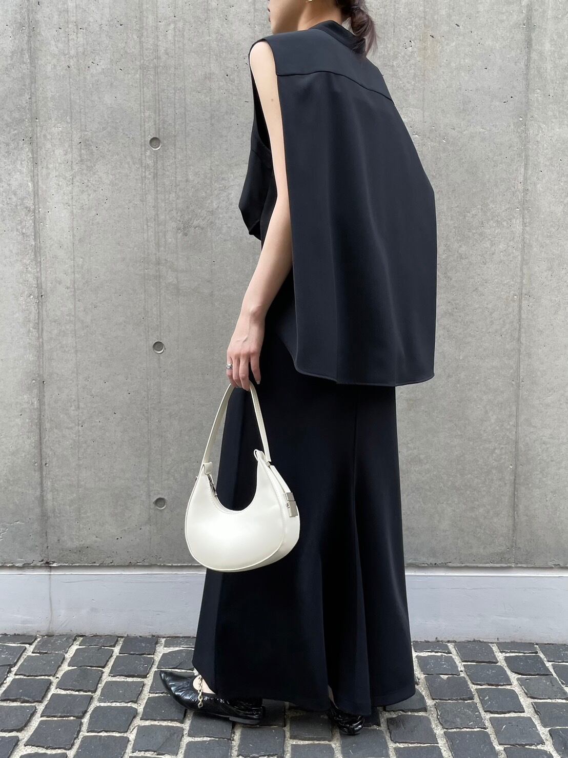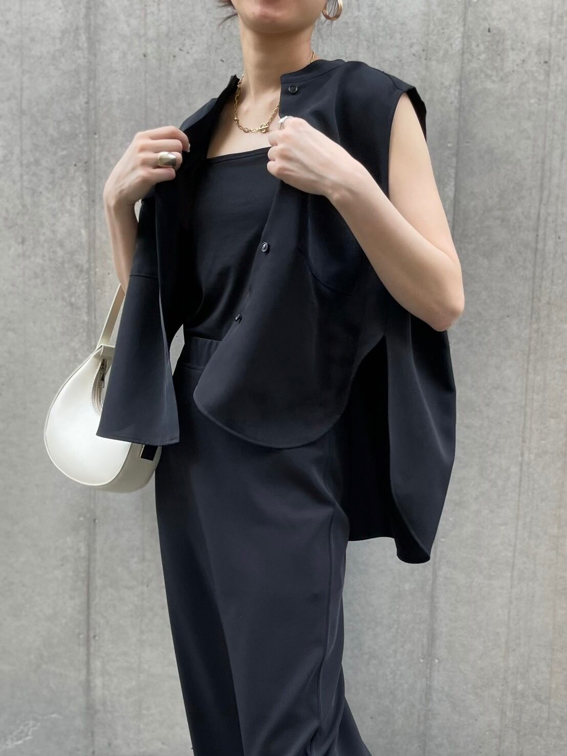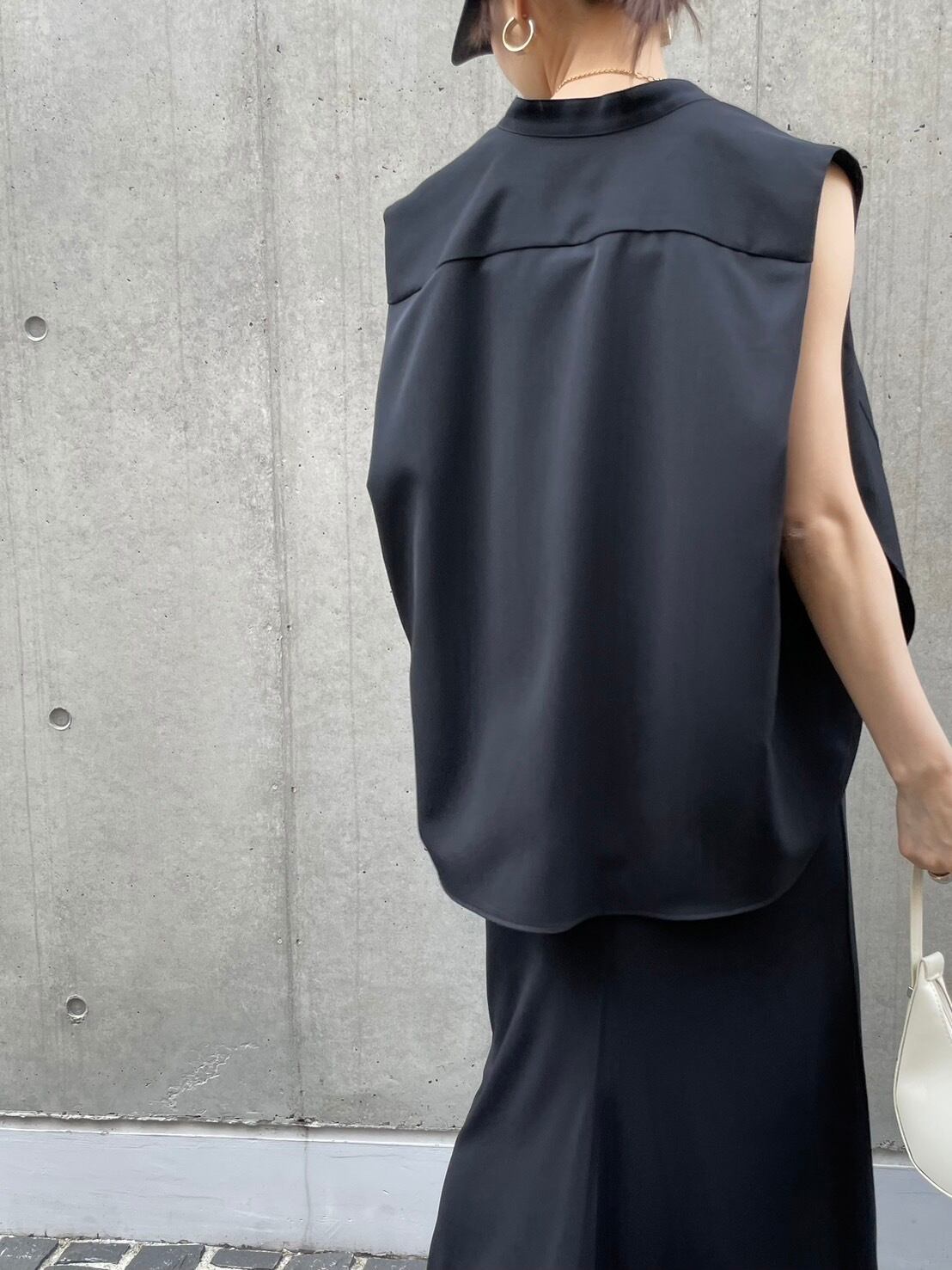 フロントのフラップポケットが特徴のクロップドブラウス。モードな印象で、肩や⼆の腕がすっきりと⾒えるよう作ったアームラインがポイント。暑い日でも二の腕を出すのに抵抗がある…そんな方にもオススメしたいノースリーブアイテムです✡。:フロントのボタンを開けてジレ⾵に着ていただくのもおすすめ◎ドライタッチなポリエステル素材はシワになりづらくご家庭で洗えて乾きやすいのも魅力的です!