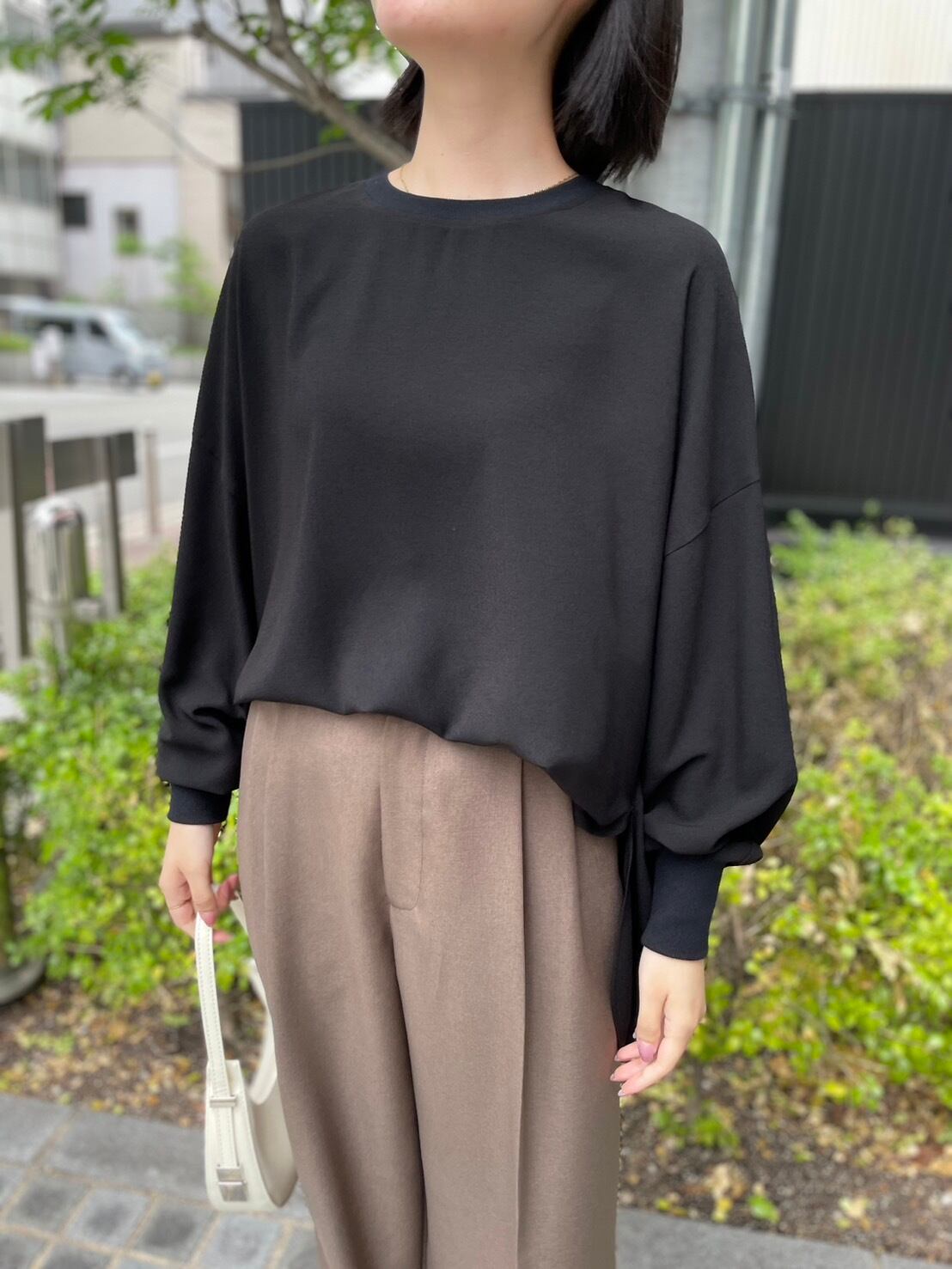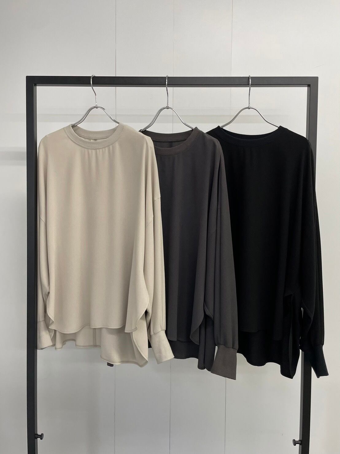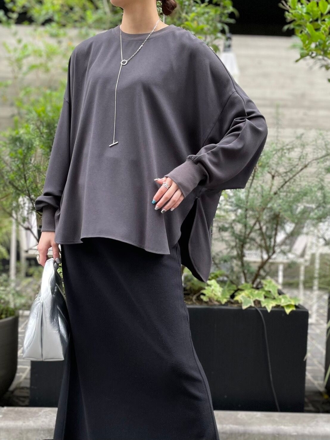 トリアセテートの美しいドレープ性にパウダリーな膨らみをプラスしたジョーゼット素材のドルマンスリーブプルオーバー。オーバーなサイジングながらもオチ感のある素材のため華奢⾒え効果も!シンプルなデザインですがシャツテールのデザインで⼥性らしい抜け感のある仕上がりに。袖⼝はリブ仕様のため袖をたくし上げて着るときにソフトにフィットしてくれます。