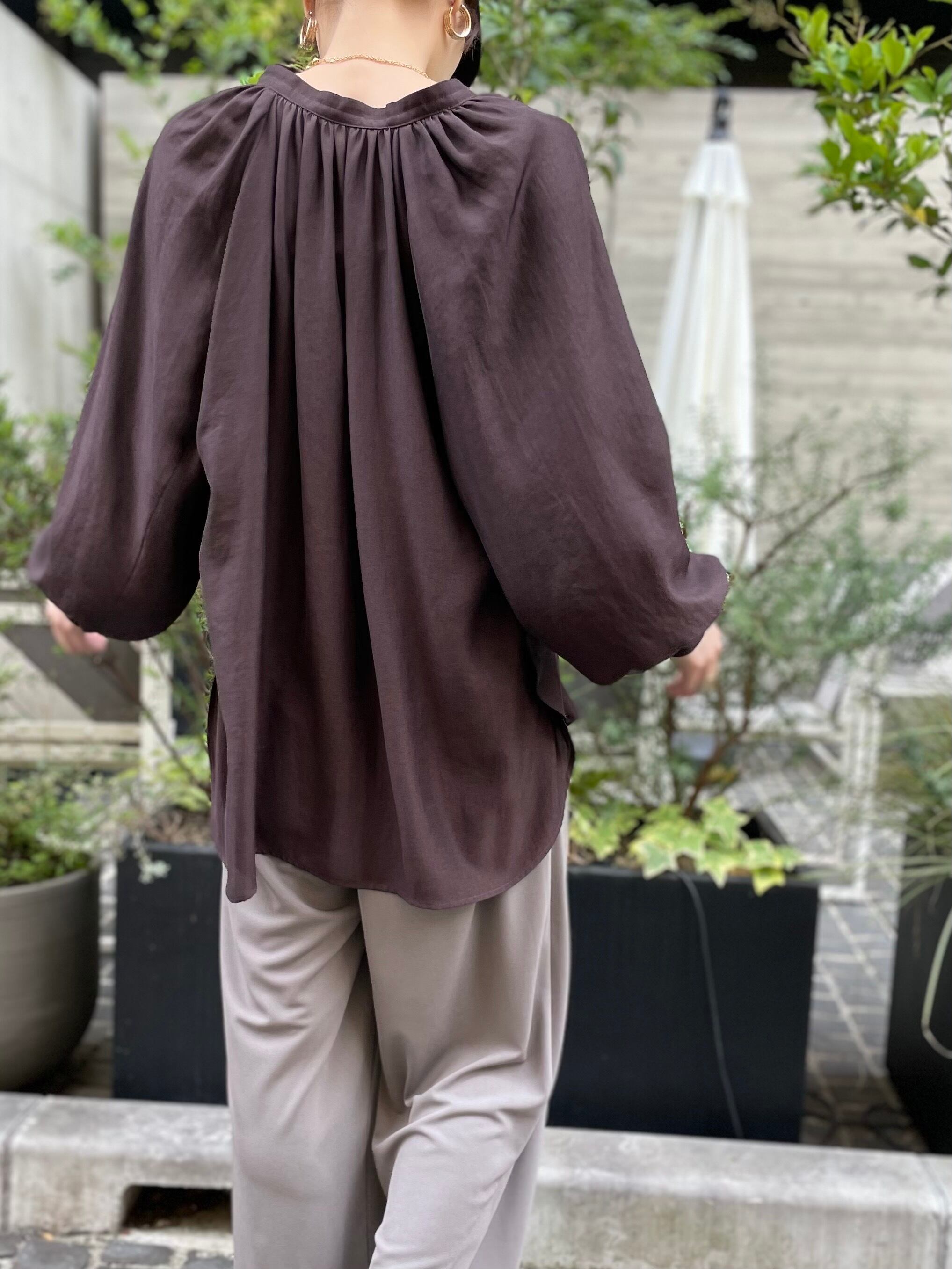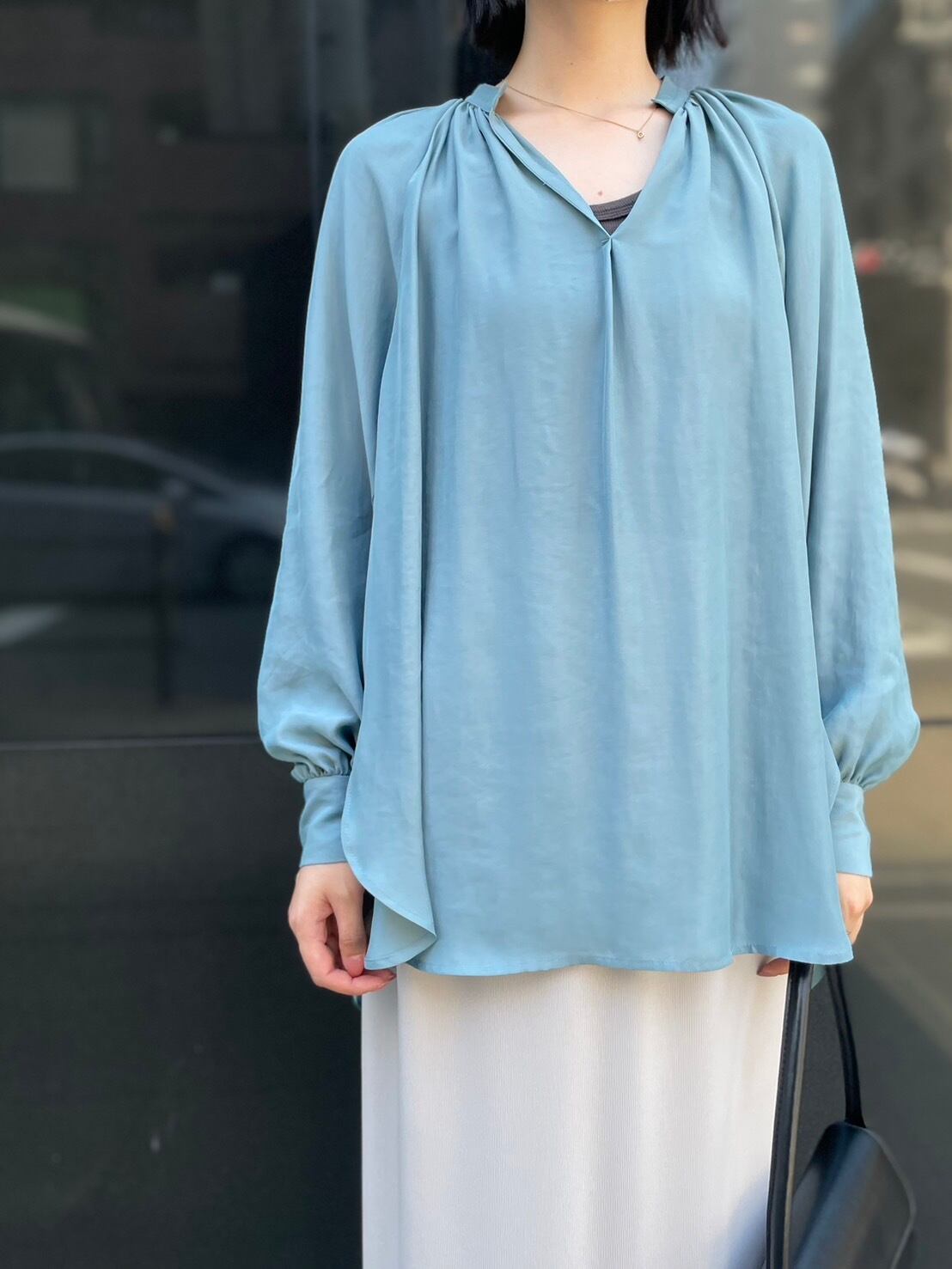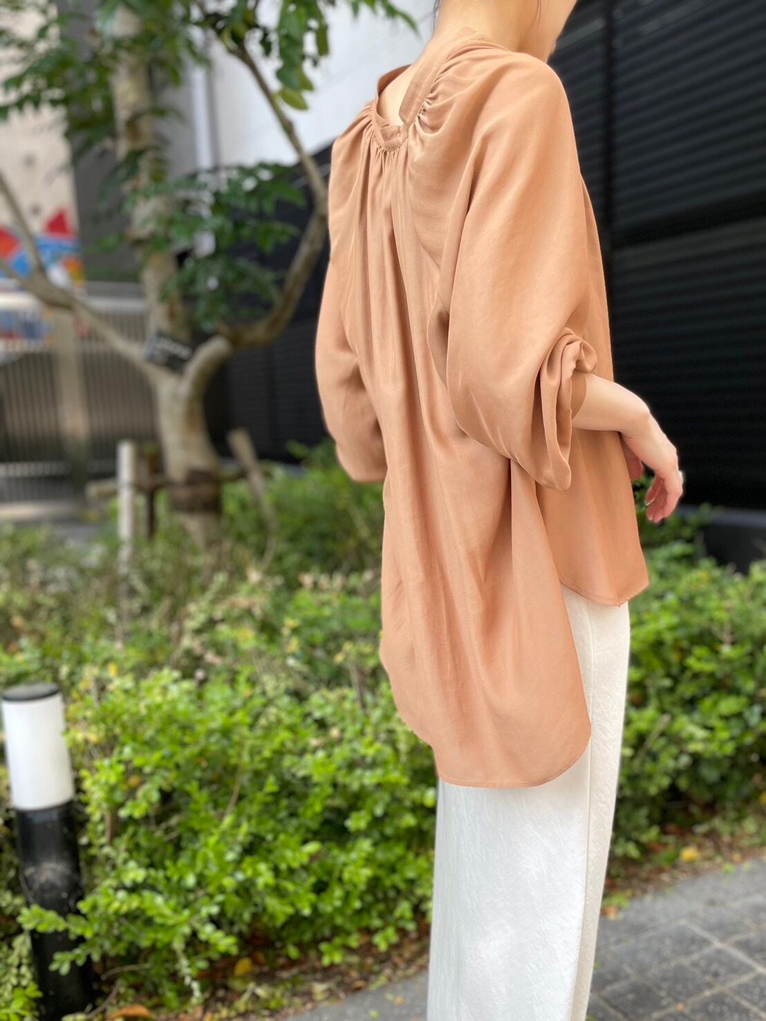エアリーでふんわりと柔らかなシルエットが⼥性らしいギャザーブラウス。特殊な加⼯を施したドライタッチでオチ感のあるナチュラルな⾵合いの素材は、肌に優しく馴染み着⼼地◎とってもきれいな素材でエレガントな一枚ですが、実は袖⼝の⼀部にシャーリングゴムを⼊れているため袖をたくし上げて着る時にはソフトにフィットしてくれます!洗い物をするときやお子様とお出かけをするときなど、デイリーなシーンにもちゃんと安心して使える一枚です◎