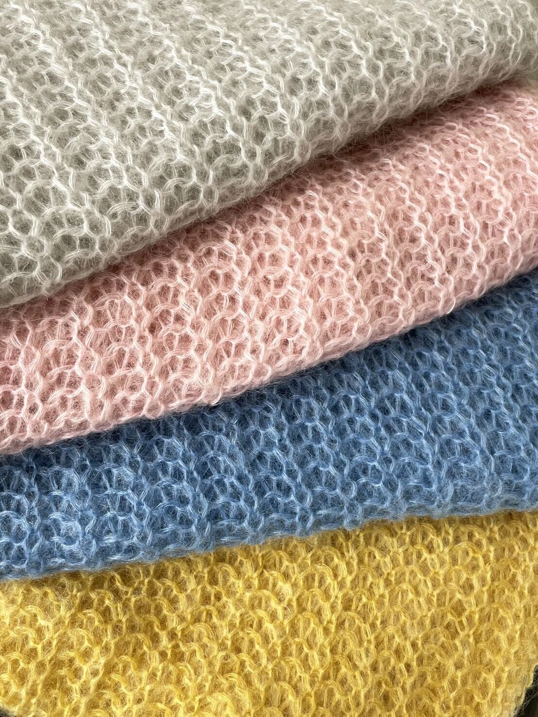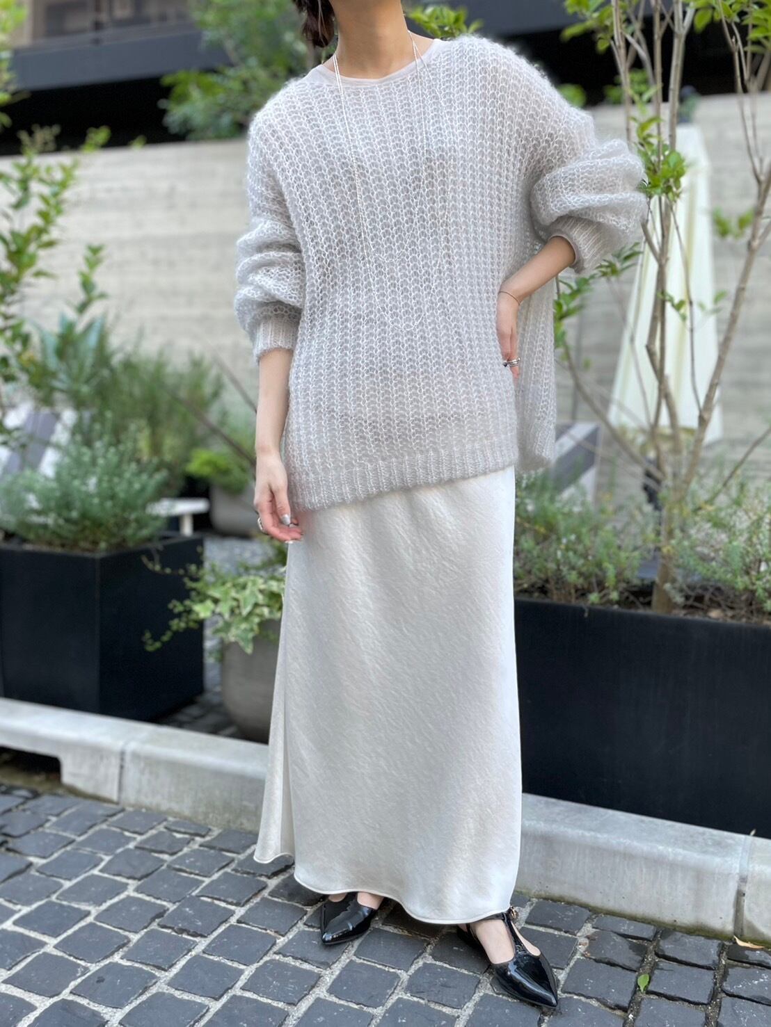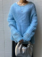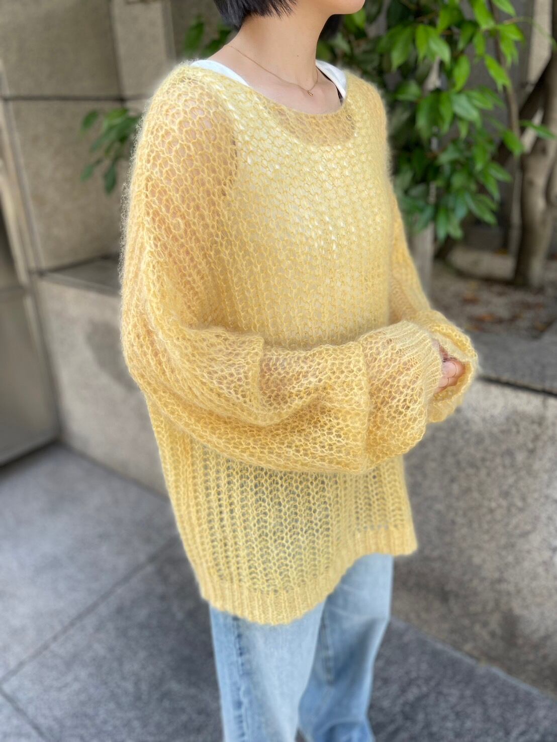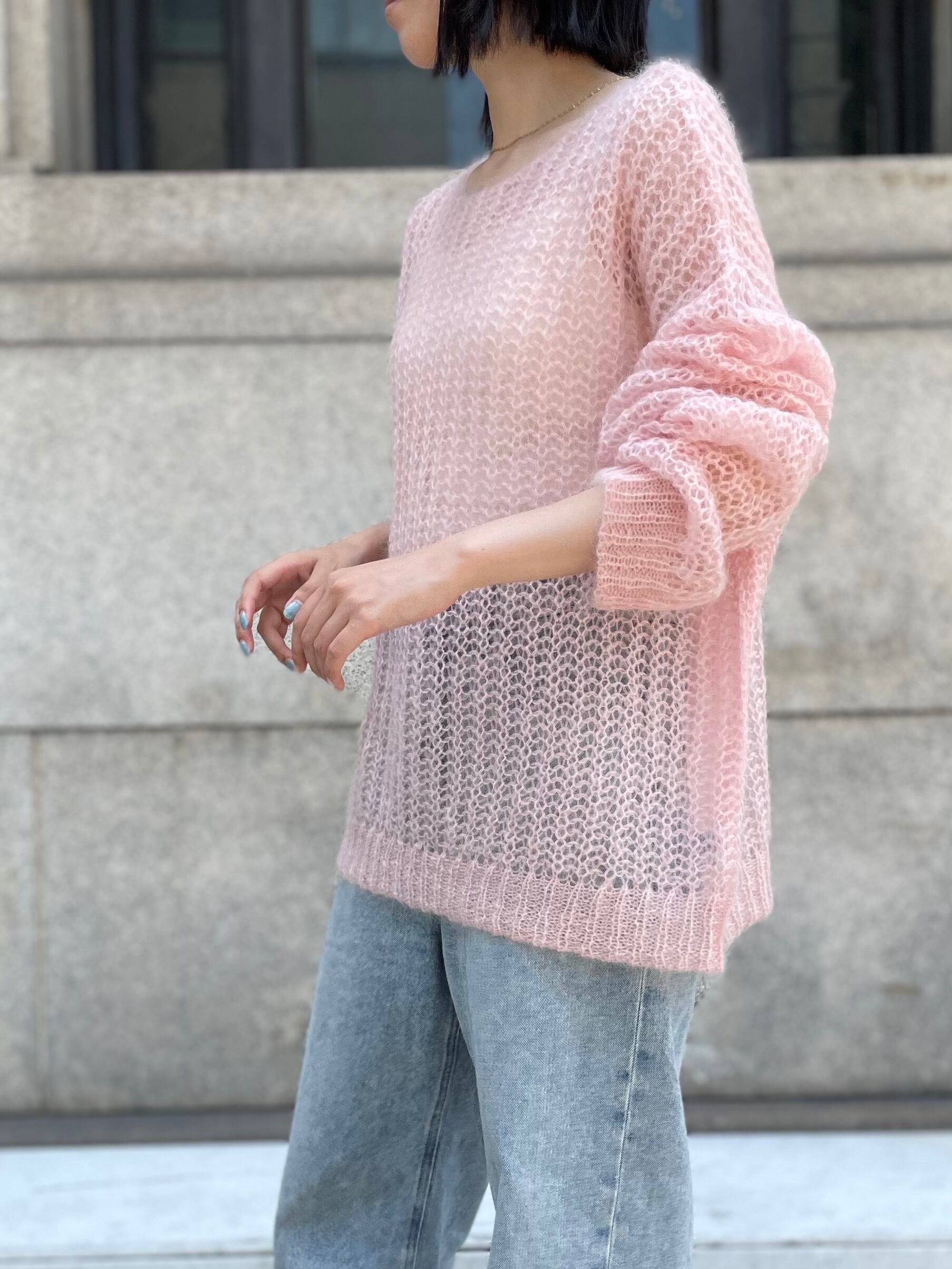 上質なキッドモヘア⽷を使⽤したニットプルオーバー。ゆったりとしたサイズ感にやや広めのネックラインが程よい抜け感をプラス。首元は華奢見えし、袖口は広くしたワイドスリーブでラフに着られるのが魅力✨ざっくりと編んだシアー感のある編み地も特徴で⼥性らしいカラー展開もポイントです!᛭*どのカラーにするか悩んでしまうほど、どれも合わせやすいお色味となっております◎初秋から春にかけてロングシーズン活躍してくれる、重宝すること間違いなしのアイテムです♪