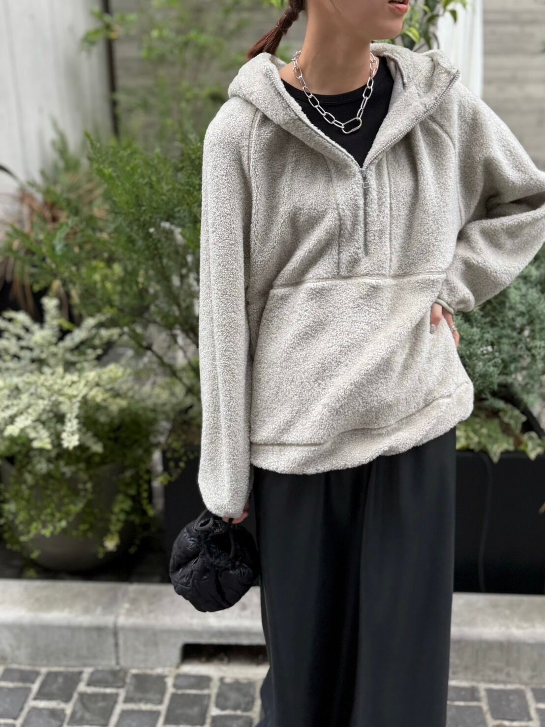 アウターのような役割をしてくれて冬まで活躍すること間違いなしのハーフジップボアプルオーバー。国内の希少な機械で仕上げたパイルジャージ素材を使用しています。裾にゴムシャーリングを⼊れて少し丸みを帯びたシルエットに仕上げているためカジュアルながらも⼥性らしく着こなしていただけます✨