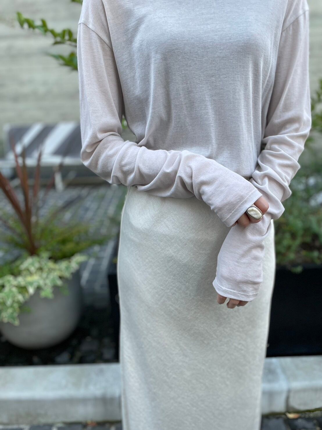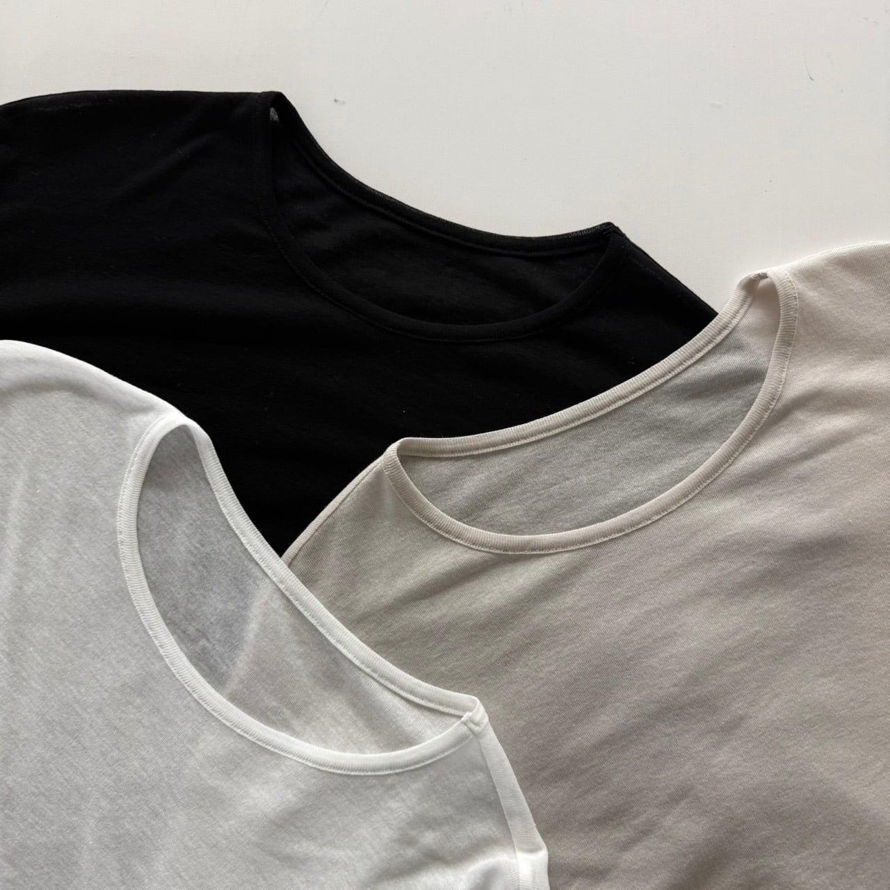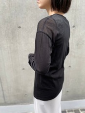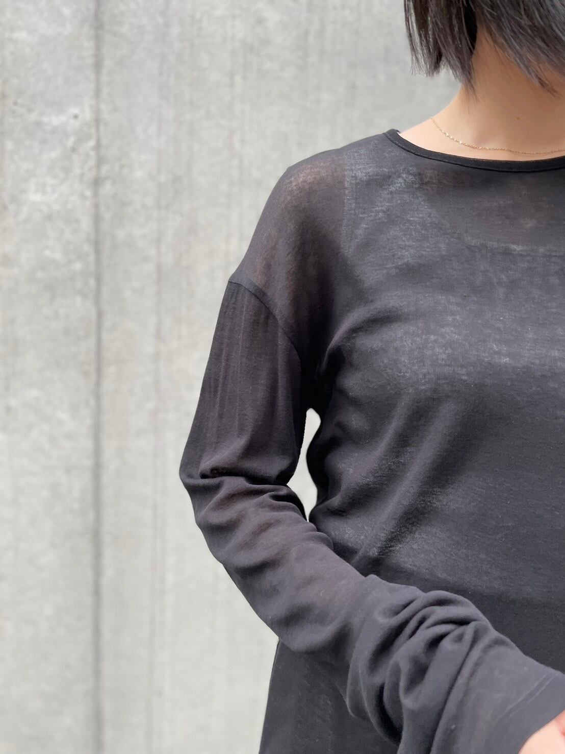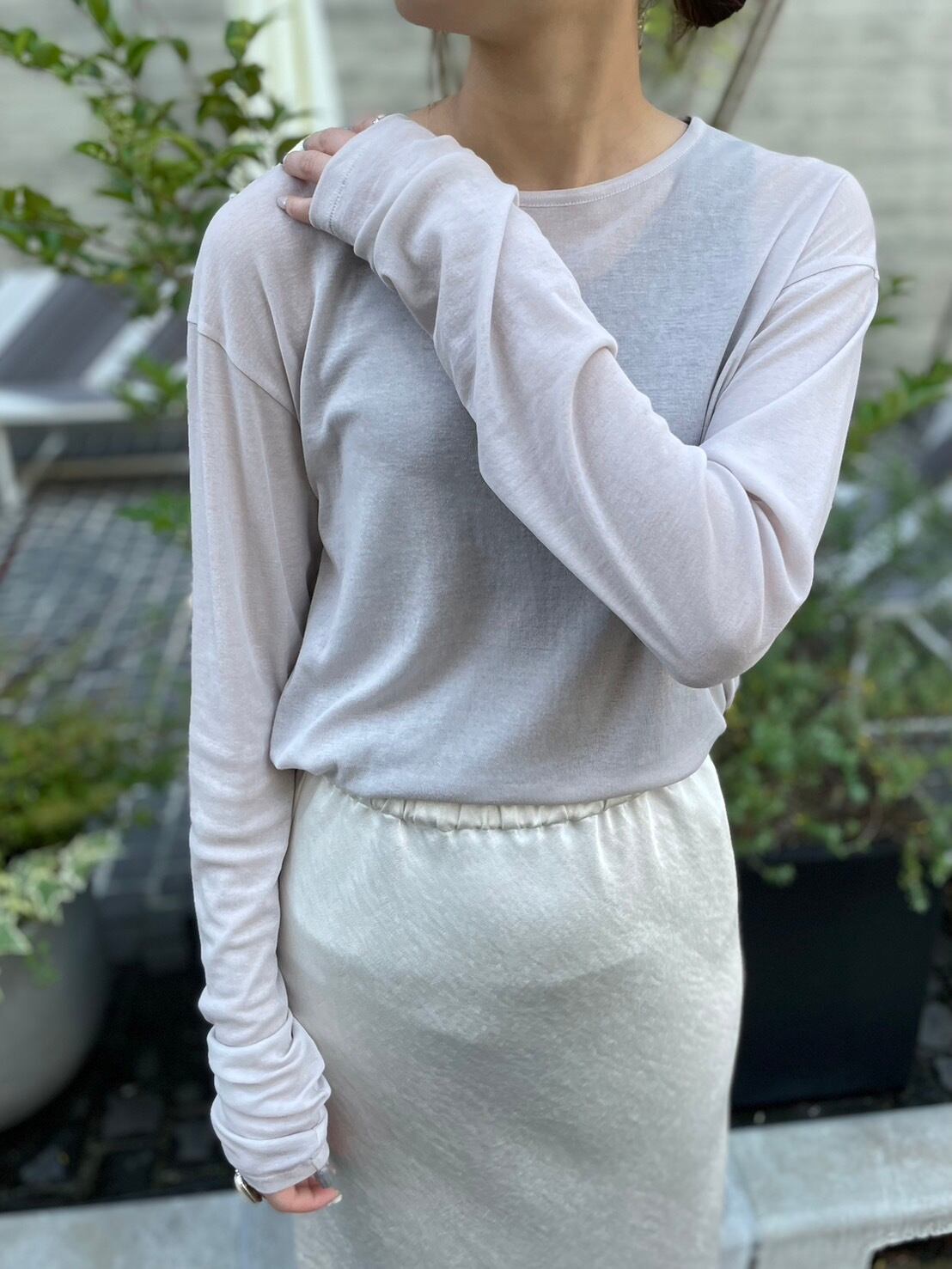 程よいシアー感で⼀枚着としてもインナーとしても取り⼊れやすいロングTシャツ。コットン100%のガーゼ素材で着⼼地◎オールインワンやジャケットのインナーとしてはもちろん、ゆるっと一枚で着ても◎肌に優しく馴染んでくれてとっても良い肌触り⸜❤︎⸝ゆとりのあるサイジングで袖を⻑めにすることでレイヤードしたときもサマになるように仕上げています。シンプルでありながらもやや広めの襟ぐりで程よくこなれた印象に。