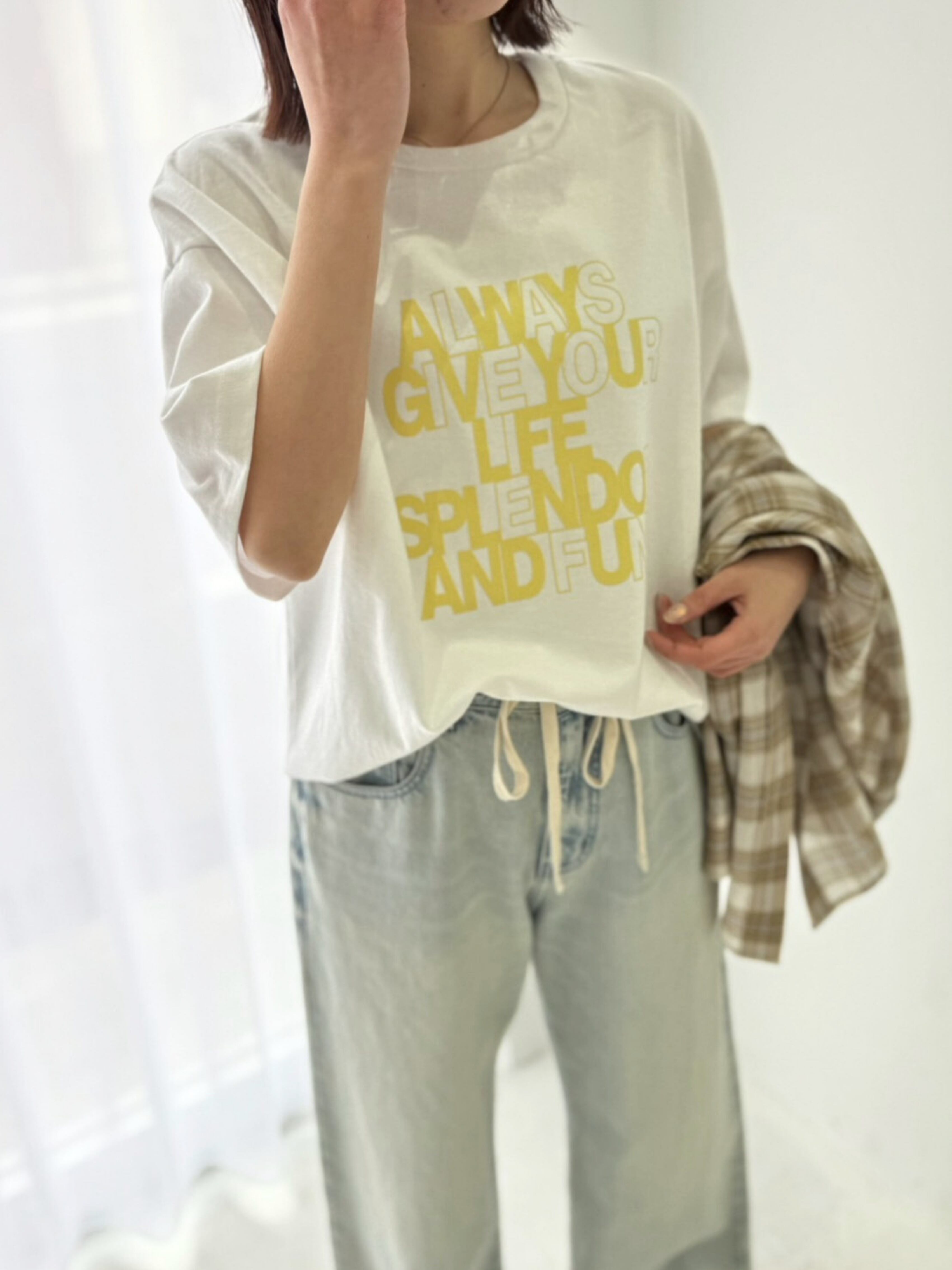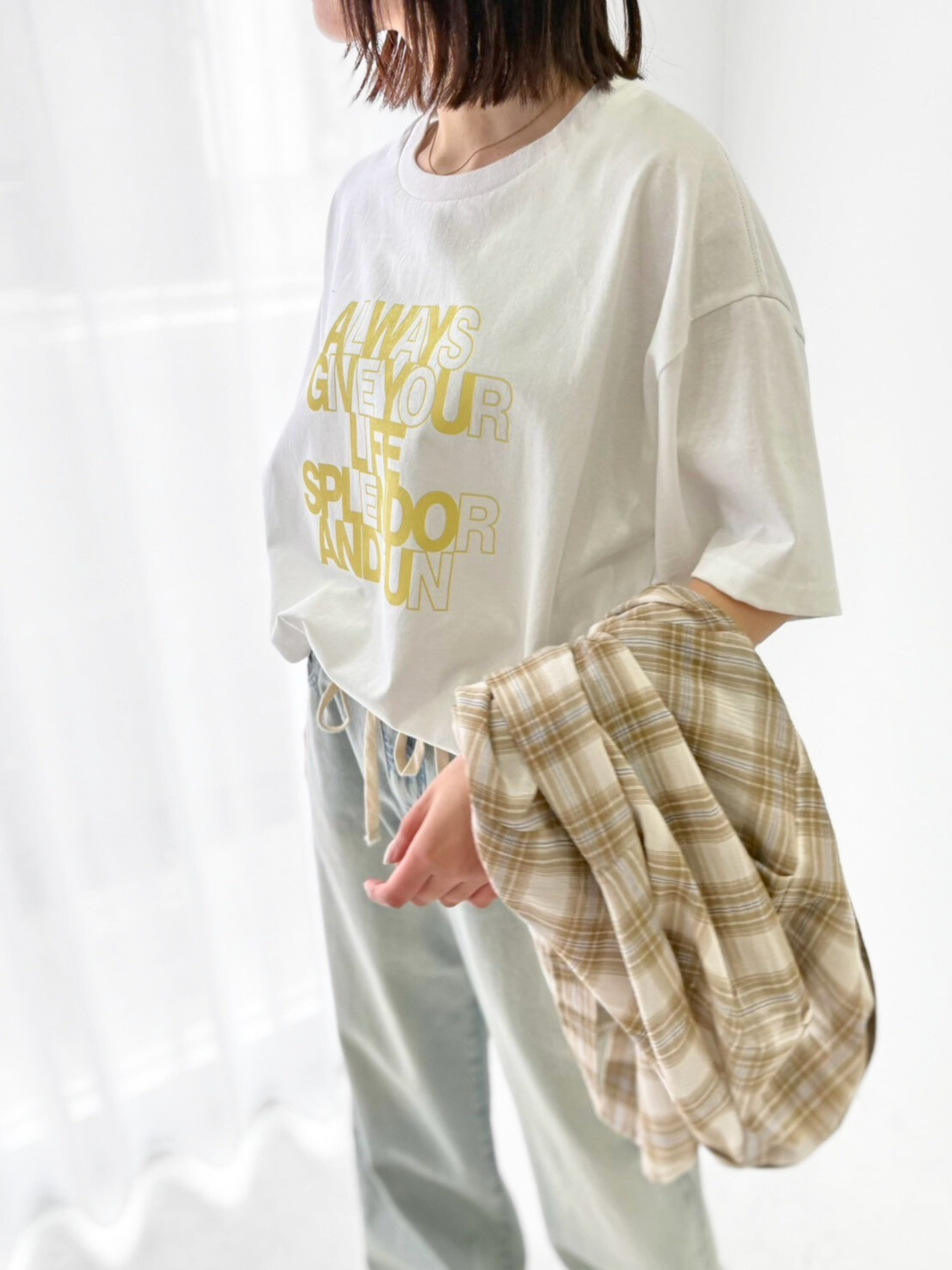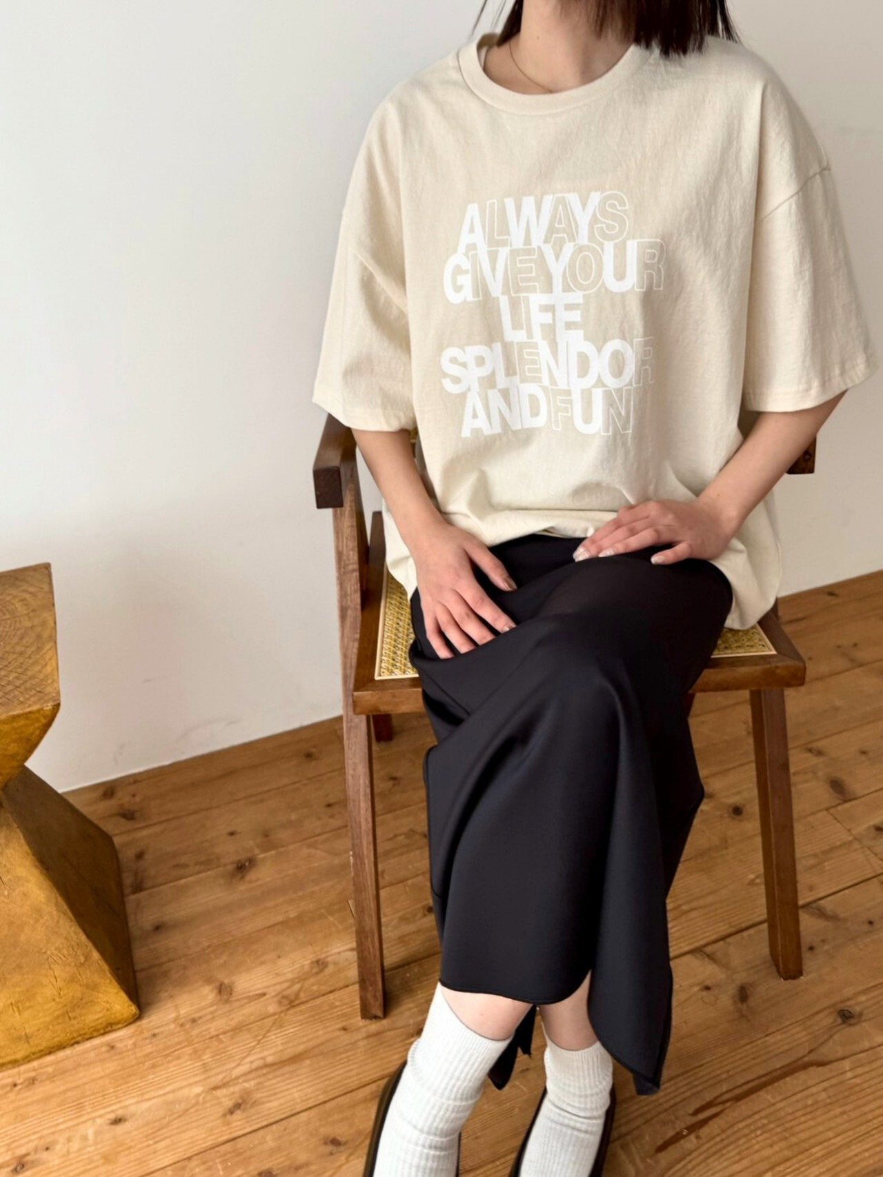 肌触りの良いソフトな⾵合いのコットン天竺を使⽤したロゴTシャツ。ロゴの字体や配置に拘った一枚です。優しくナチュラルな印象でカジュアル派さんには特にオススメのTシャツです♡*お袖を少し折り返したり、少しインをするだけでも雰囲気の変わる、絶妙なサイズ感もポイントです!