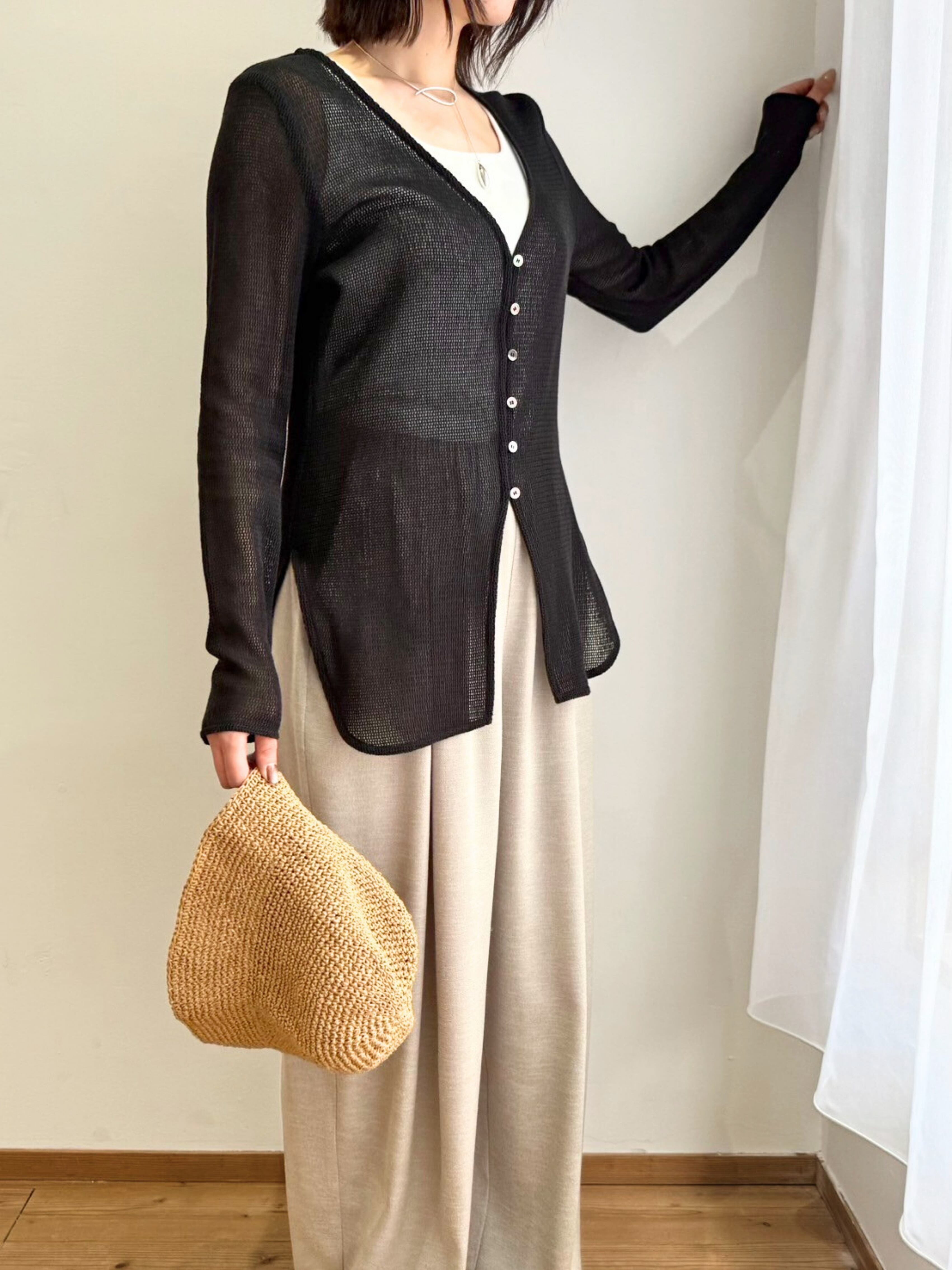 ソフトな⾵合いのメッシュ素材を使⽤したVネックブラウス。さらっとした肌触りの着⼼地の良いメッシュ素材は上品な透け感もポイント。⽻織としてはもちろんボタンを留めた⼀枚着⾵の着こなしもおすすめ。腰回りが隠れる⻑めの着丈で体型カバーも◎
