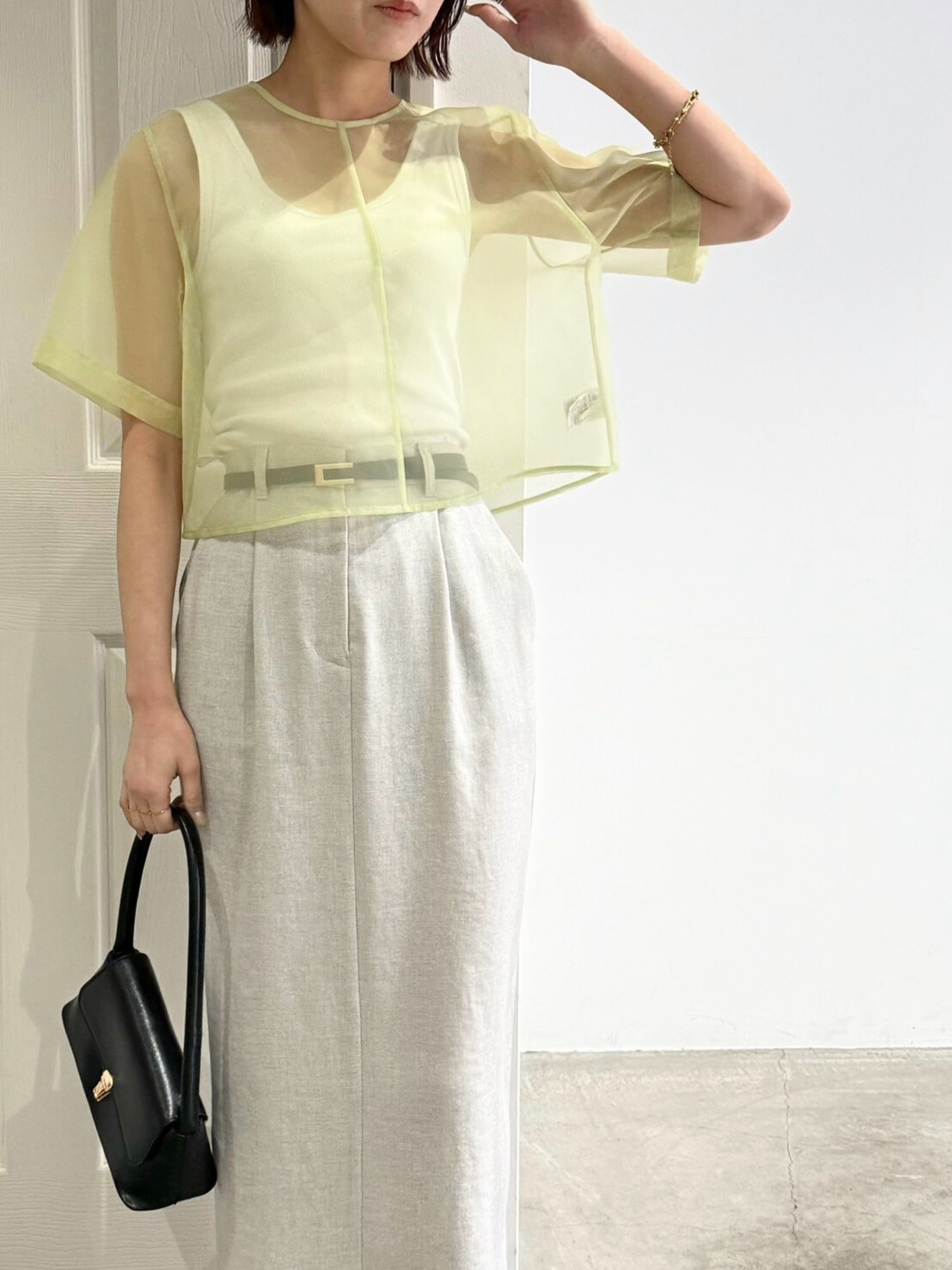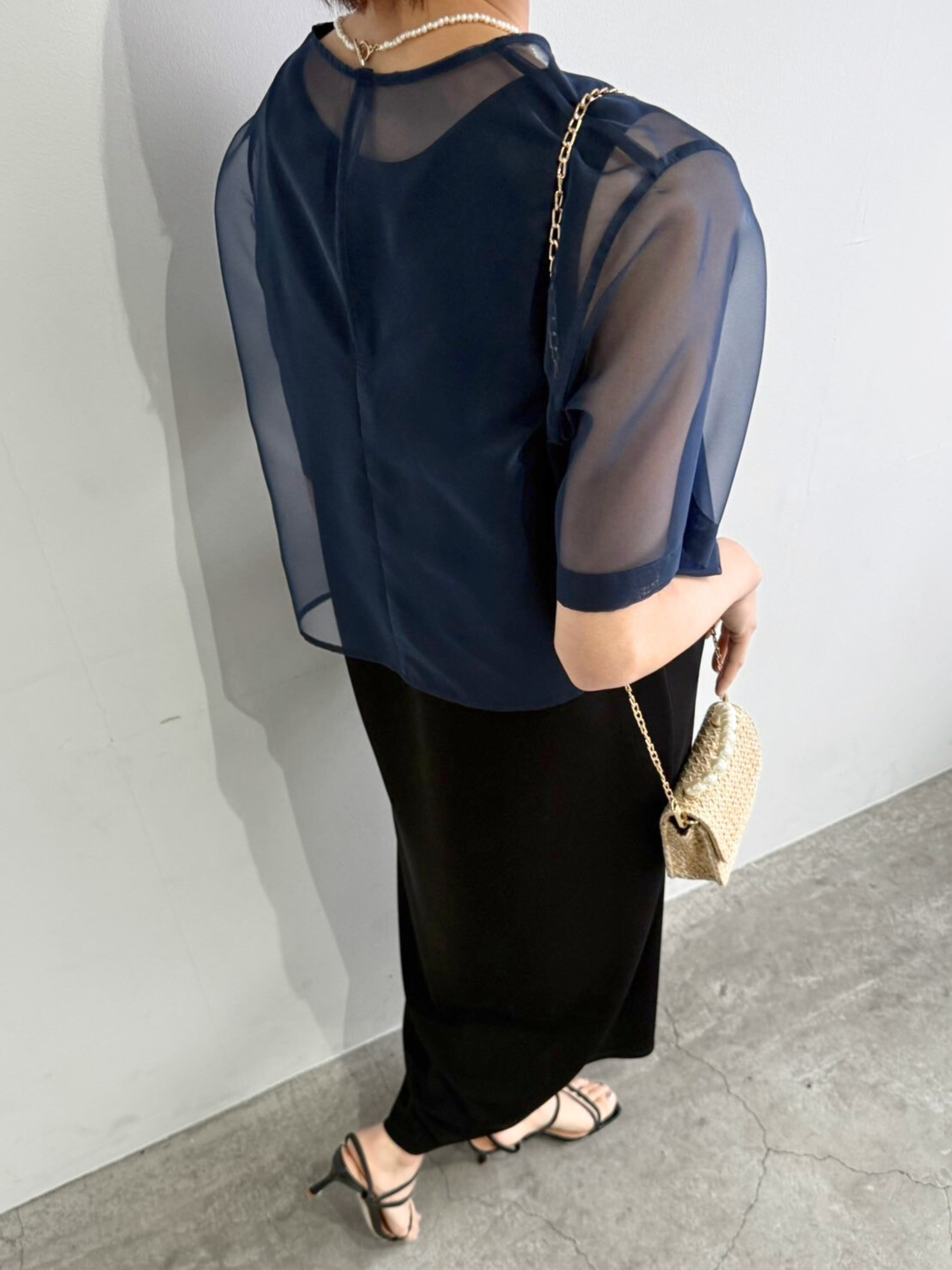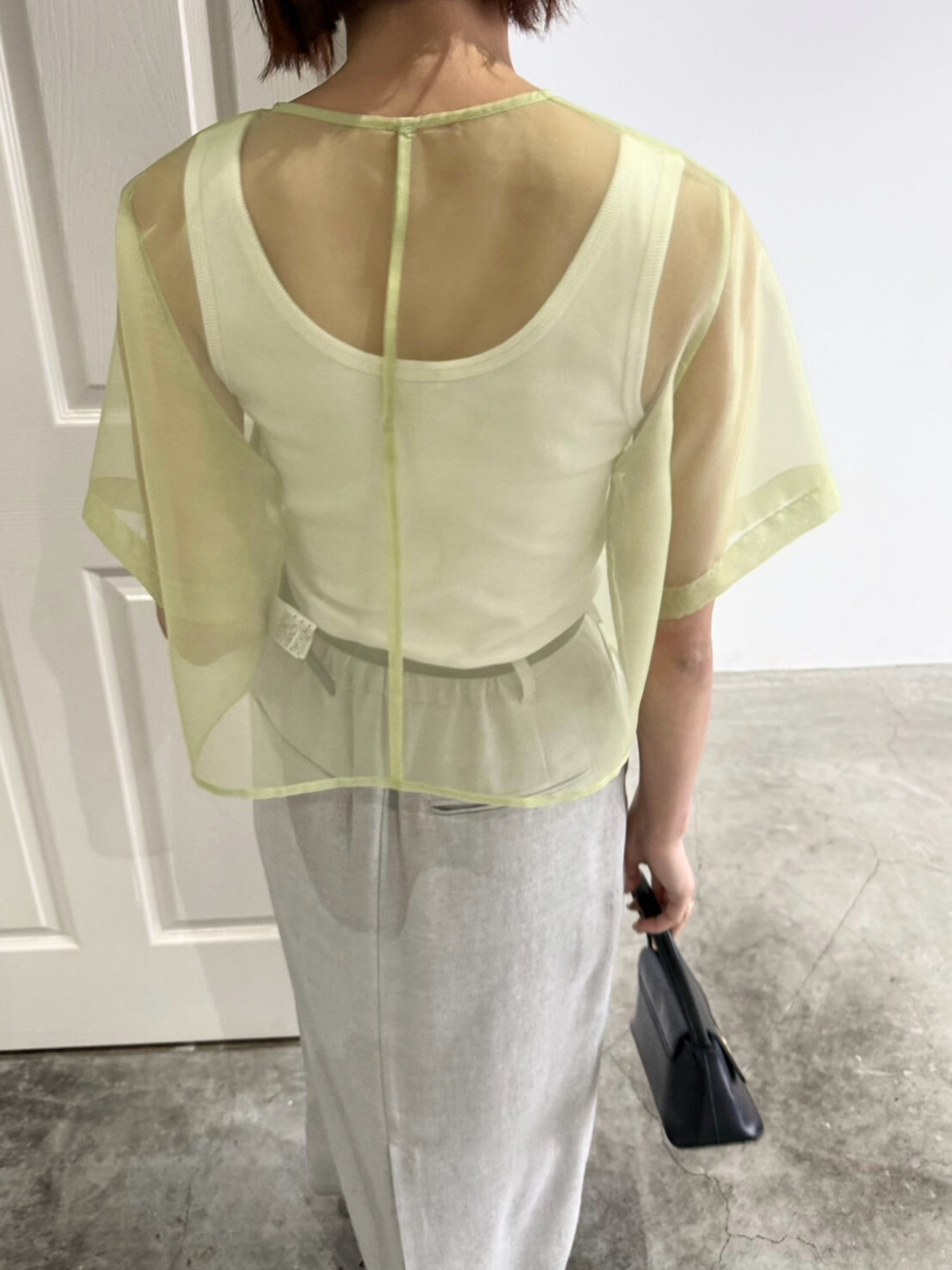 使い勝手の良いショート丈シアーブラウス。マットな光沢のオーガンジー素材はシフォンとオーガンジーの中間のような柔らかな⾵合いが特徴です。ロゴTの上にレイヤードしたり、華奢なキャミソールやベアトップに合わせて⼥性らしいレイヤードスタイルを楽しめる⼀枚。オケージョンシーンなどお呼ばれコーディネートとしても活躍してくれそうな一枚です✦*