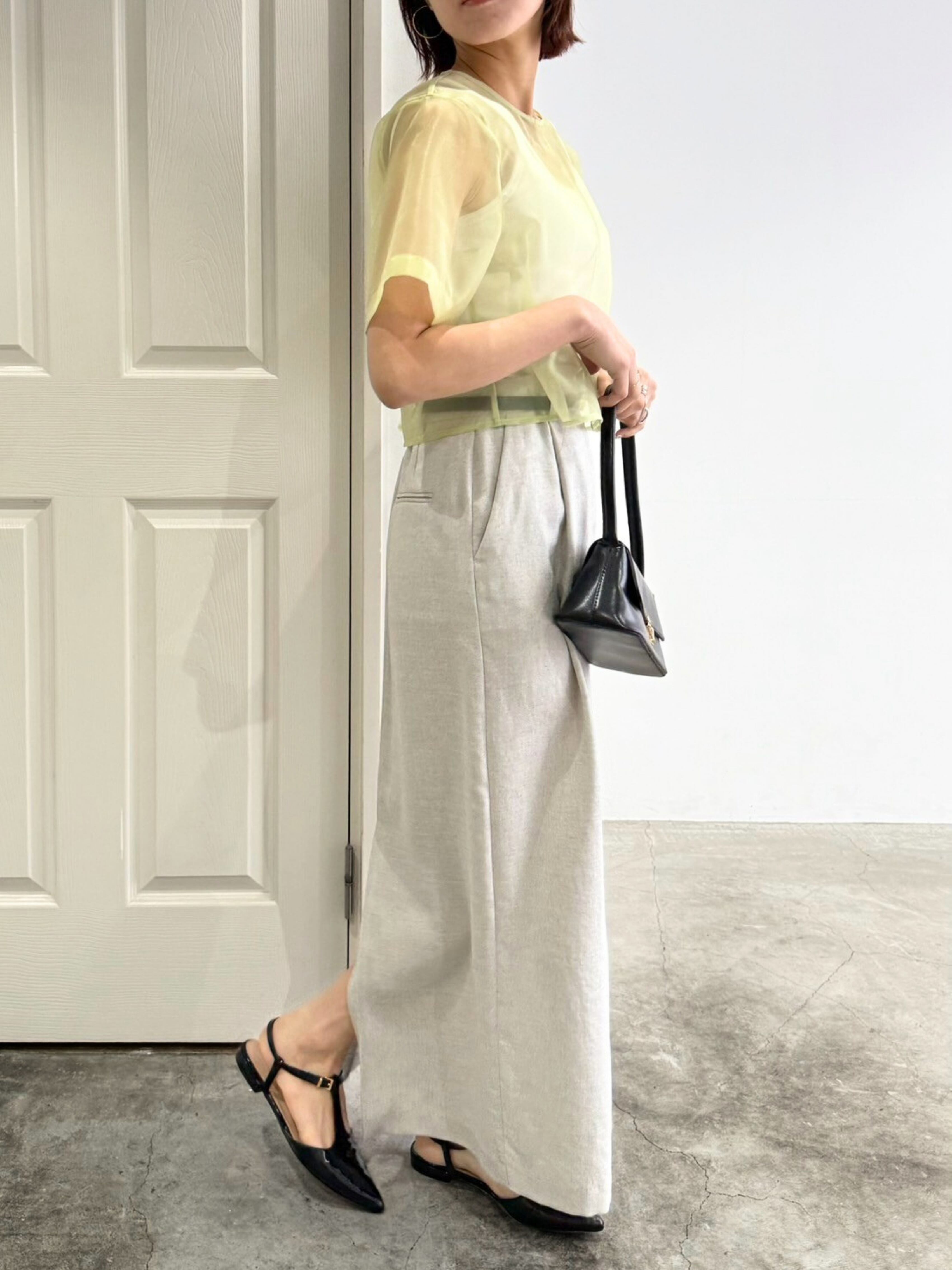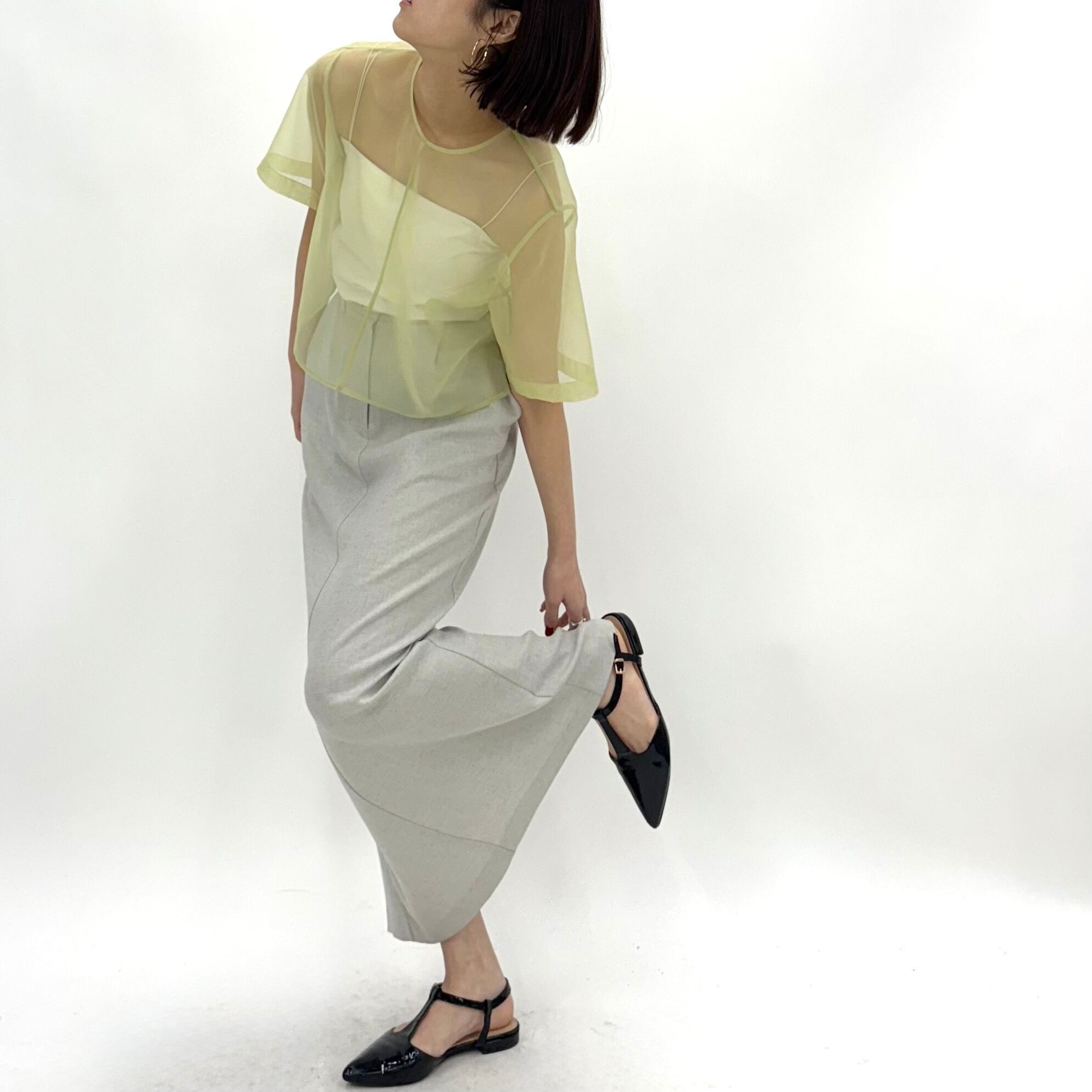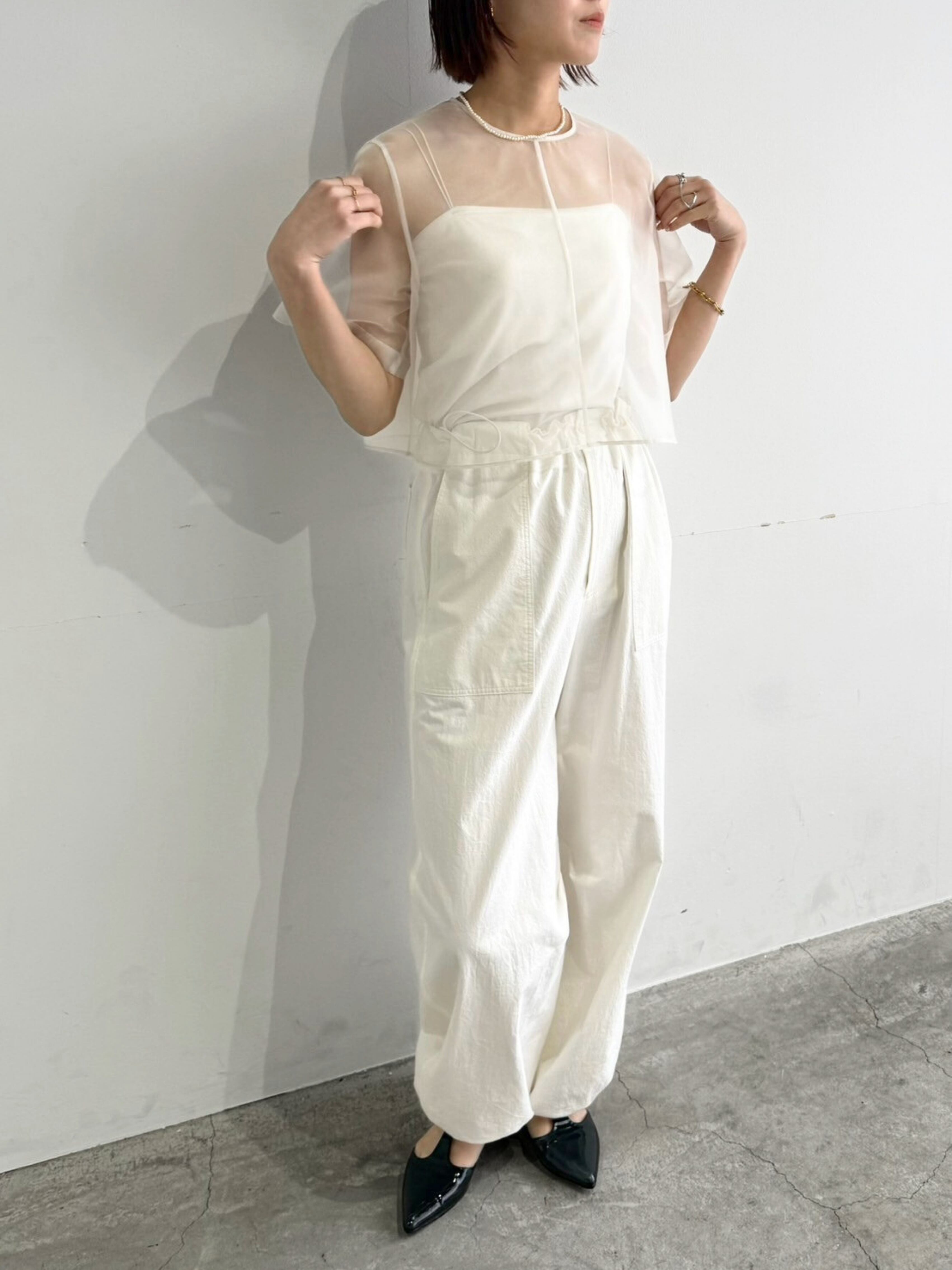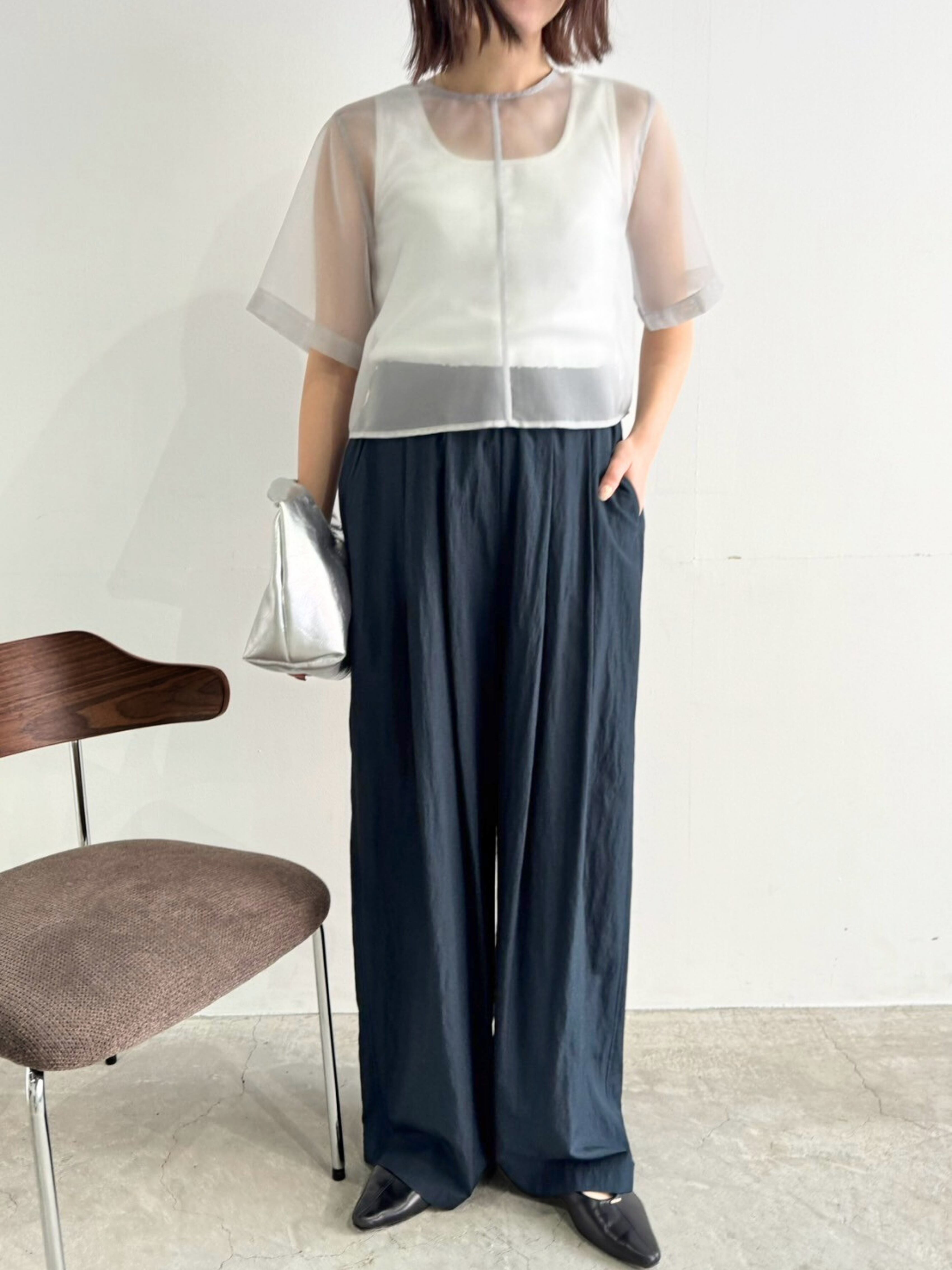 使い勝手の良いショート丈シアーブラウス。マットな光沢のオーガンジー素材はシフォンとオーガンジーの中間のような柔らかな⾵合いが特徴です。ロゴTの上にレイヤードしたり、華奢なキャミソールやベアトップに合わせて⼥性らしいレイヤードスタイルを楽しめる⼀枚。オケージョンシーンなどお呼ばれコーディネートとしても活躍してくれそうな一枚です✦*